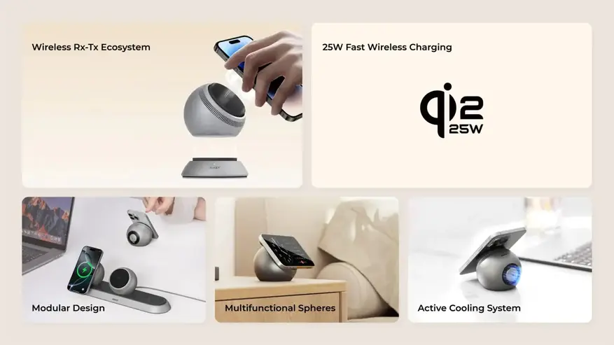 AUKEY продемонстрировал MagFusion Ark — первое модульное беспроводное зарядное устройство. База поддерживает до трех съемных магнитных сфер с технологией Qi2.2 мощностью 25 Вт. Каждая сфера содержит аккумулятор на 6700 мАч, охлаждающий вентилятор и двунаправленный порт USB-C мощностью 30 Вт. Отсоединенная от базы сфера функционирует как автономное портативное зарядное устройство, поддерживающее как беспроводную, так и проводную зарядку. Система также обеспечивает сквозную зарядку и возможность одновременной зарядки двух устройств через беспроводное соединение (15 Вт) и USB-C (20 Вт).