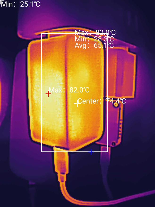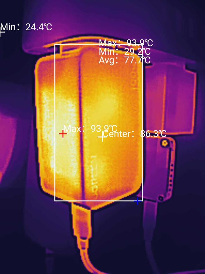 На 30 минуте нагрев корпуса в самой горячей точке был 75,3⁰С (средняя температура выделенного прямоугольника — 66,4⁰С). На этой минуте сила тока упала в два раза, напряжение осталось около 19,3V. Я подождал 13 минут и продолжил тест. Через десять минут, на сороковой минуте теста, максимальная температура области составила 82⁰С (средняя — 65,1⁰С), сила тока упала, я опять дал остыть зарядке X757. На 60 минуте максимальное значение уже было — 86,2⁰С (среднее — 71,5⁰С), думал, что сейчас все повторится, но нет. На 70 минуте максимальная температура, что называется, внимание, составила 93,9⁰С (средняя — (три топора) 77,7⁰С), после которых Ugreen X757 вообще сбросил напряжение. Я думал подождать, пока температура корпуса не станет ниже 70⁰С, но дальнейший тест большого смысла уже не имел, так как обозреваемая нагревается, заявленные технологии меньшего нагрева GaNInfinity и безопасного заряда Thermal Guard работают, но не спасают. Как сказал выше, физику не обманешь. Удивительно, что зарядка не взорвалась при температуре 93,9⁰С. Возможно, от такой участи спасли технологии Ugreen, GaNInfinity и Thermal Guard.