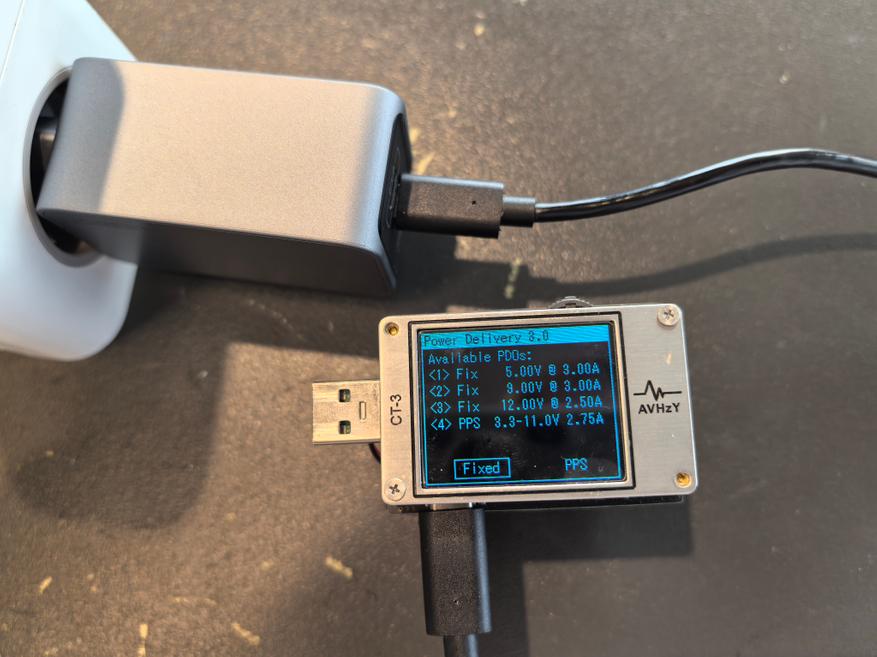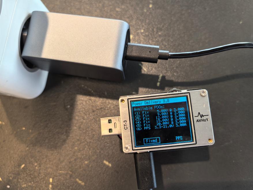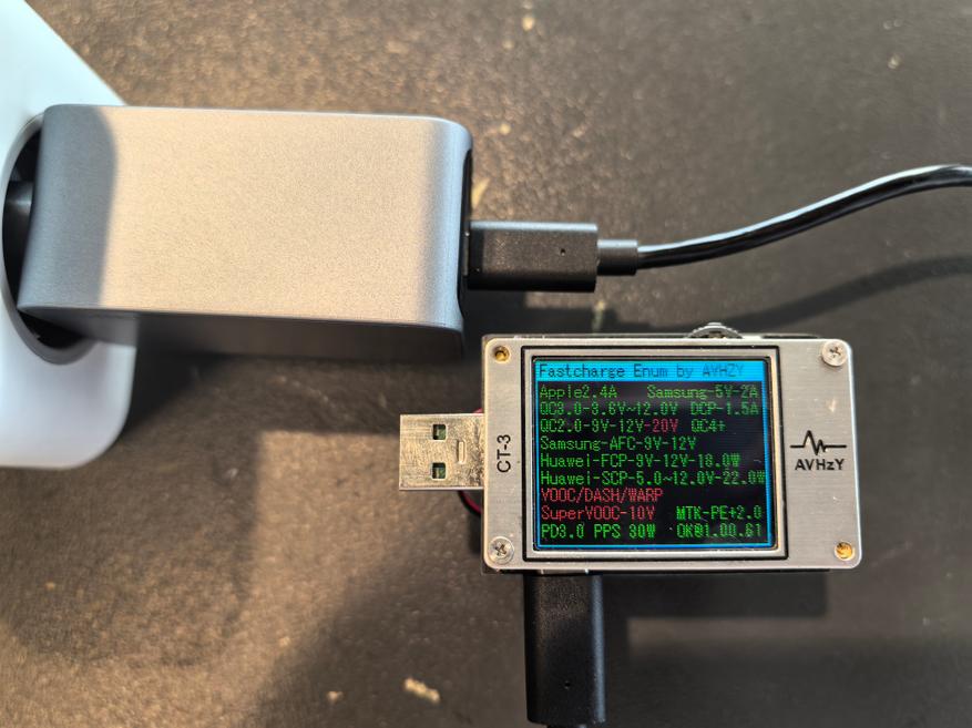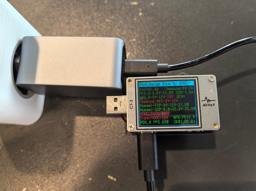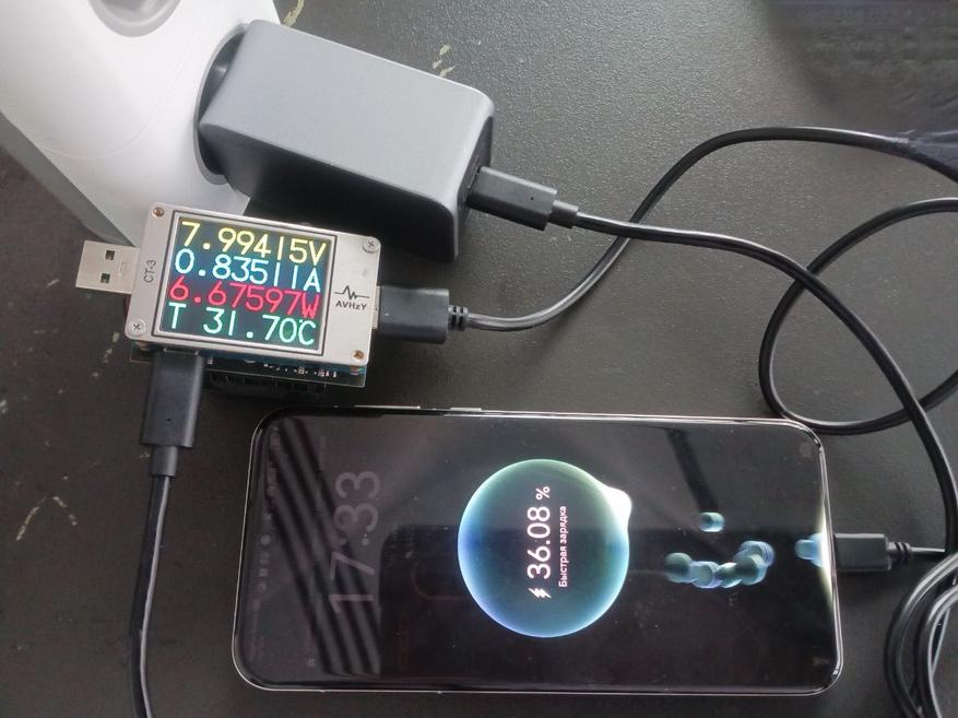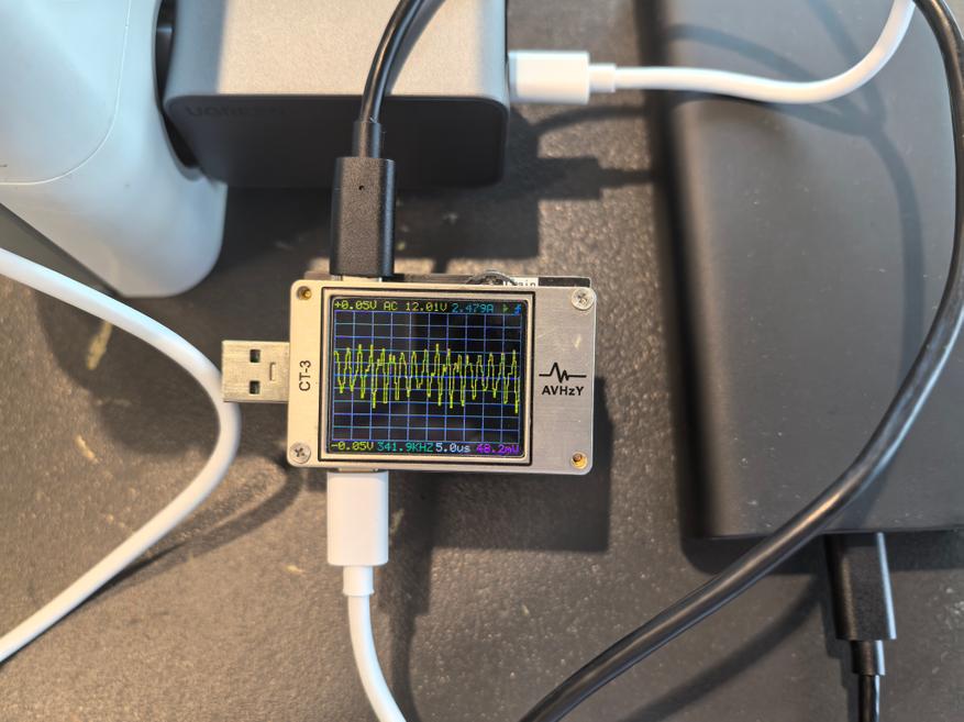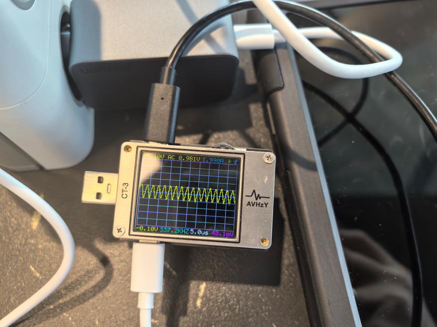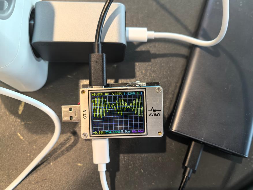 Пульсации оцениваются при помощи тестера AVHzY CT-3, как наиболее точного в этом плане устройства. В качестве нагрузки для оценки пульсаций выступают реальные потребители (внешние аккумуляторы и смарт-часы) на каждом из портов и по напряжениям 5, 9 и 20 В при близких к максимальным значениям силы тока по каждому.