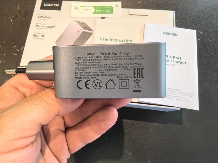 На следующих фотографиях обозреваемая модель X757 показана в сравнении с другими зарядными устройствами разных брендов — на первой с 65W четырехпортовая Ugreen CD224, на втором со 100W четырехпортовая Ugreen CD226.