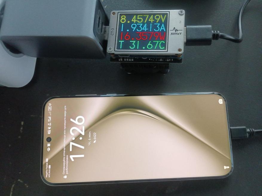 На следующих фотографиях показано, что протокол Huawei SCP работает на каждом выходе из трёх. В таком же режиме, но через 65W ЗУ Ugreen CD224 я заряжал свой HUAWEI P50 Pro. В случае Ugreen X757 заряд своего смартфона на Huawei SCP позволит использовать дополнительные 65W из USB-C1, к примеру для питания ноутбука, как Ninkear N14 Pro (обзор здесь). Для заряда ноутбука одновременно с телефоном обозреваемая модель мне подойдёт. Мощности для двух устройств хватит и не будет таких больших температур.