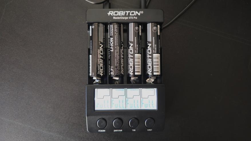 Тестирование аккумуляторов я проводил с использованием зарядного устройства Robiton MasterCharger 4T5 Pro. Перед испытаниями элементы были полностью заряжены и разряжены — по сути, это второй цикл после активации, когда внутренняя химия уже стабилизировалась. Токи по портам распределил так: 2000, 1500, 1000 и 500 мА на заряд, и соответственно 1000, 800, 600 и 400 мА на разряд. Температура — комнатная, без дополнительного охлаждения. Контроль делал визуально и тактильно: при 2 А корпус нагревается ощутимо, до примерно 38-40 °C, но без перегрева. На малых токах элементы остаются холодными.