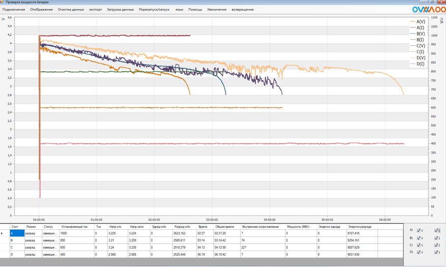 Далее я приступил к разряду аккумуляторов. Результаты тестирования таковы: