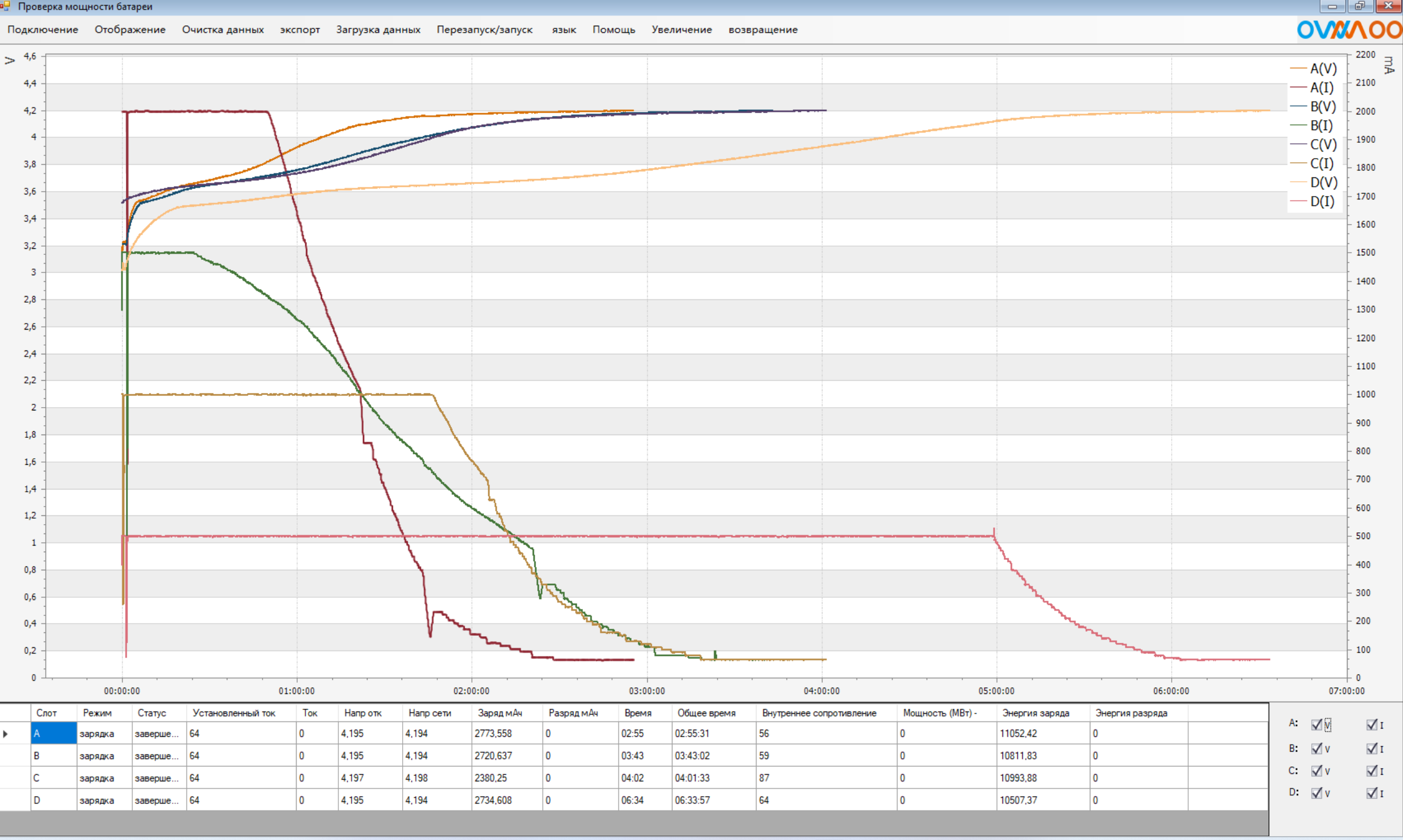 Форма кривых типичная для литий-ионных ячеек: участок постоянного тока с плавным ростом напряжения и фаза постоянного напряжения, где ток постепенно снижается почти до нуля. Переход между ними ровный, без срывов или внезапных падений. Однако уже здесь видно, что элементы немного отличаются по динамике. У портов A и B фаза CV короче, а у C заметно растянута — заряд затягивается, кривая выравнивается ближе к концу. На D (0.5 А) процесс самый спокойный, но самый долгий — более шести часов.