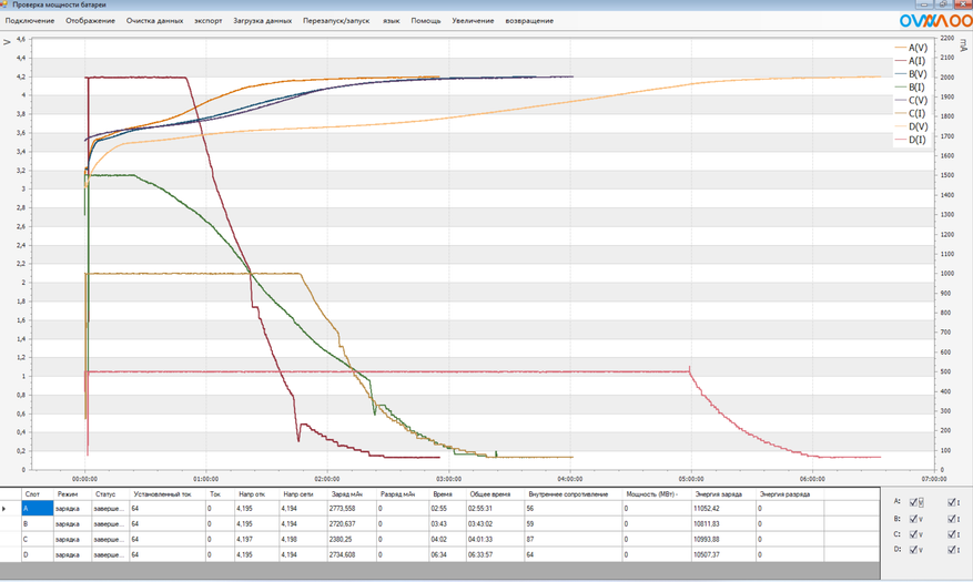 Разброс по емкости между каналами составил около 4%. Аккумуляторы приняли от 2686 до 2773 мАч, то есть фактически превысили номинал в 2600 мАч. Даже при токе 2 А переход в фазу CV прошел корректно, без перегрева, что говорит о том, что элемент способен выдерживать зарядку в районе 0.7-0.8С.