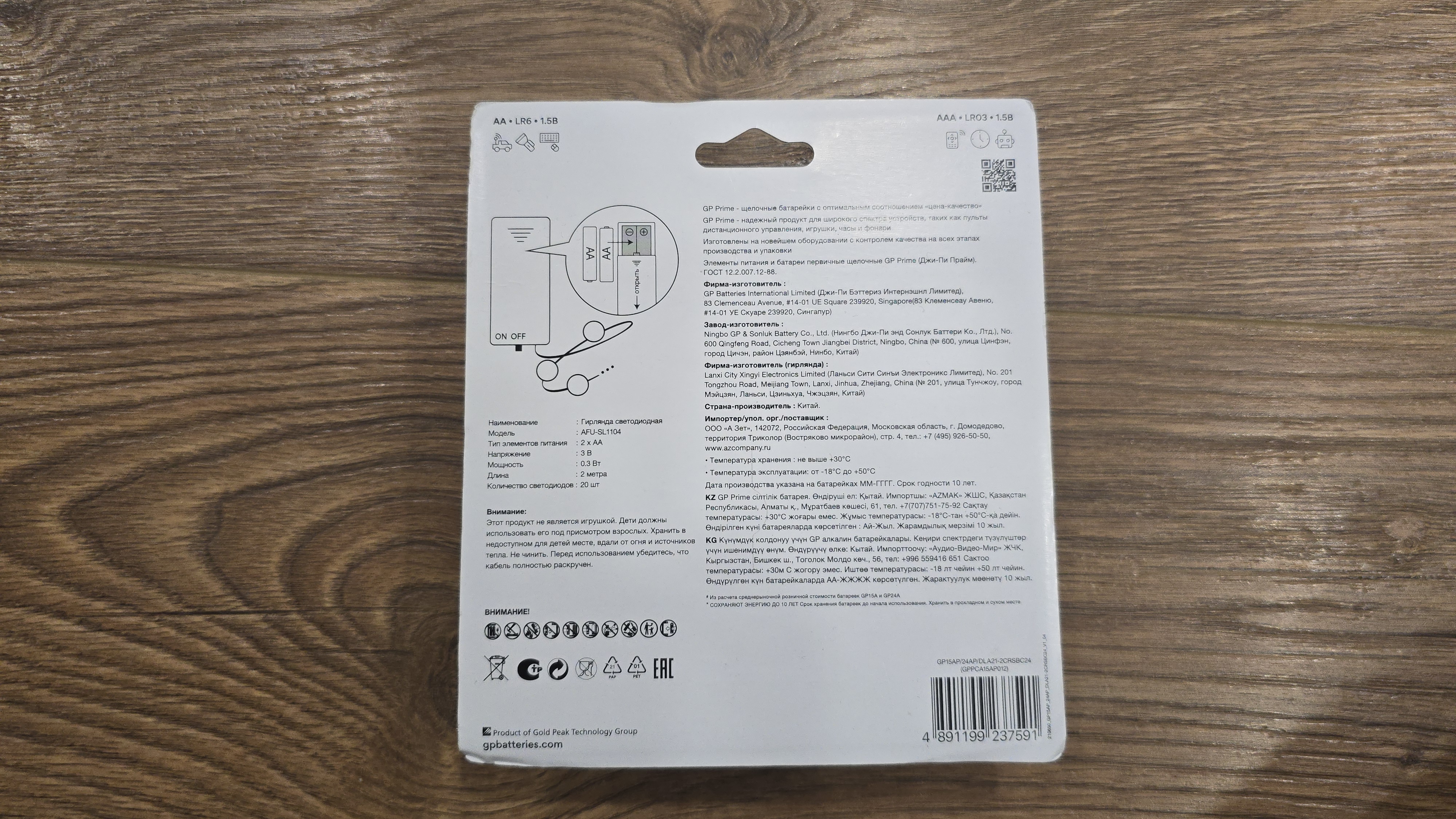 Как уже говорил, в комплекте находится 24 алкалиновые батарейки GP Prime, из них 12 типоразмера AA и 12 типоразмера AAA. Все элементы разложены в двух отдельных ячейках и зафиксированы. Также в комплекте идет светодиодная гирлянда на тонком проводе с отдельным батарейным блоком.