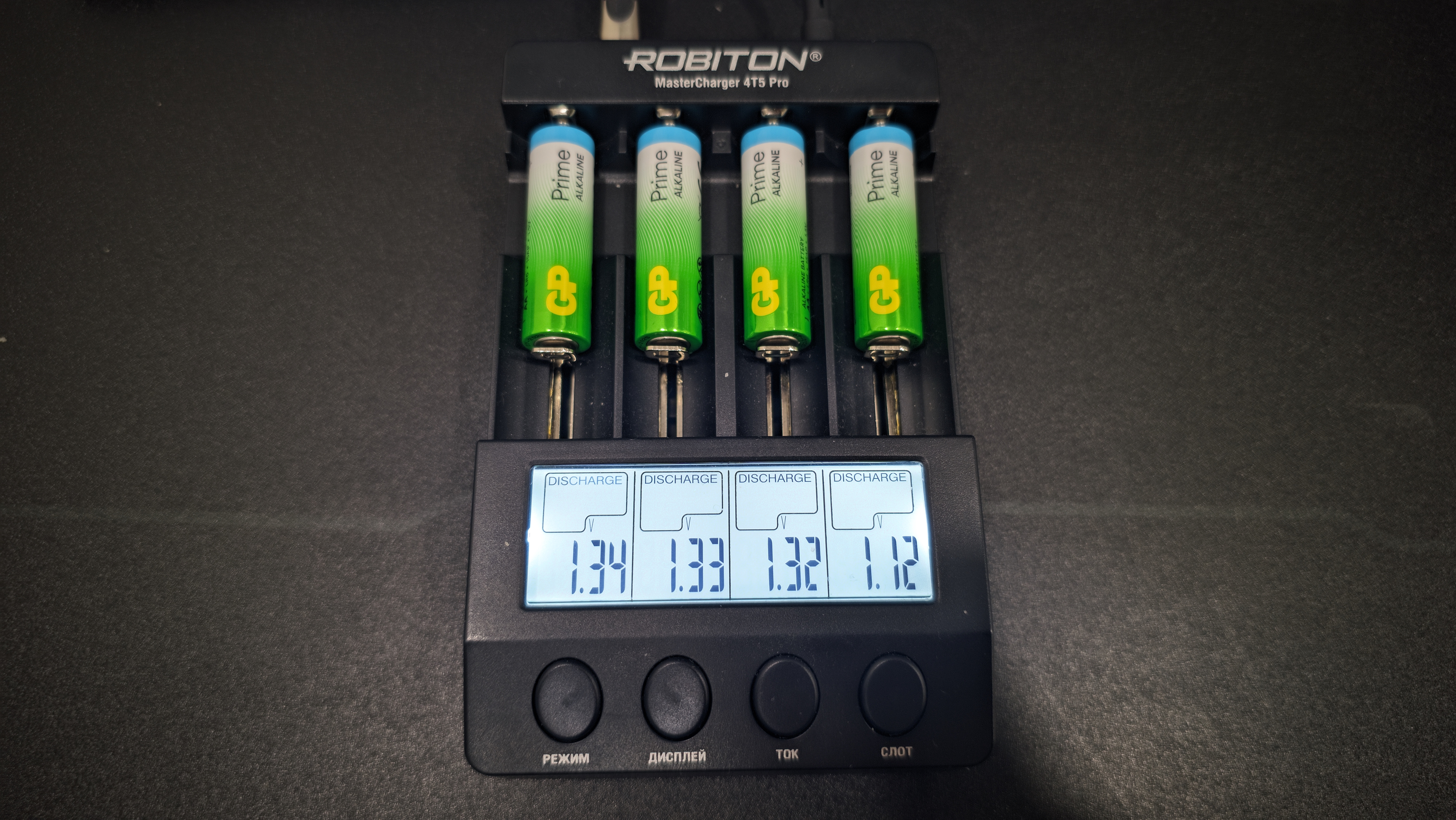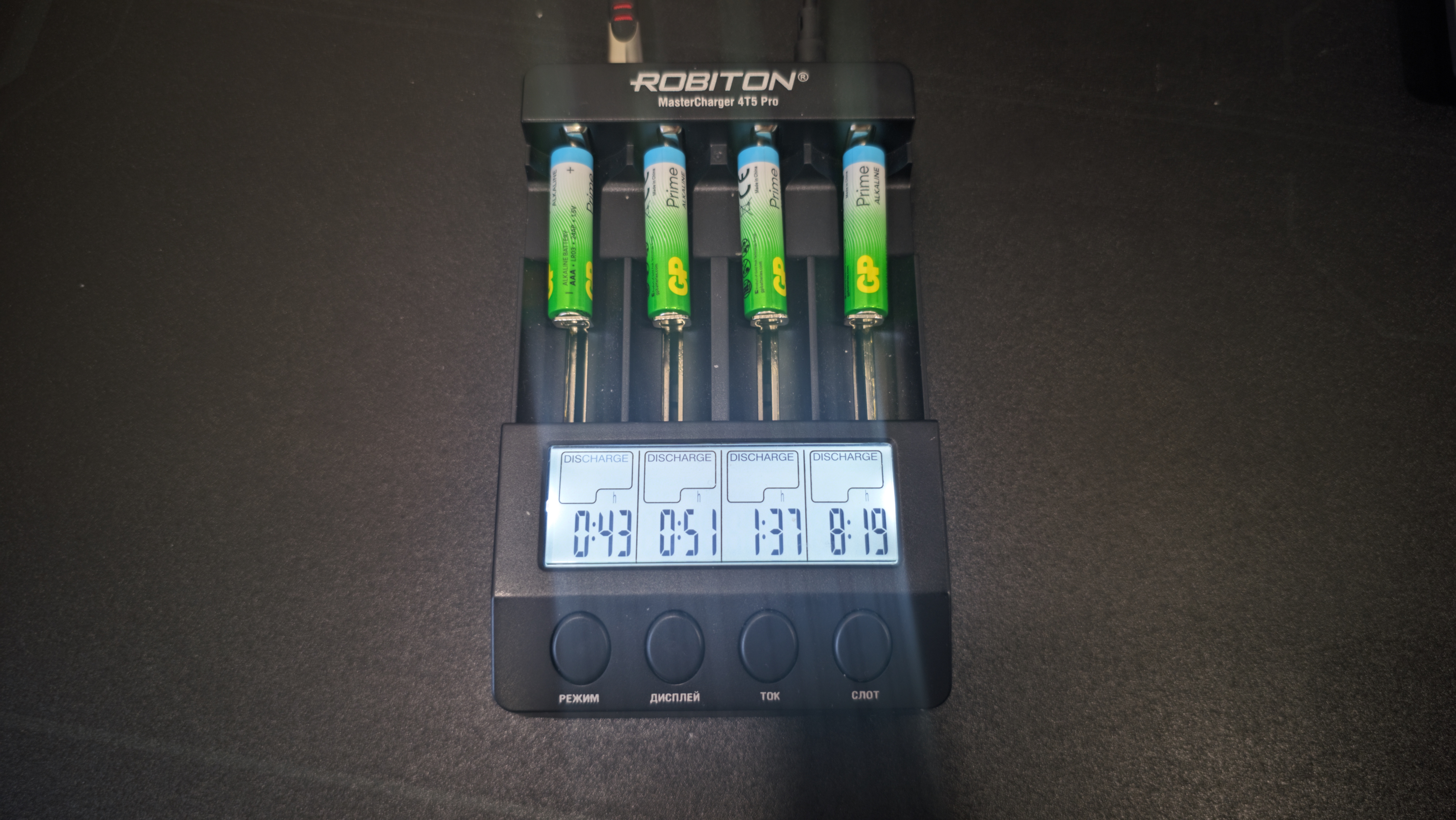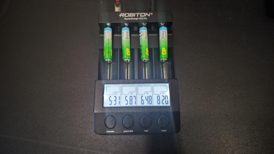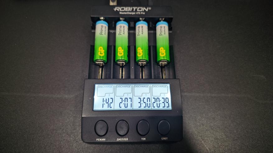 Все замеры я проводил на зарядном устройстве Robiton MasterCharger 4T5 Pro. Все батарейки тестировались в одинаковых условиях, без замены настроек и без корректировок по ходу процесса. Для разряда использовались четыре фиксированных тока — 1000, 700, 400 и 100 мА.