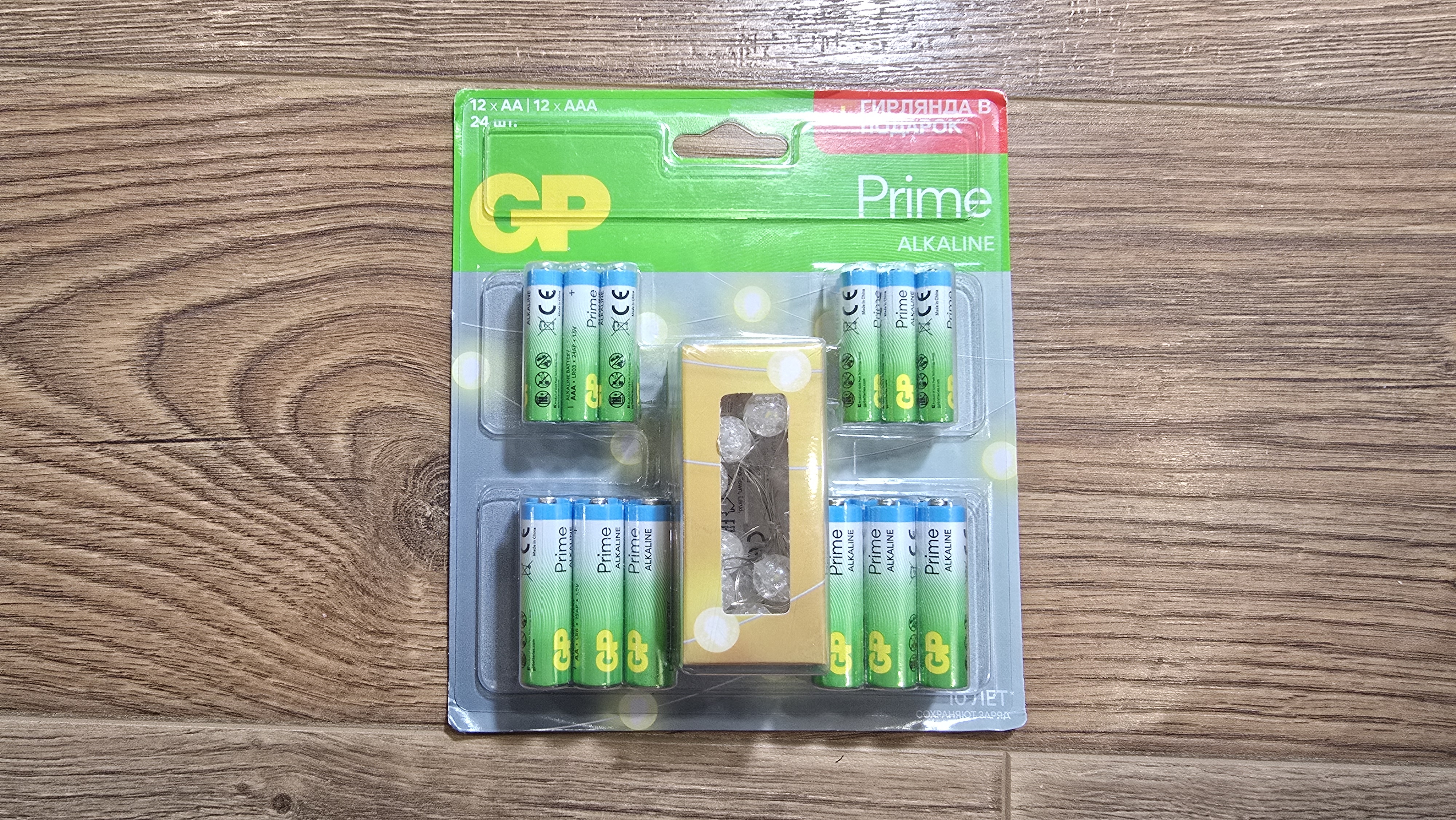 Упаковка комплекта имеет наборный характер. Это картонный блистер с прозрачным пластиковым кейсом, через который видно все содержимое без вскрытия. На упаковке отмечено, что это комплект GP Prime Alkaline, и комплект содержит 12 батареек AA и 12 AAA, а также, в качестве подарка — гирлянда.
