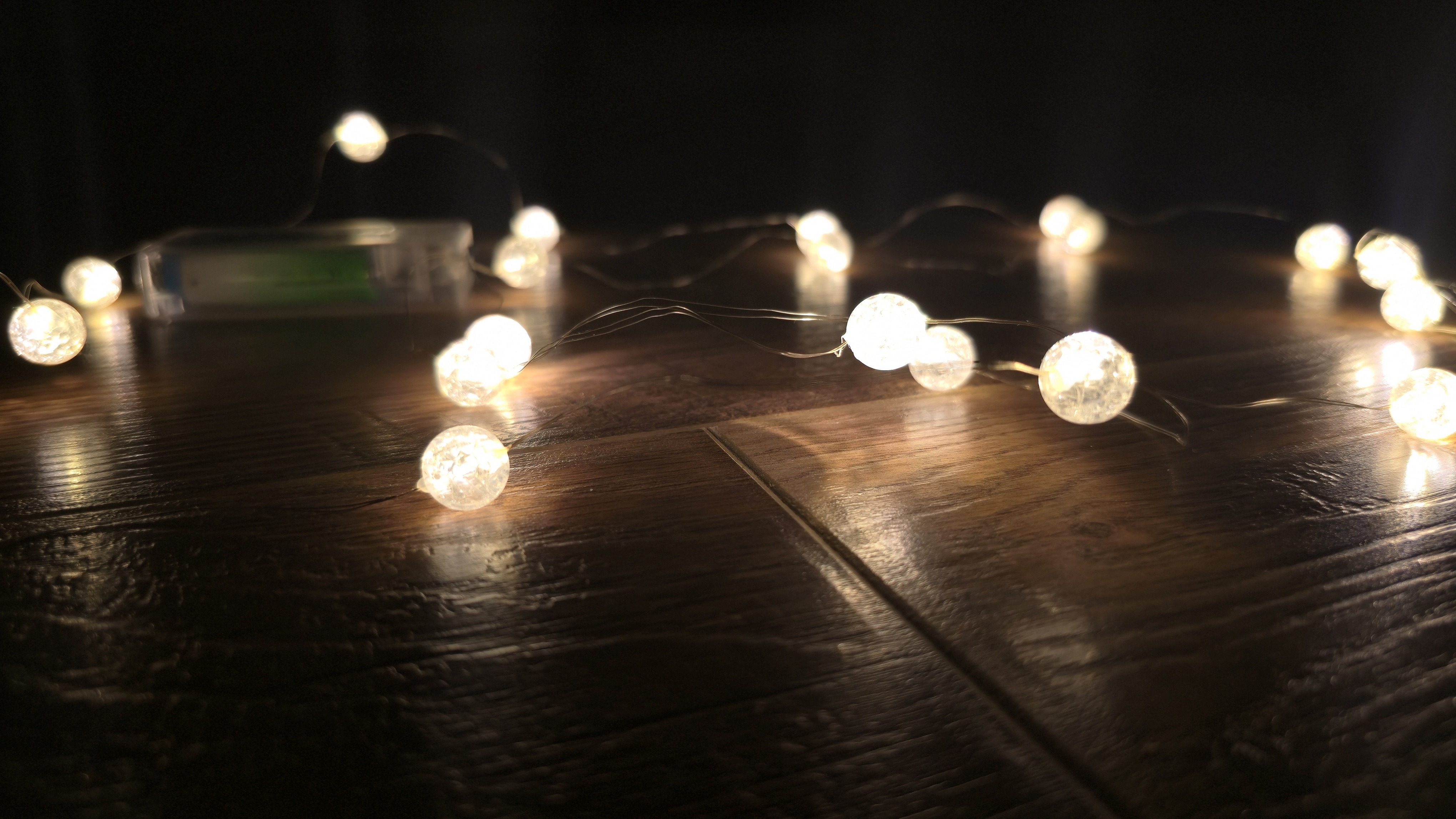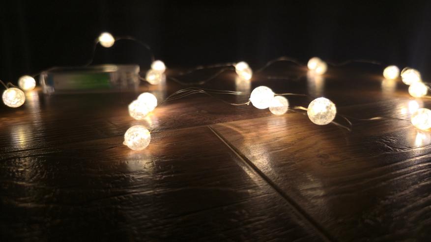 Гирлянда выполнена на тонком, почти незаметном проводе, который легко гнется и принимает нужную форму. Светодиоды закрыты небольшими прозрачными шариками, за счет чего свет выглядит мягким и рассеянным. Батарейный блок компактный, пластиковый, с прозрачным корпусом. Внутри используются элементы питания формата AA. На корпусе блока размещен черный ползунок включения и выключения, без дополнительных режимов или индикации.