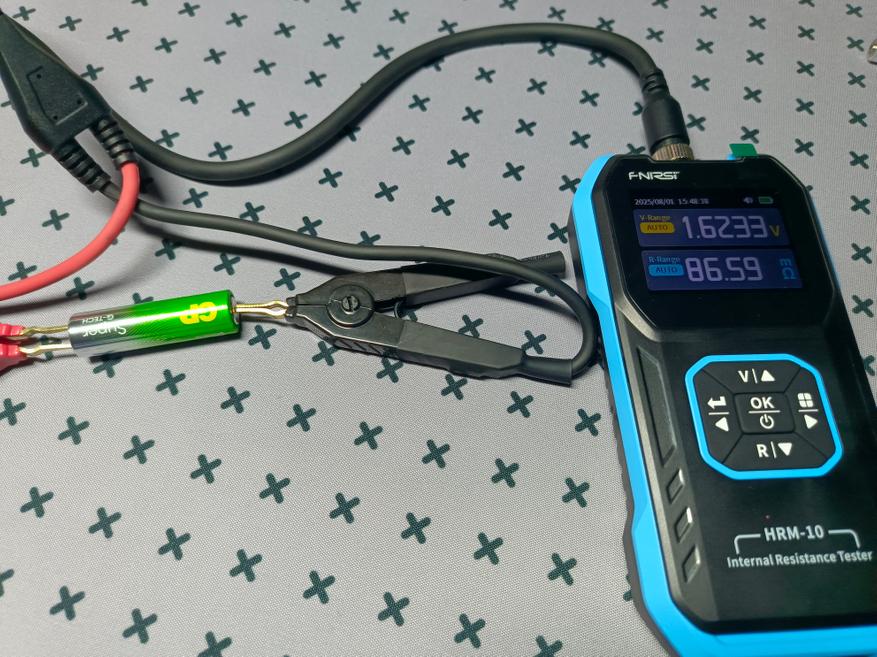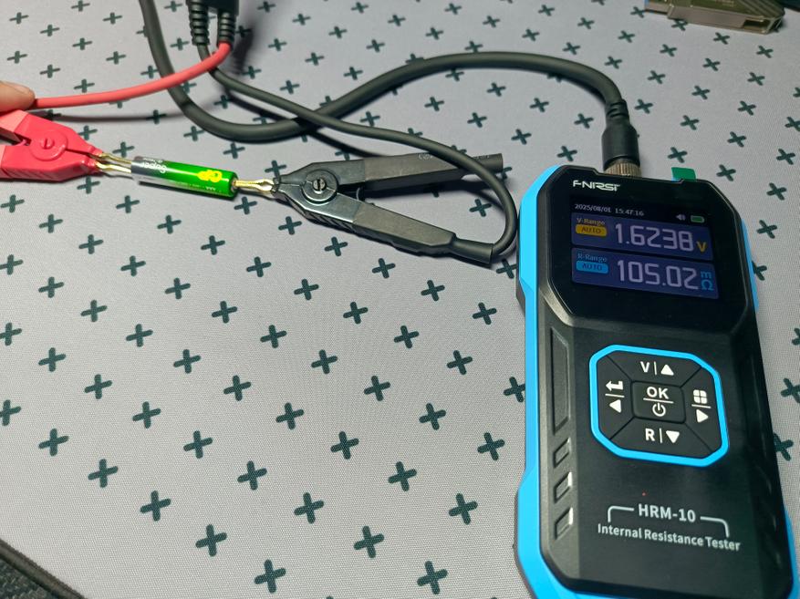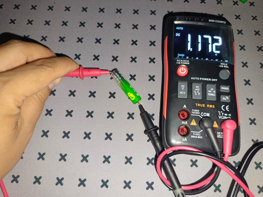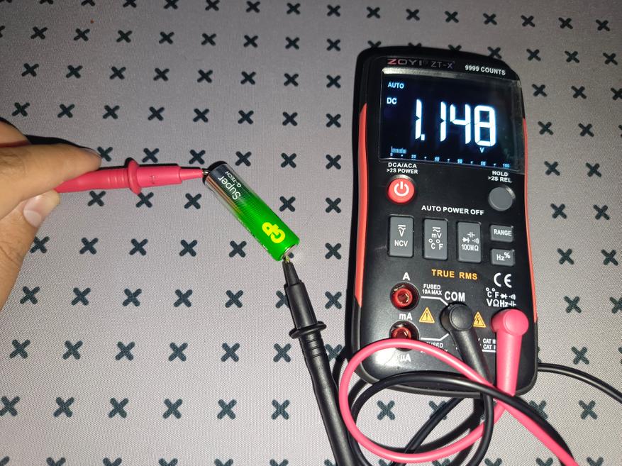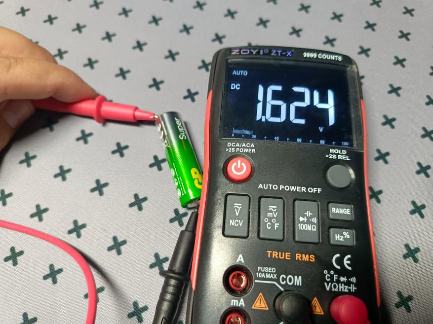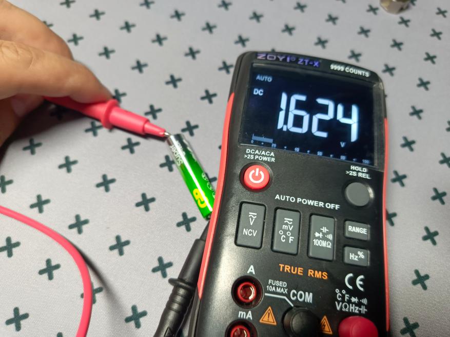 Второй тест — это напряжение из коробки. Батарейки полностью заряжены, даже немного свыше заявленных значений в 1,5 вольта. Я сравнил напряжение с другими батарейками из комплекта, и показания были одинаковы.