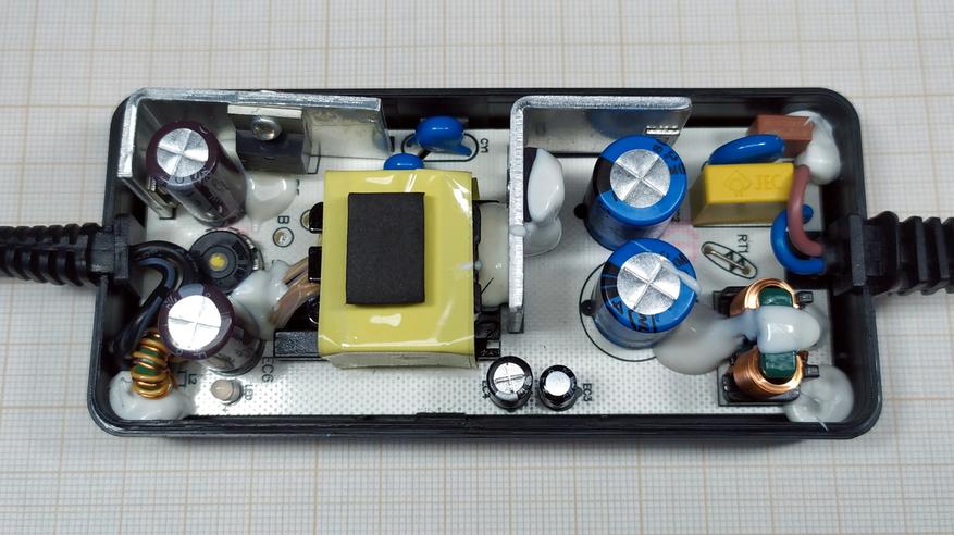 Корпус блока питания собран посредством ультразвуковой сварки. Плата внутри него не болтается поскольку зафиксирована защёлками и дополнительно, по углам, залита герметиком.