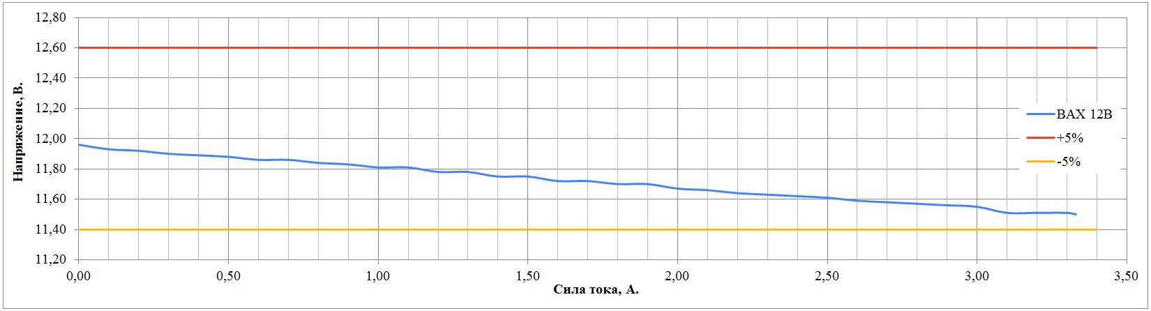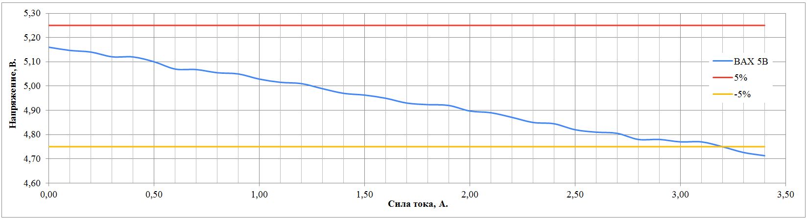 Во всех режимах работы, стабилизация выходного напряжения соответствует заявленному допуску в 5%. Просадка напряжения заметна только при превышении максимального тока нагрузки и лишь в режиме 5 В.