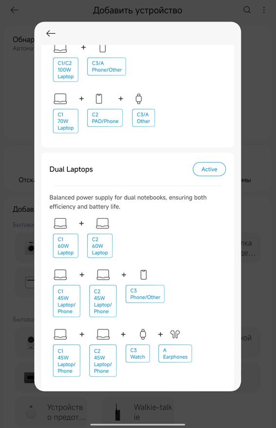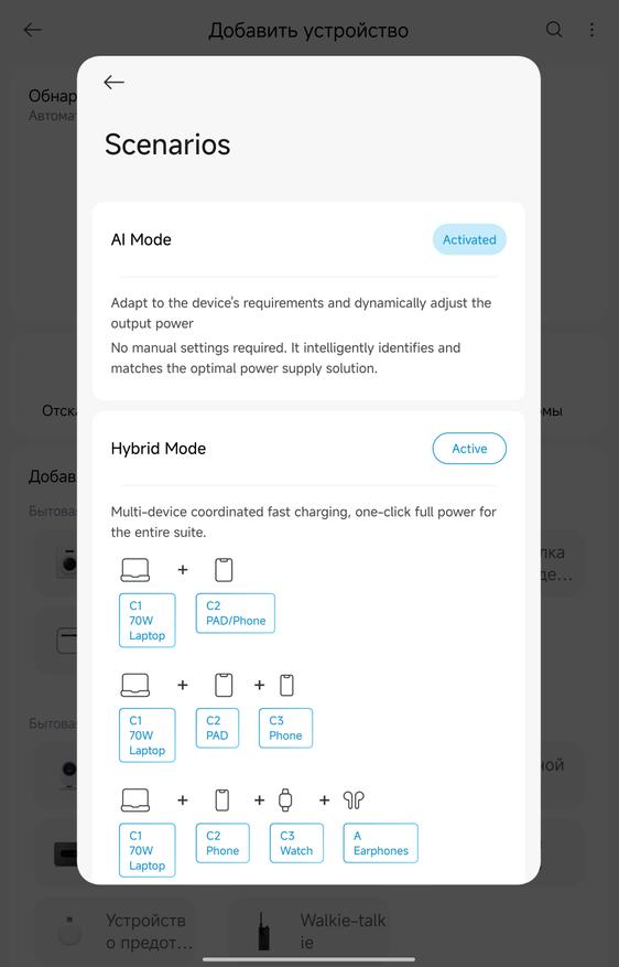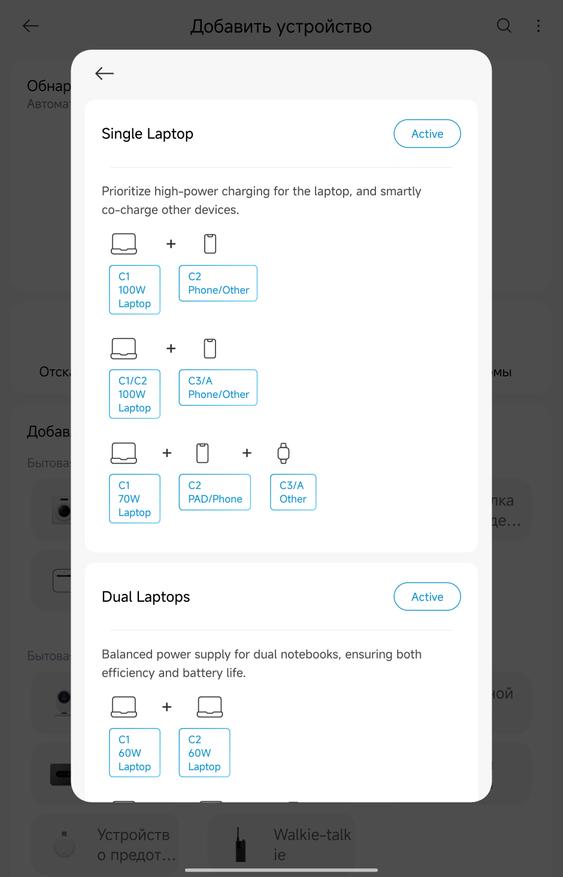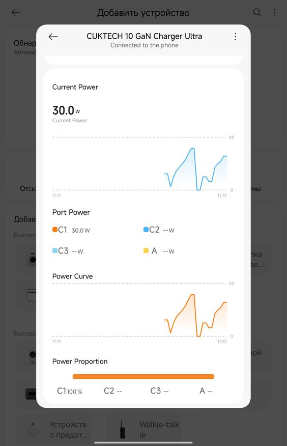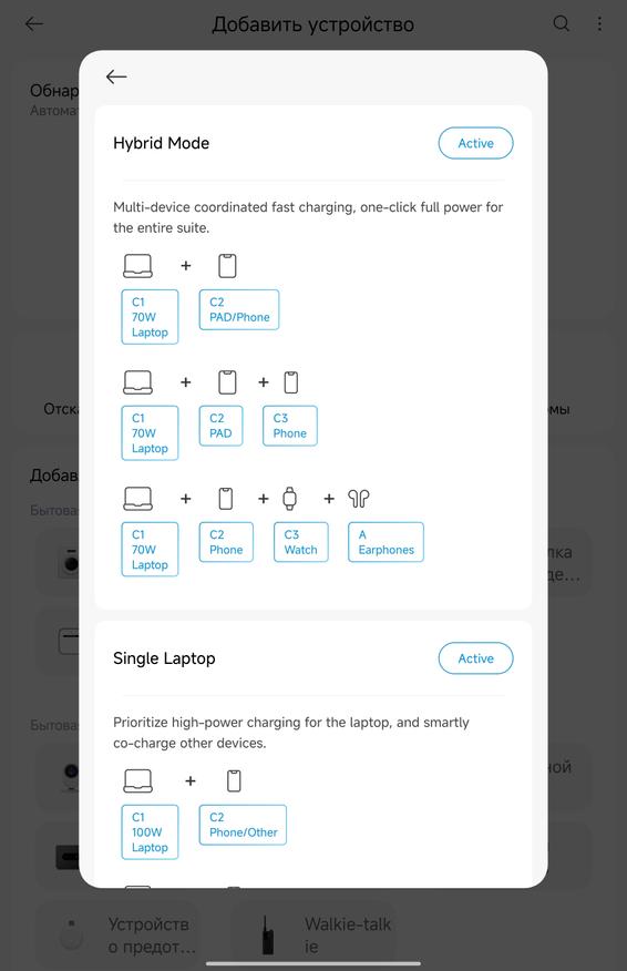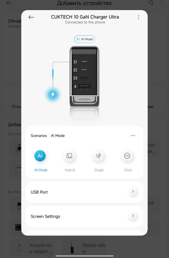 Приложение Xiaomi Home добавляет неожиданно полезный функционал. Зарядка определяется автоматически через Bluetooth, после чего открывается доступ к нескольким режимам работы. AI Mode (активен по умолчанию) — автоматически подбирает оптимальную мощность для каждого порта. Hybrid Mode — позволяет настроить приоритеты: например, выделить 70 Вт на ноутбук через C1, а остальное распределить между планшетом/смартфоном на C2. Single Laptop — отдаёт все 100 Вт одному ноутбуку на C1, остальные порты работают на минимуме. Dual Laptops — делит мощность поровну (60 Вт на C1, 60 Вт на C2) или в других комбинациях типа 45+45+остаток. Для большинства людей AI Mode справляется отлично, но если нужна точная настройка — приложение даёт полный контроль. Плюс там же можно регулировать яркость дисплея зарядки и таймер автоотключения экрана. Дополнительно зарядное рисует графики потребления.