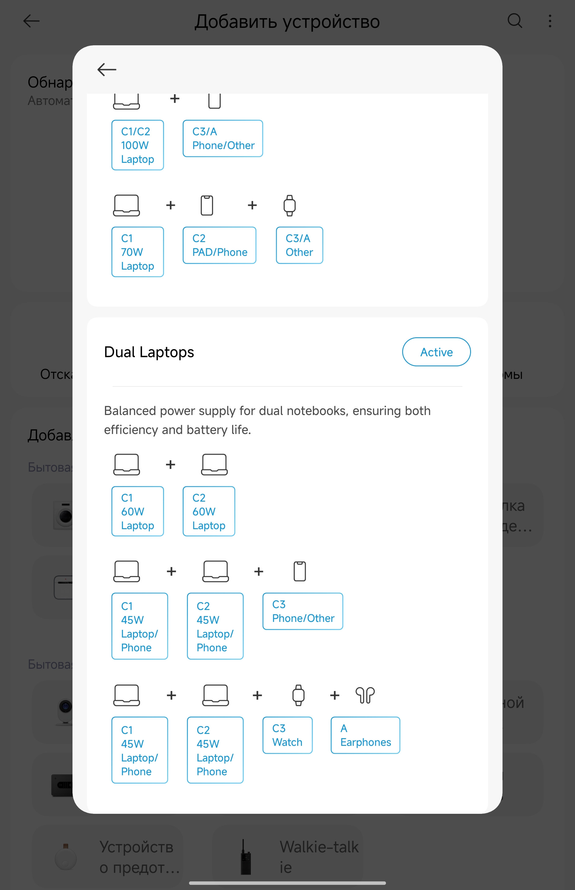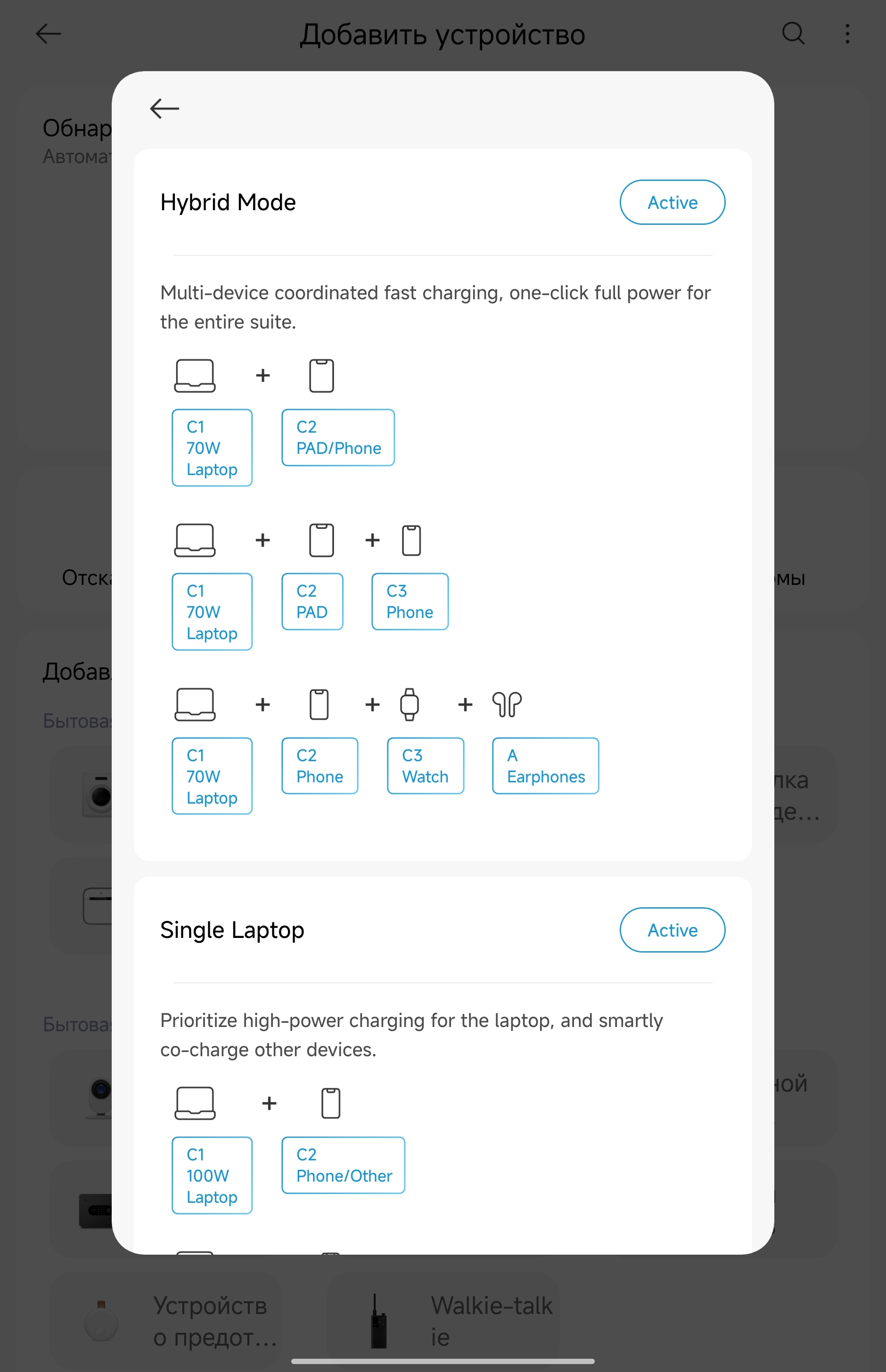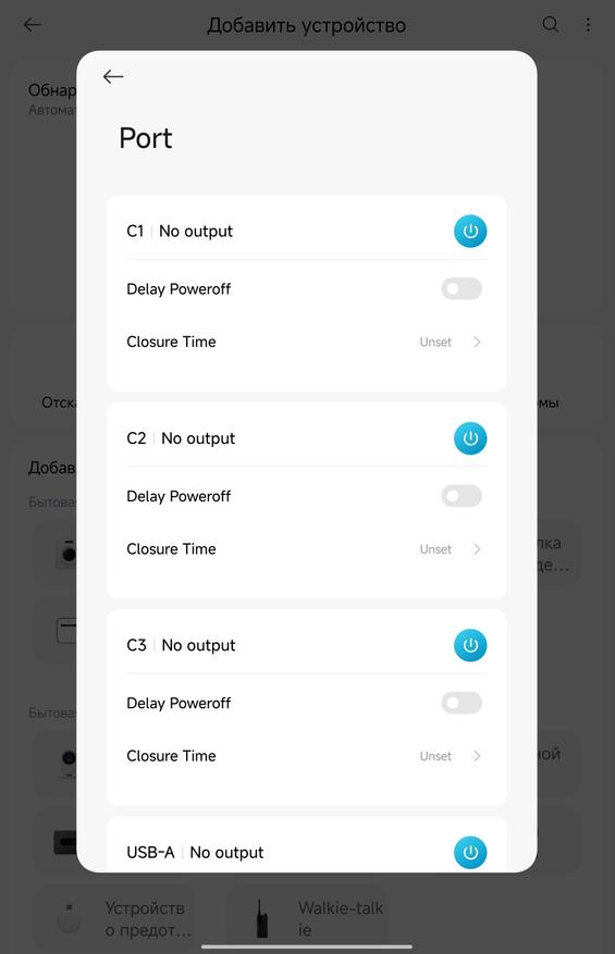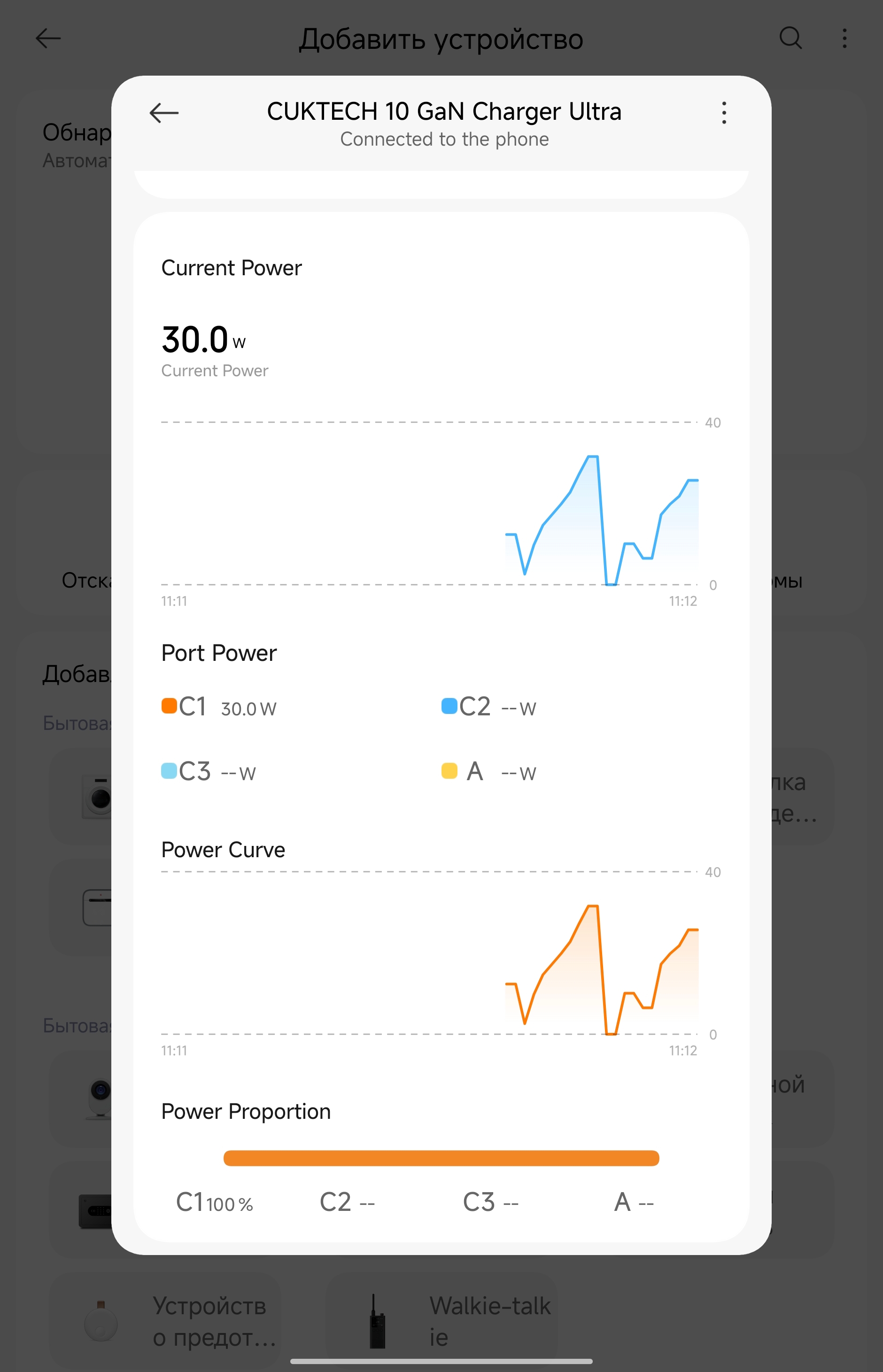 Приложение Xiaomi Home добавляет неожиданно полезный функционал. Зарядка определяется автоматически через Bluetooth, после чего открывается доступ к нескольким режимам работы. AI Mode (активен по умолчанию) — автоматически подбирает оптимальную мощность для каждого порта. Hybrid Mode — позволяет настроить приоритеты: например, выделить 70 Вт на ноутбук через C1, а остальное распределить между планшетом/смартфоном на C2. Single Laptop — отдаёт все 100 Вт одному ноутбуку на C1, остальные порты работают на минимуме. Dual Laptops — делит мощность поровну (60 Вт на C1, 60 Вт на C2) или в других комбинациях типа 45+45+остаток. Для большинства людей AI Mode справляется отлично, но если нужна точная настройка — приложение даёт полный контроль. Плюс там же можно регулировать яркость дисплея зарядки и таймер автоотключения экрана. Дополнительно зарядное рисует графики потребления.