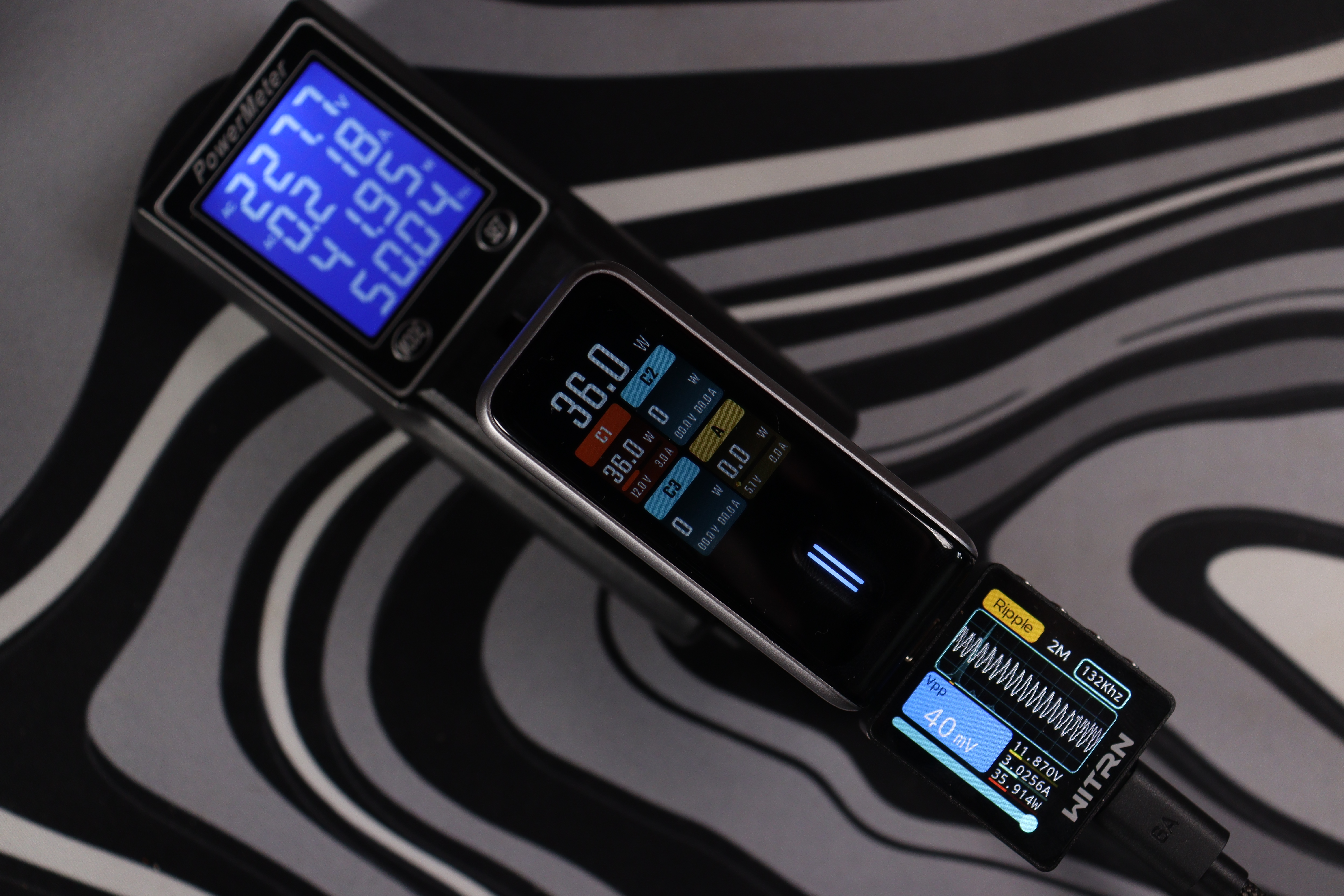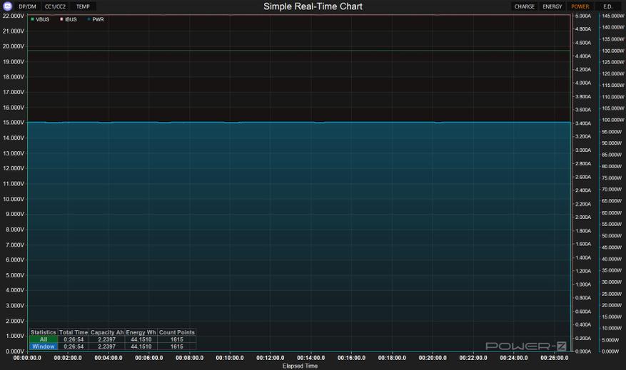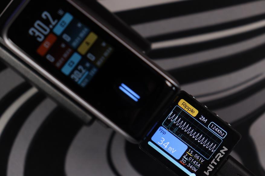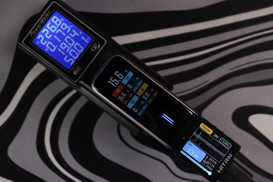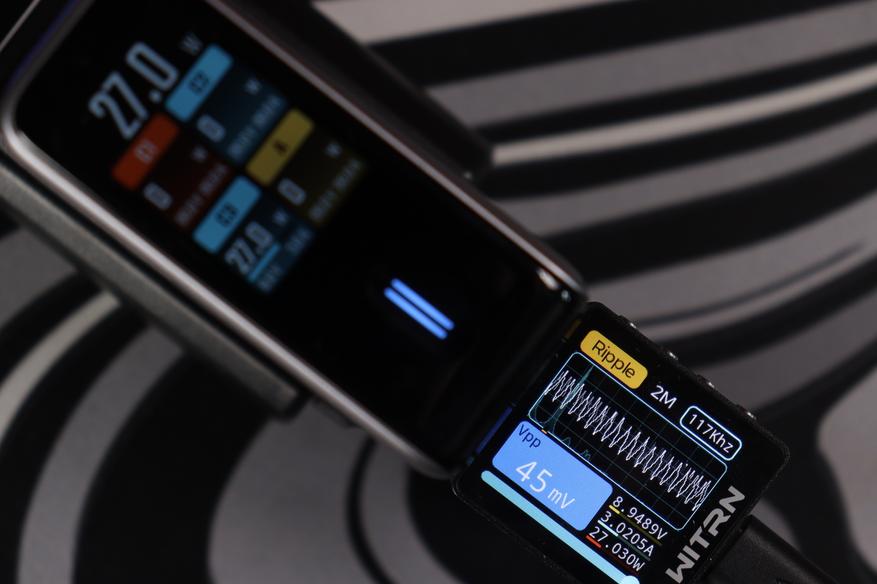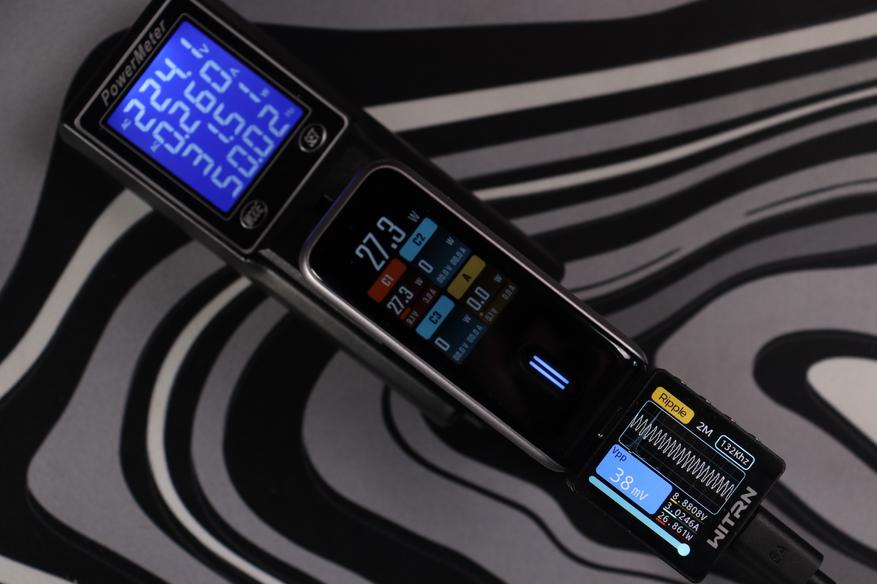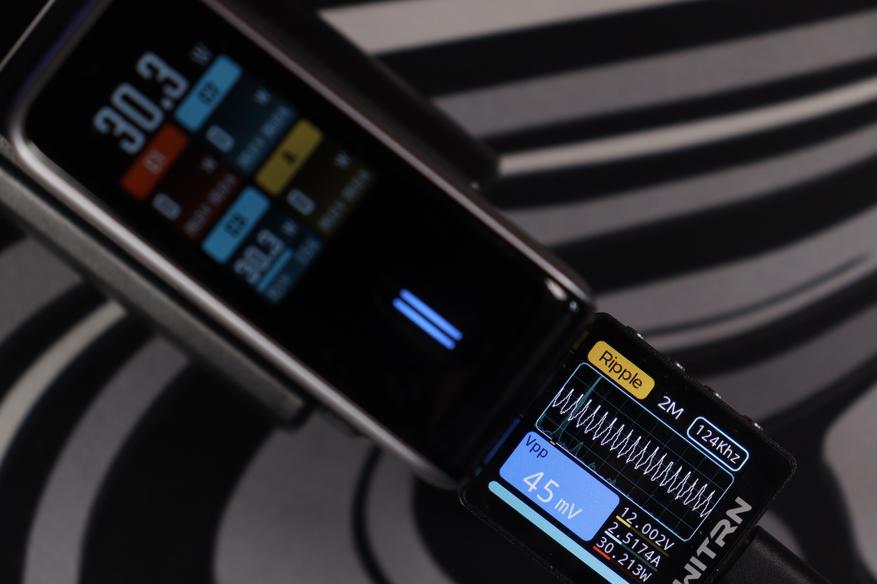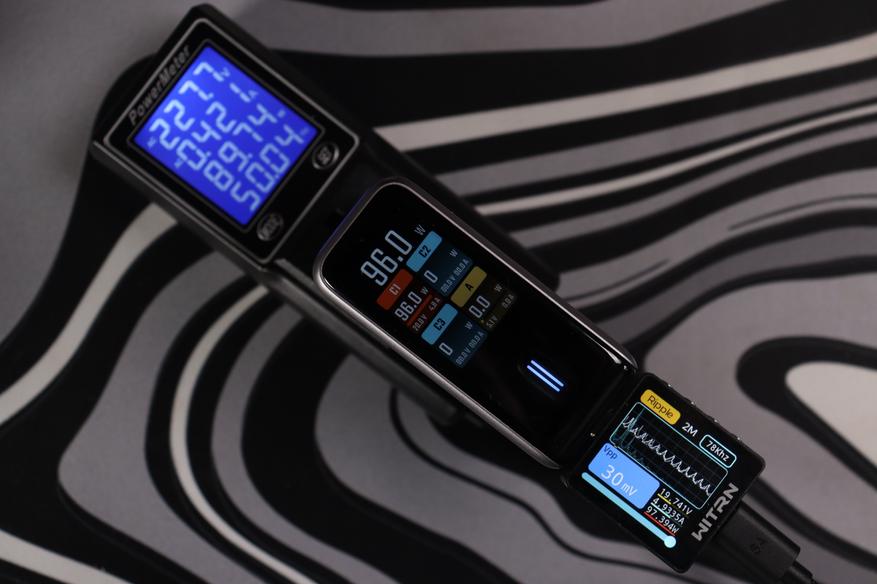 Теперь к цифрам из теста. Пульсации (Ripple) держатся на уровне 19-34 мВ при разных режимах работы — это отличный показатель, свидетельствующий о чистом выходном сигнале без помех. Напряжение всегда оставалось стабильным, и даже присутствовало во всех из режимов запас по мощности в 10-15%. Все заваленные режимы работы соблюдаются. По точности показомера интегрированного в зарядное — тоже нет никаких замечаний, погрешность до 2-3%