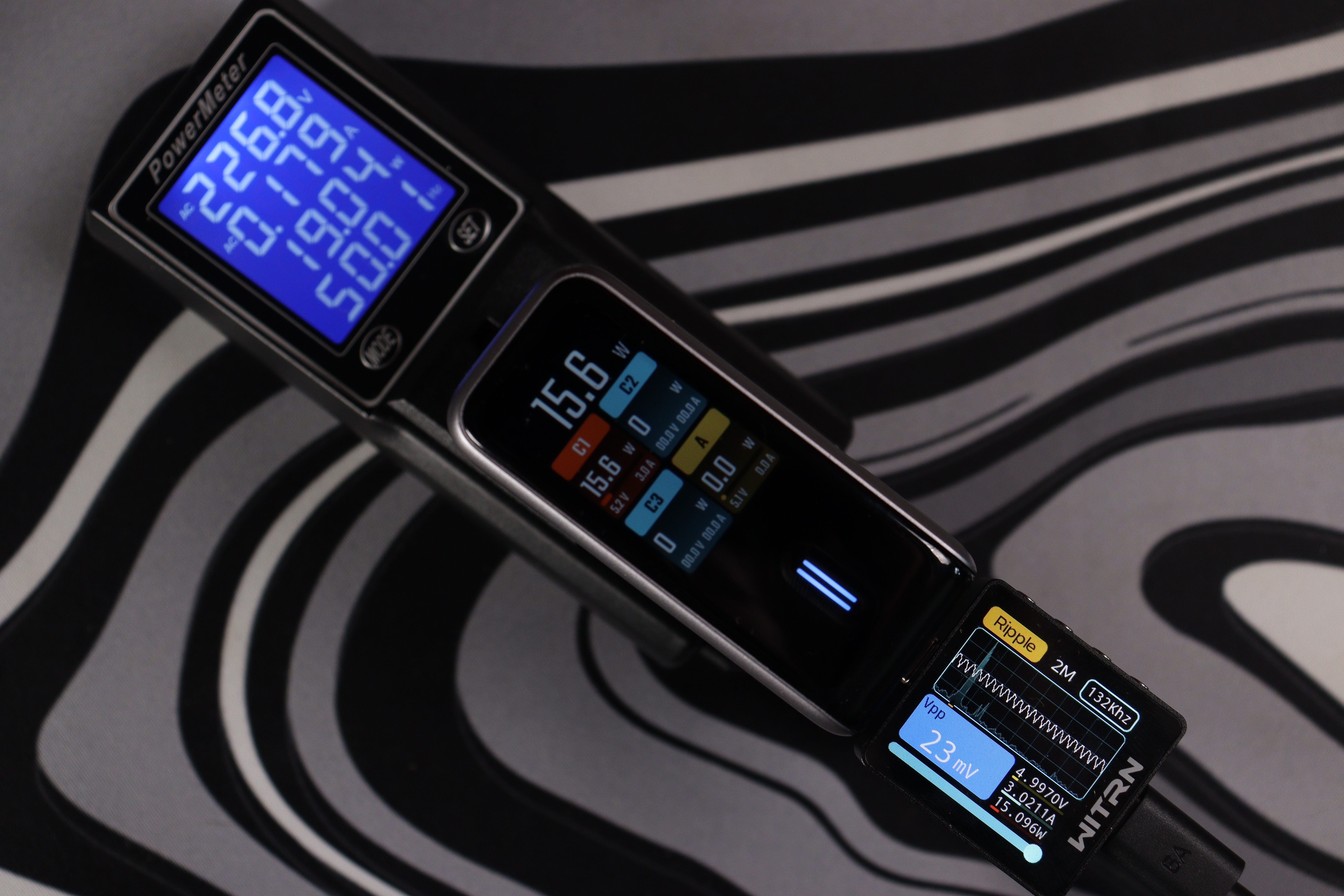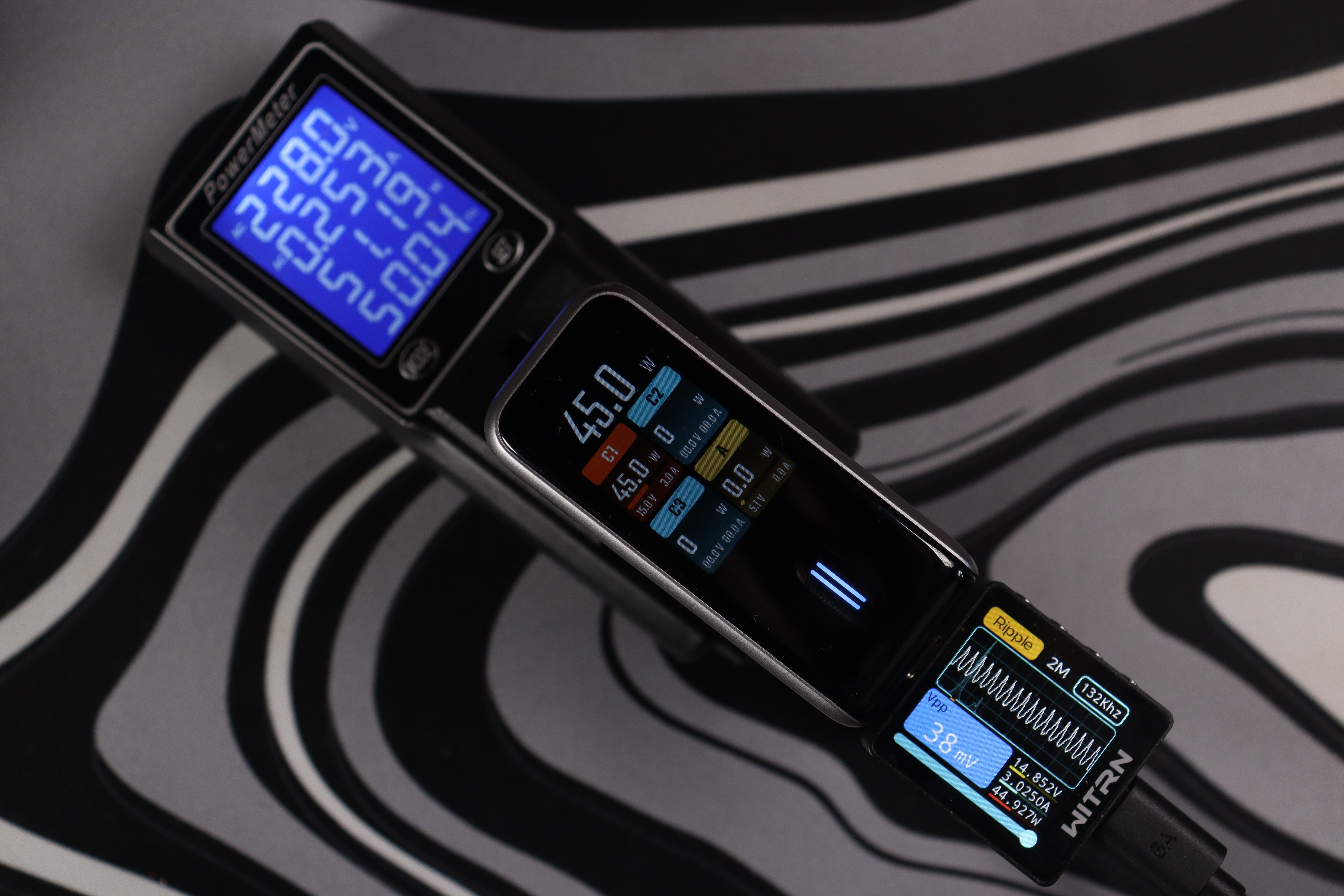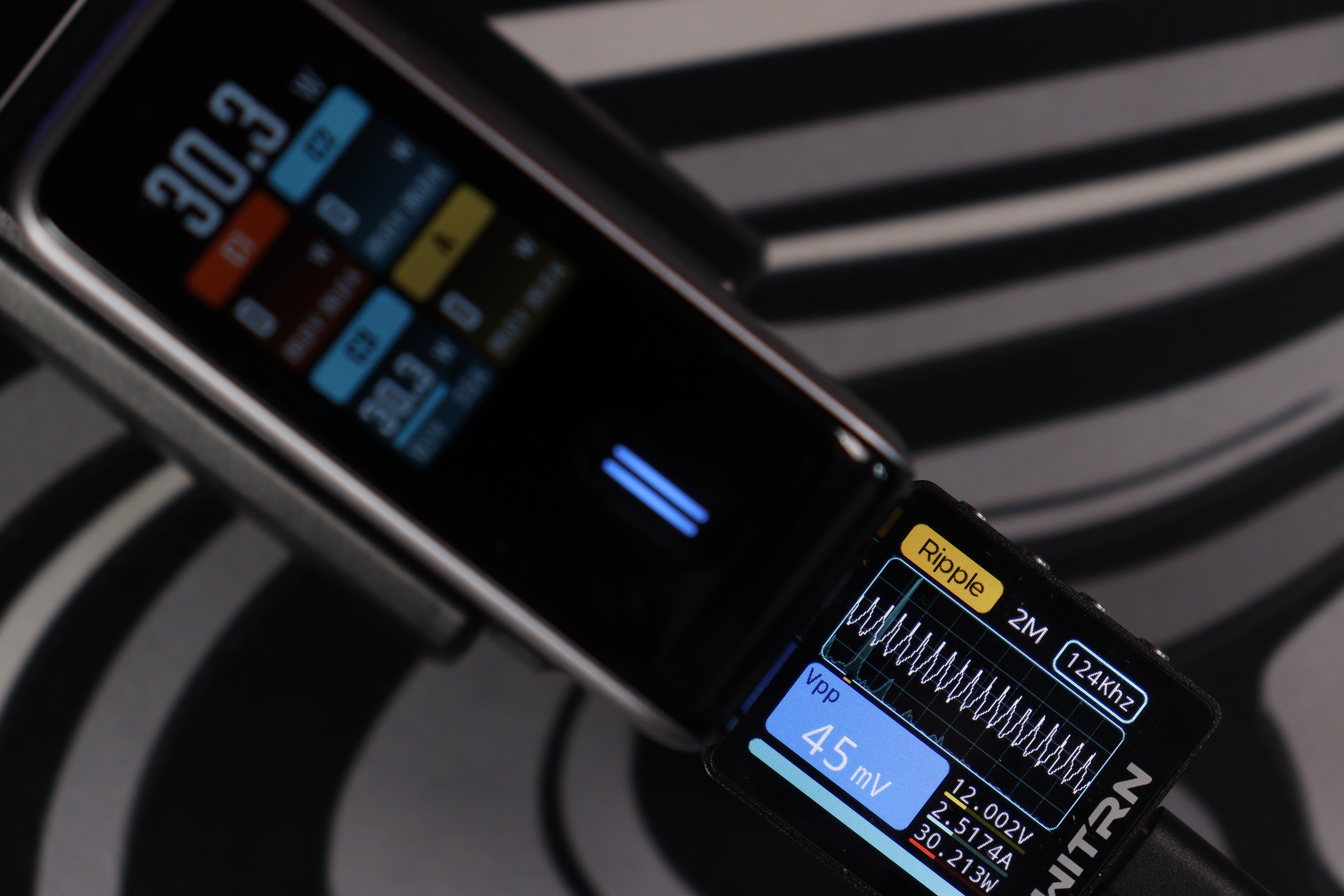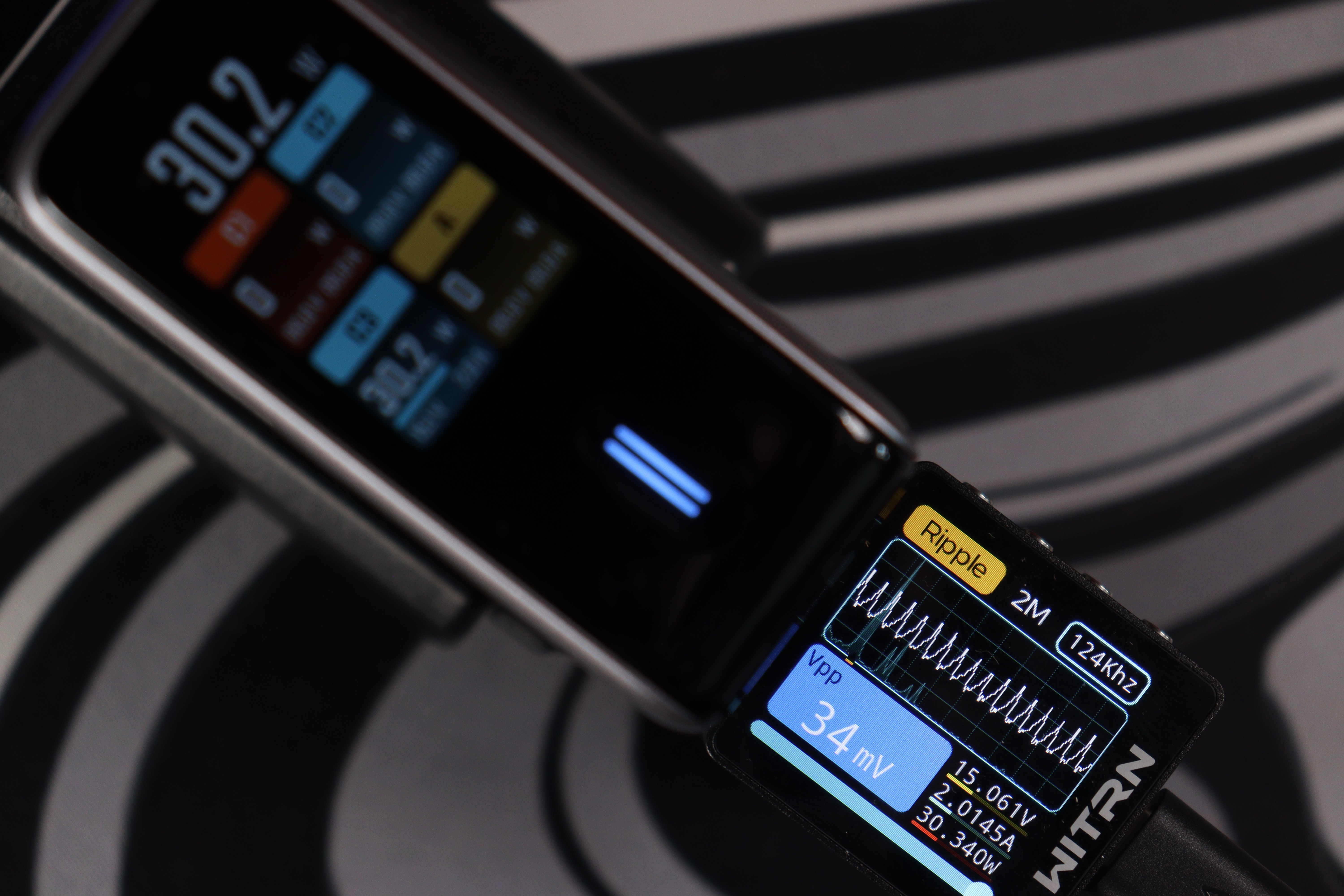 Теперь к цифрам из теста. Пульсации (Ripple) держатся на уровне 19-34 мВ при разных режимах работы — это отличный показатель, свидетельствующий о чистом выходном сигнале без помех. Напряжение всегда оставалось стабильным, и даже присутствовало во всех из режимов запас по мощности в 10-15%. Все заваленные режимы работы соблюдаются. По точности показомера интегрированного в зарядное — тоже нет никаких замечаний, погрешность до 2-3%
