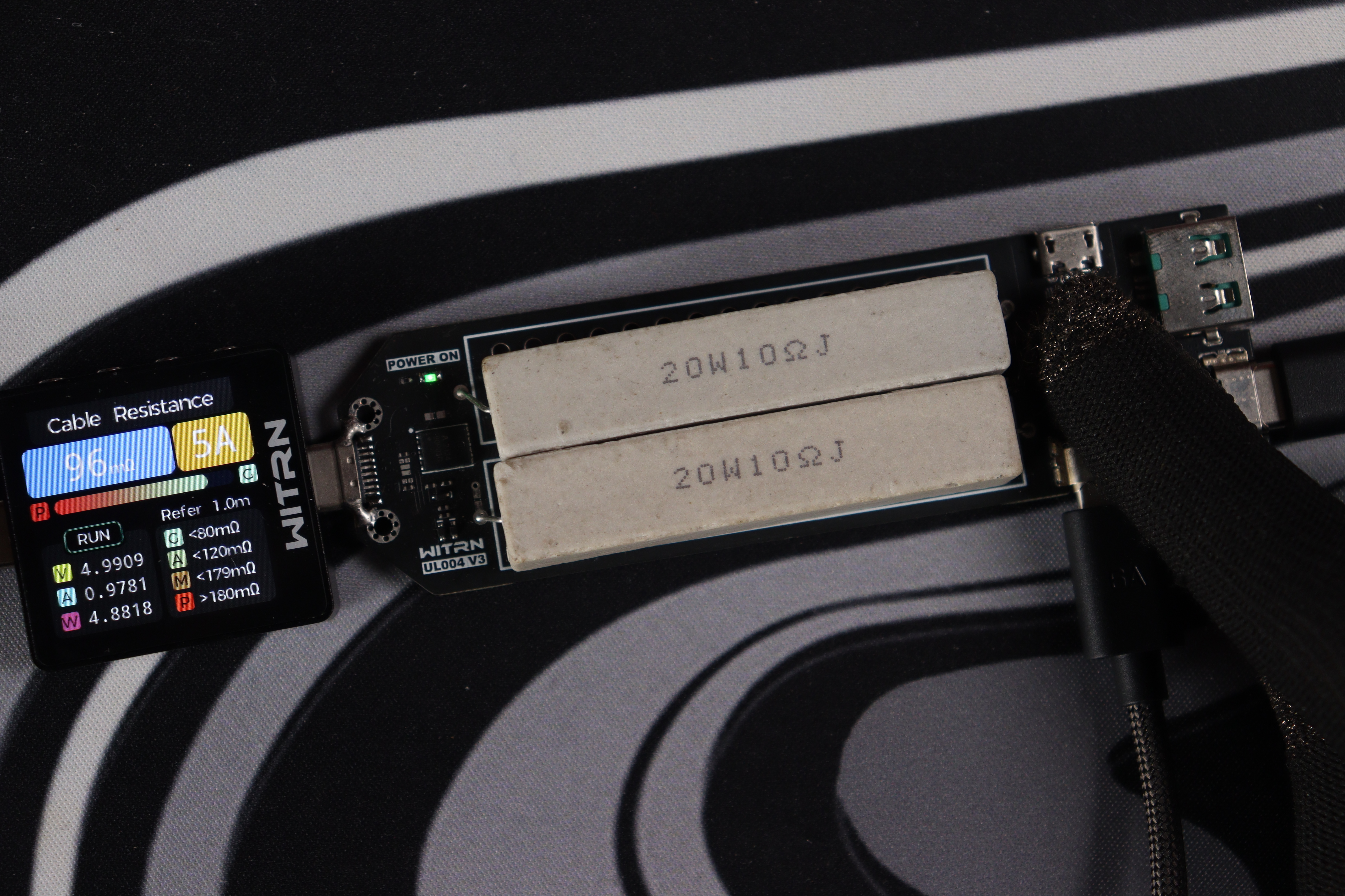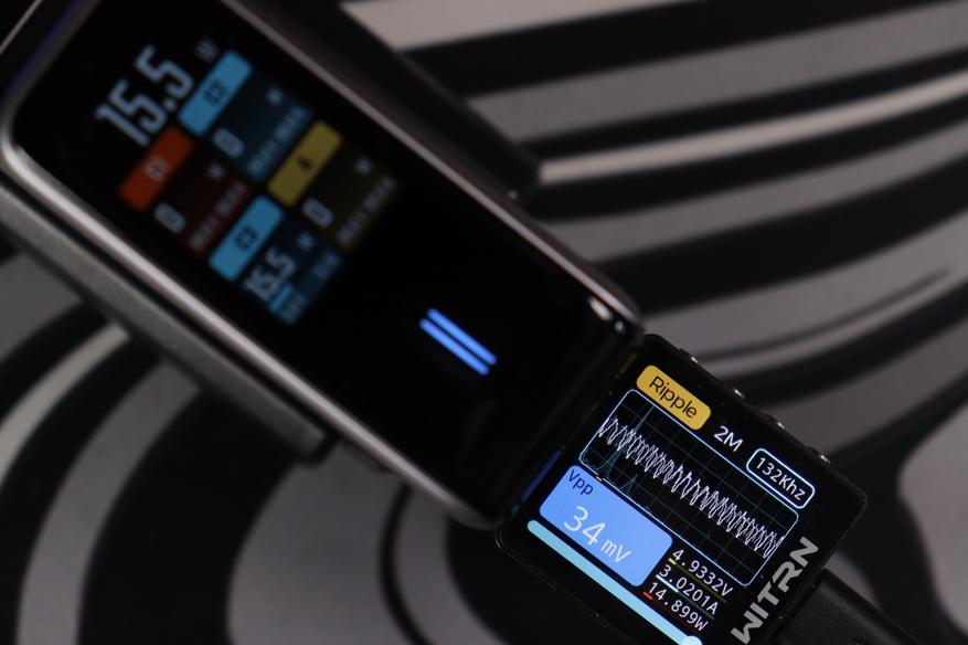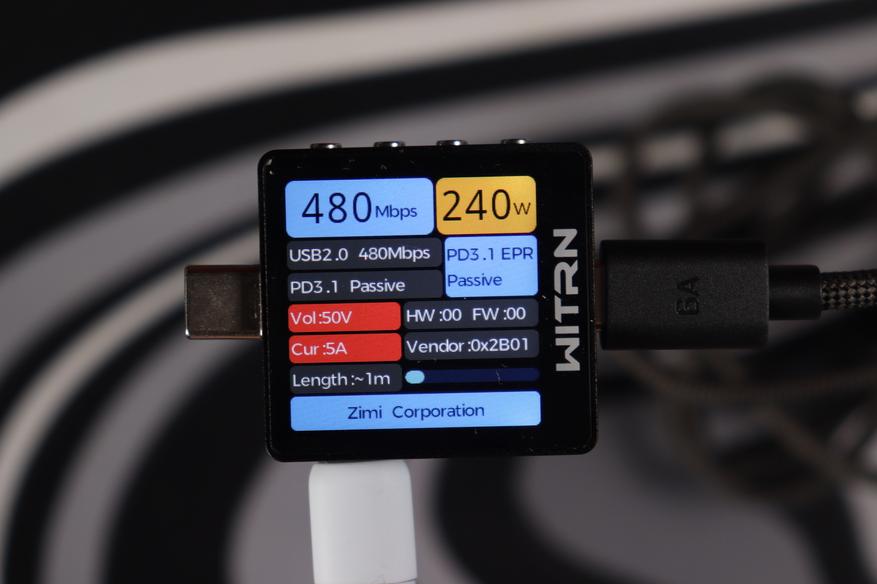 Кабельный тестер Witrn показал интересные данные: сопротивление кабеля всего 96 мΩ, скорость передачи данных 480 Mbps (USB 2.0, как и заявлено), поддержка PD 3.1 с EPR.