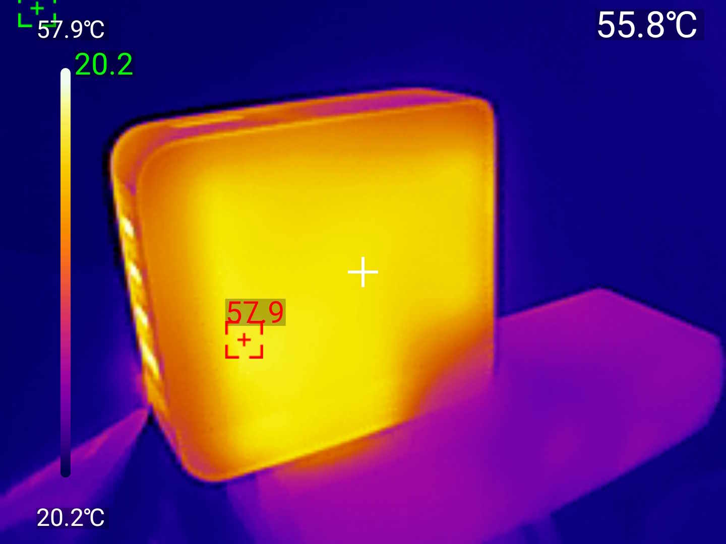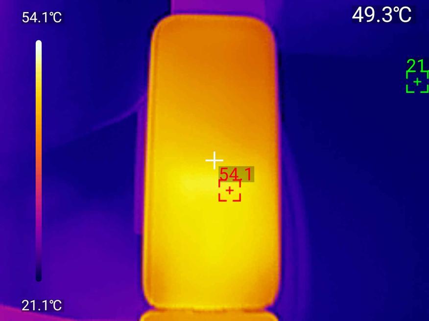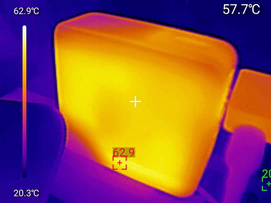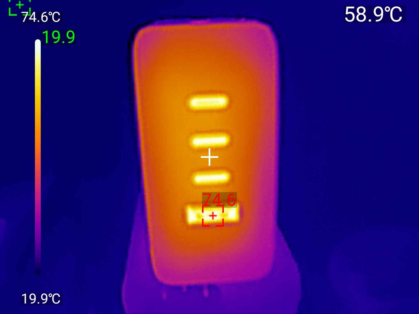 Температурный тест в виде нагрузки на максимальной мощности в 100 Вт прошел на отлично. Измерил корпус тепловизором после получаса работы на полной мощности — картина впечатляет. Основной корпус нагрелся до 57-63°C (жёлто-оранжевая зона на тепловизоре), порты — до 74-77°C (красная зона), что логично, ведь там идёт основная передача энергии. При этом даже самые горячие участки остаются на безопасном уровне — можно держать в руках без дискомфорта.