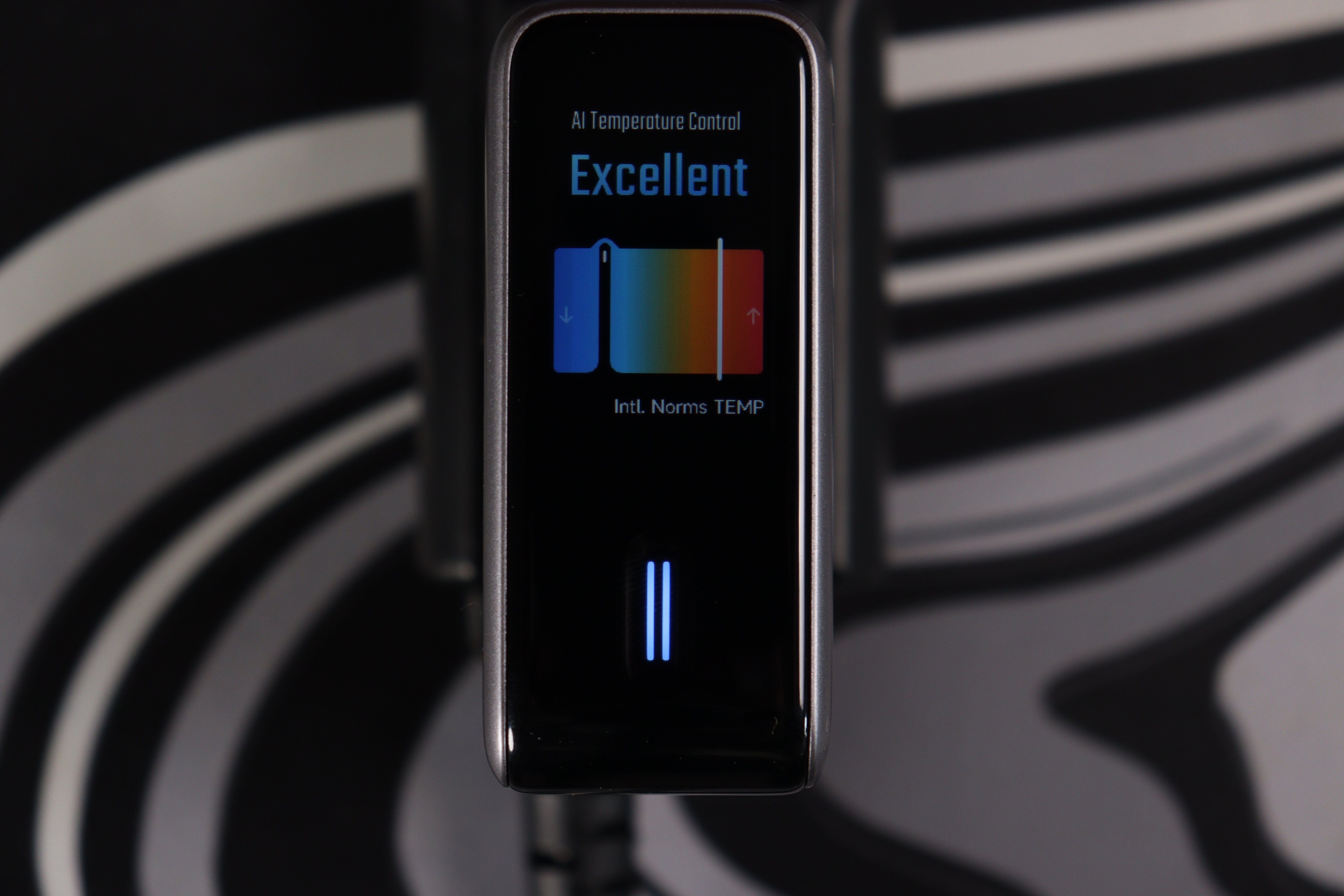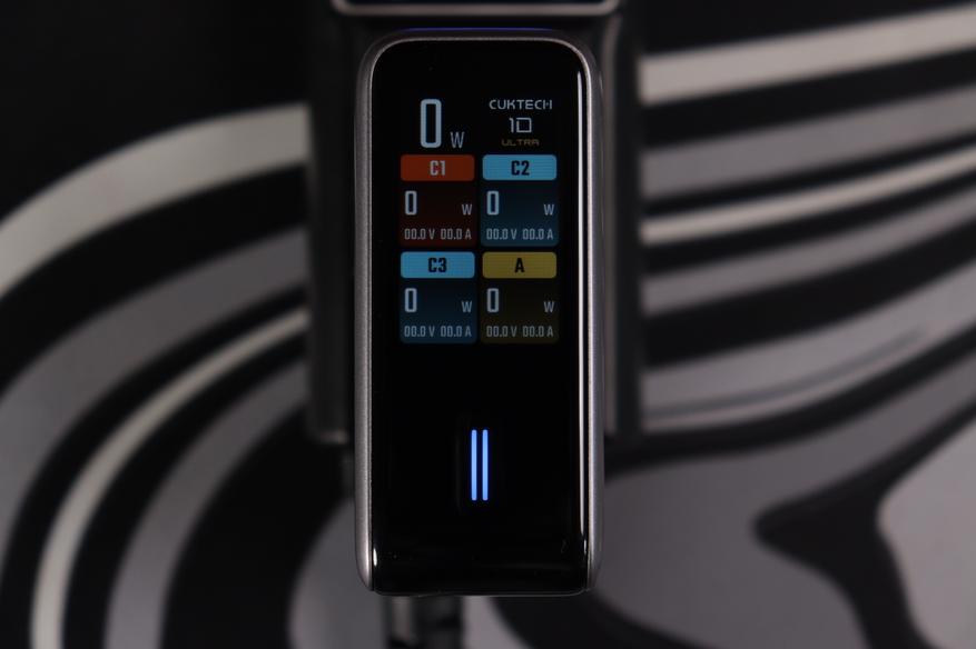 Корпус выполнен в строгом дизайне: матовый металлический оттенок с чёрной вставкой снизу и бирюзовой полоской-акцентом. Логотип «10 ULTRA» нанесён сдержанно, без излишней яркости. На одной из граней расположен цветной дисплей — это главная фишка устройства. Экран показывает напряжение, силу тока и мощность для каждого порта, а также индикатор температуры с AI-контролем.