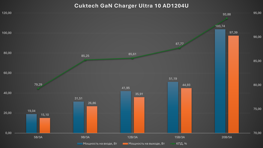 По КПД зарядное устройство показывает себя весьма стандартно, демонстрируя максимальную эффективность при максимальной работе.