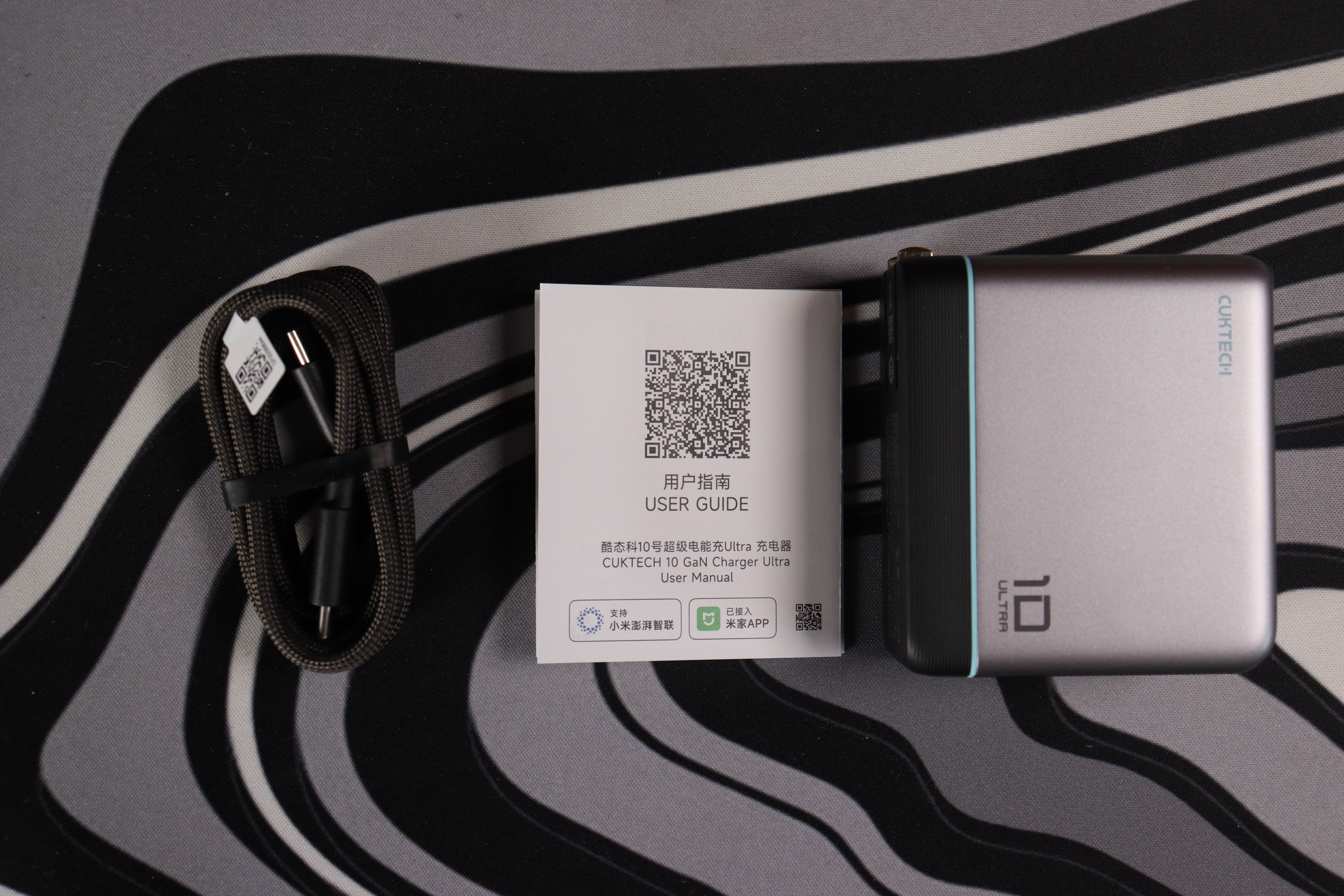 Упаковка выполнена в черном цвете, аккуратная, с добротной полиграфией и весьма стильном внешнем виде. В коробке всё продумано до мелочей. Само зарядное устройство упаковано аккуратно, рядом лежит кабель USB-C с плетёной оплёткой и маркировкой «6A». Кабель явно не из дешёвых — жёсткий, с металлическими коннекторами и фирменными обозначениями Cuktech. Есть краткая инструкция с QR-кодом для скачивания приложения Xiaomi Home (устройство интегрируется в экосистему). Вилка складная (китайского/американского типа), что удобно для транспортировки. Никаких лишних переходников или чехлов — минимализм в хорошем смысле.