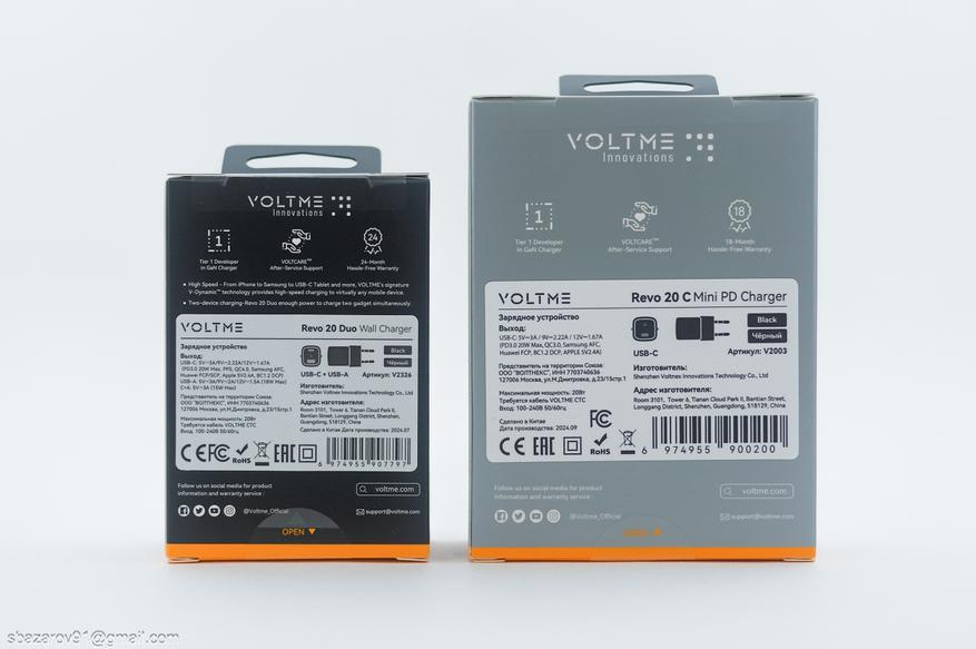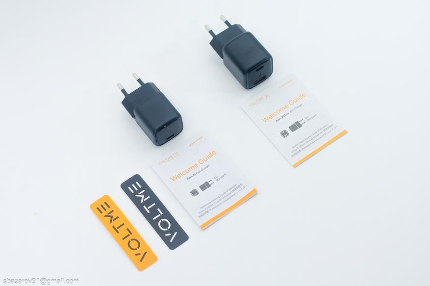 Комплектации в целом идентичны: зарядное устройство, руководство пользователя и пара фирменных наклеек VOLTME.