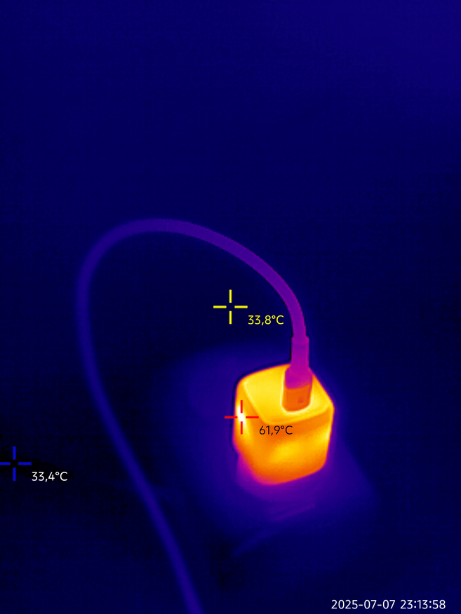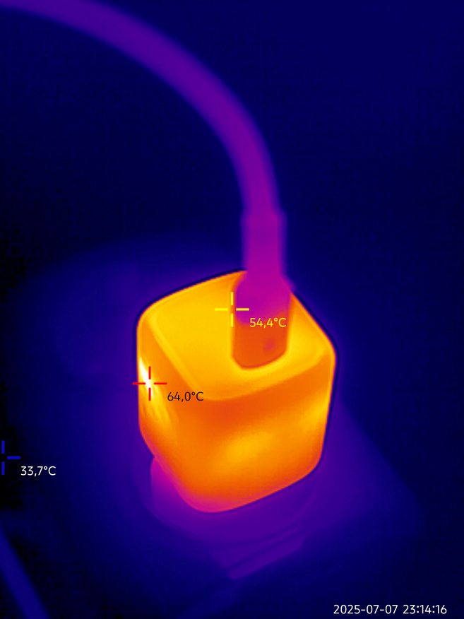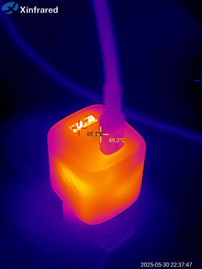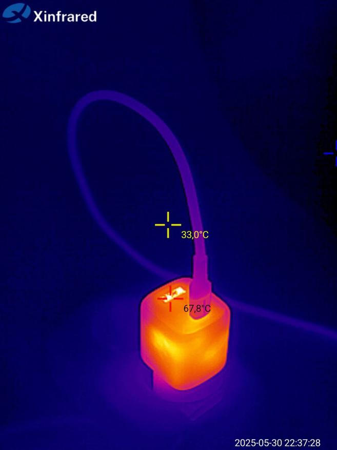 Хотя 20 Вт — невысокая мощность по современным меркам, компактный корпус означает плотную компоновку компонентов, что может вызывать нагрев. Поэтому нагружаем зарядные устройства по максимуму и смотрим на них глазами тепловизора: максимальная температура Revo 20 Duo достигает почти 70°C при окружающей температуре около 26°C (в комнате). Эта температура достаточно высокая и обусловлена компактными размерами и наличием сразу нескольких разъемов для подключения устройств. Температура Revo 20 немного ниже — 64°C, что так же обусловлено компактными размерами и высокой мощностью.