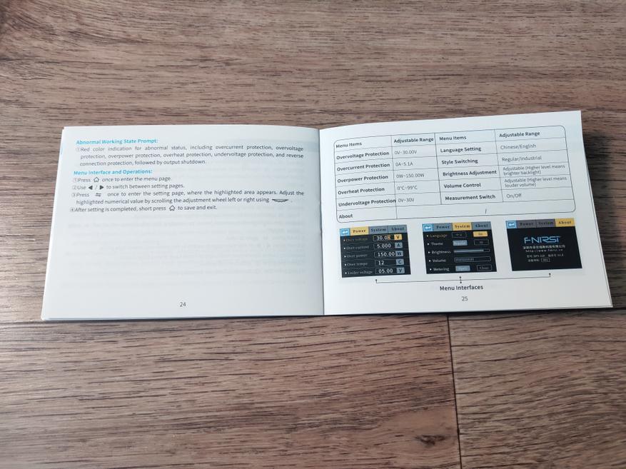 При коротком нажатии на эту кнопку, открывается меню где можно настроить лимит по выходному напряжению (до 31В), лимит по выходному току (до 5.1А), лимит по выходной мощности, пороговую температуру отключения, и минимальное выходное напряжение. Так же, здесь можно настроить язык интерфейса (Китайский/Английский), выбрать тему оформления, настроить уровень подсветки экрана, уровень звуковых сигналов, и посмотреть информацию по прошивке. При длительном нажатии по кнопке, происходит сброс накопленных данных, таких как информация по ёмкости, информация по энергии, данные по времени теста.