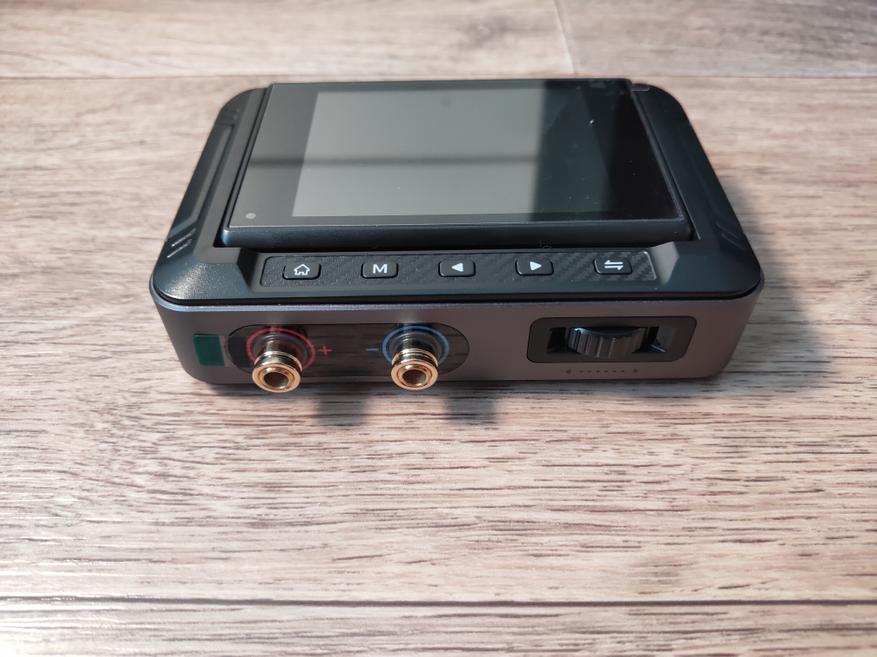 Есть ещё одна, шестая кнопка. Она отделена от ряда из пяти кнопок, и находится с правого бока преобразователя, и имеет уже совсем иные габариты. Она предназначена для включения/отключения выхода, а так же блокировке настроек (при удержании). По сути, это самая важная кнопка. Когда на выход подано напряжение, кнопка подсвечивается синим цветом, а так же подсвечиваются красным и жёлтым выходные порты. Кстати, говоря о выходных портах, можно немного раскрутить гайки на них (от руки), и там мы увидим прорези под провода, которые будет удобно зафиксировать теми же гайками, не используя бананы.