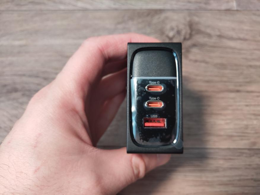Зарядник качественный, и имеет приемлемые габариты для своей мощности. В наличии три порта (2*Type-C и 1*USB-A). Комплектный кабель так же хорошего качества.