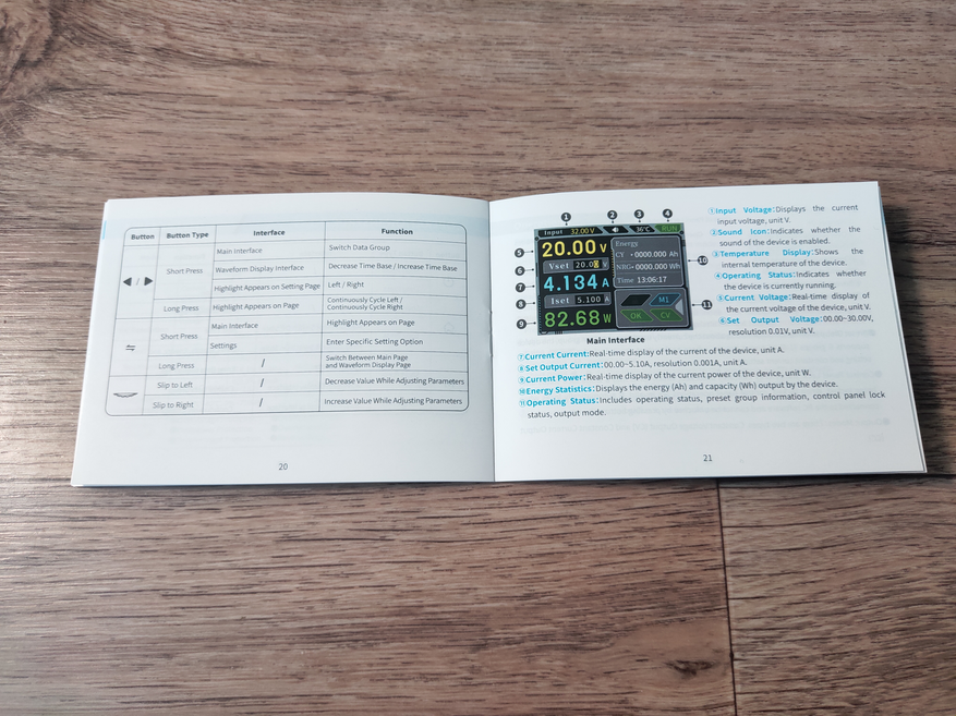 При нахождении на основном экране, сверху отображается текущее напряжение входа, индикация активности звуковых сигналов, температура устройства, и режим выхода. Затем идут данные по напряжению, току и мощности на выходе, и соответствующие им заданные значения напряжения и тока. Справа от них представлена информация о затраченной во время теста энергии, подсчитанной ёмкости, и времени теста, что например удобно при питании от аккумулятора, или же тесте его разряда на какую либо нагрузку. Ниже идёт информация об активации режима блокировки кнопок, информация о текущем профиле, и данные о текущем режиме работы (CV/СС),