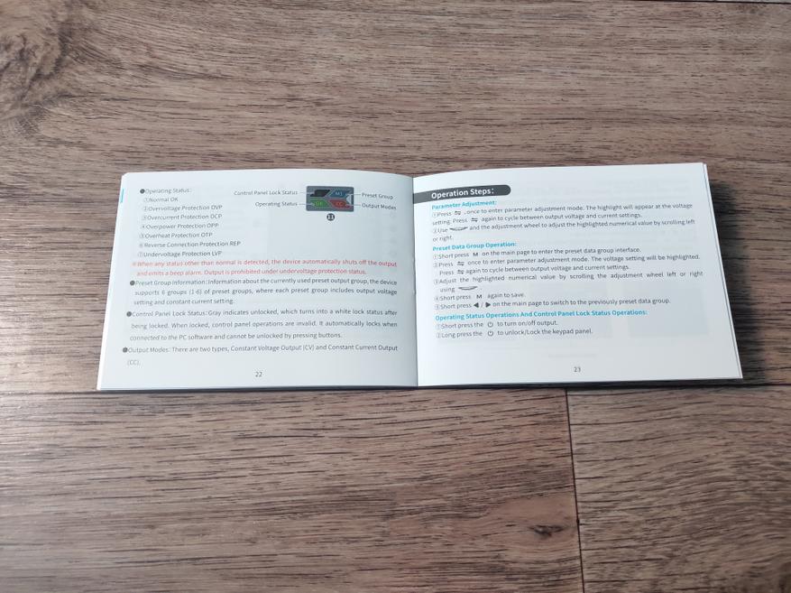 Следующей идёт кнопка «М» (Manual). При коротком нажатии на кнопку можно выбрать один из 6 профилей настроек выхода, а при длительном нажатии, уже произвести настройки по каждому из профилей. Для выбора номера настраиваемого в данный момент профиля, используются стрелки влево- вправо, и самая крайняя кнопка для перехода в режим настройки выбранного профиля. После перехода в режим настройки, стрелками влево-вправо можно выбрать настраиваемый разряд у величины напряжения или тока, и уже колёсиком изменить значение на нужное.