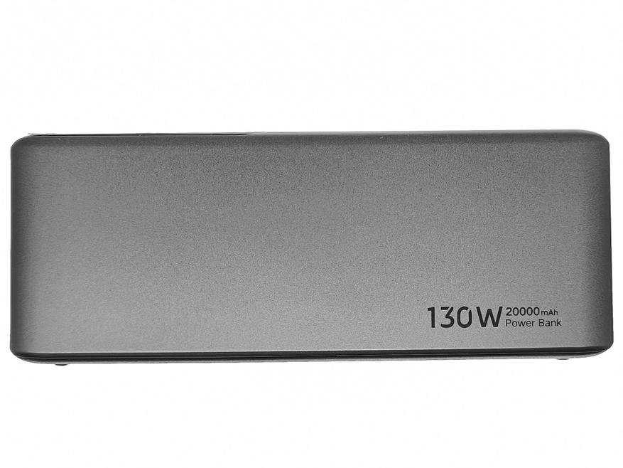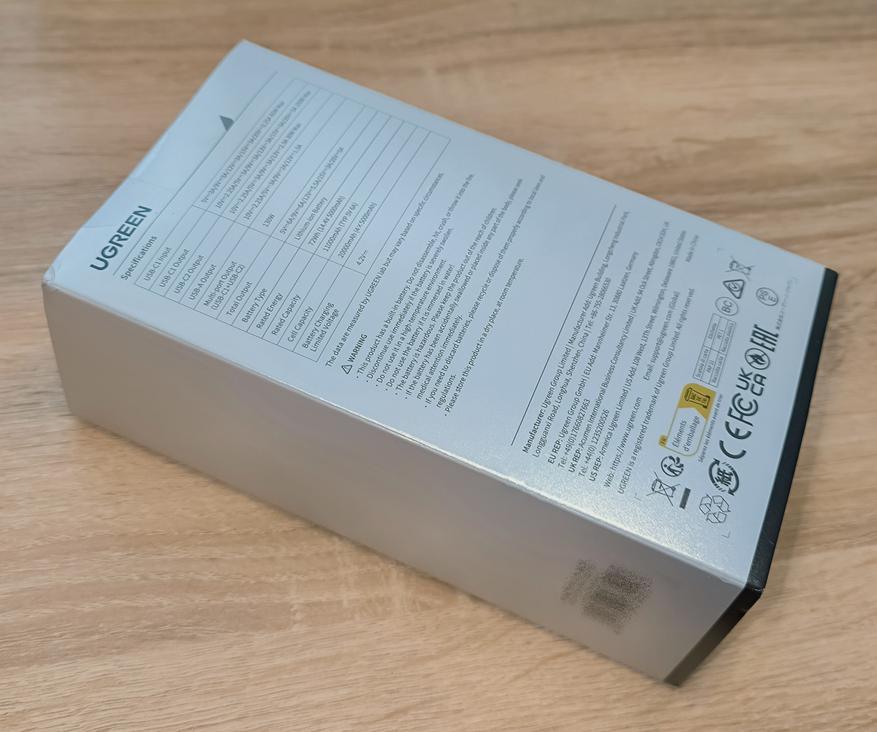 Повербанк поставляется в качественной упаковке с красочным оформлением. На лицевой стороне упаковки находится изображение повербанка, а так же там указана информация о главных его особенностях: общей мощности 130W, 100W мощности при однопортовой зарядке, ёмкости 20000mAh, поддержке различных протоколов быстрой зарядки и наличии многоуровневой защиты. С обратной стороны упаковки можно обнаружить: спецификации устройства, предупреждение безопасности, контактные данные производителя и знаки сертификации.