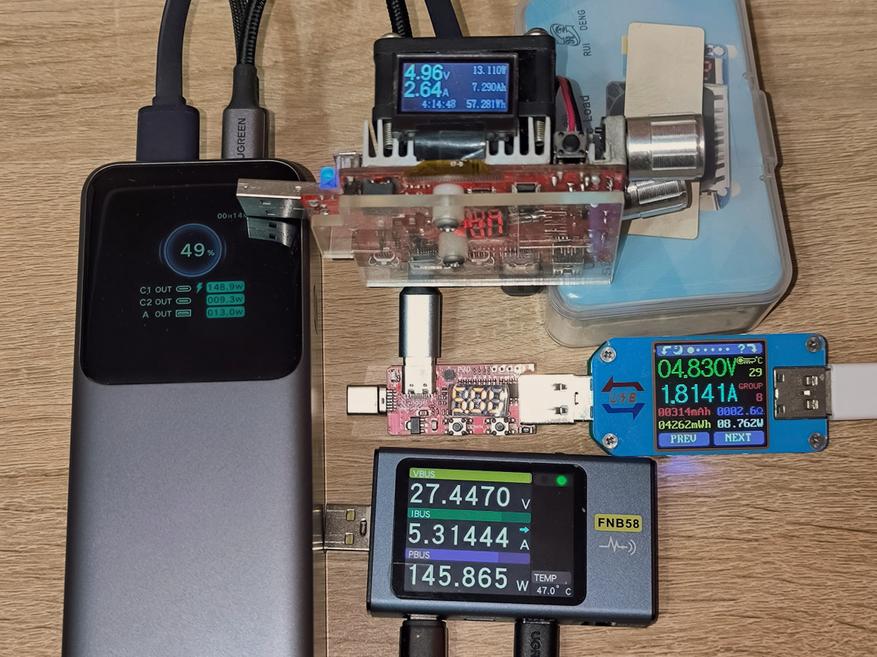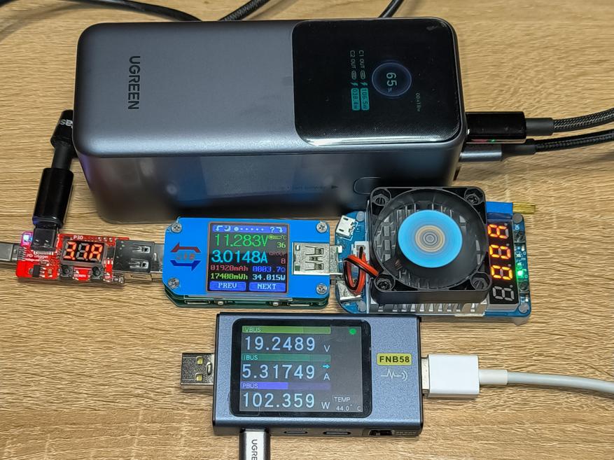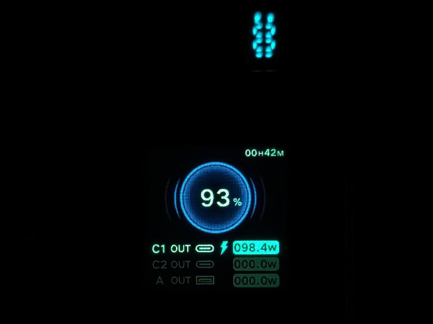 - USB-C1 + USB-C2 + USB-A: 102.3W + 15.3W + 16 (суммарно 133.6W). Дисплей повербанка показывает 106.5W + 17.8W + 15.9 (суммарно 140W).