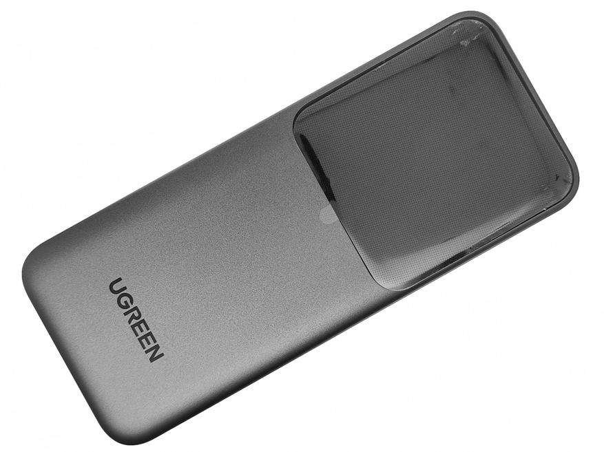 Повербанк Ugreen PB721 выполнен в виде длинного бруска серого цвета. Лицевую сторону повербанка украшает большая прозрачная панель с тонировкой, за которой скрывается цветной информационный дисплей. На тыльной стороне повербанка можно обнаружить напечатанные спецификации устройства и дан узких силиконовых опоры. На левом и нижнем торце нет ничего интересного, а на правом находится многофункциональная кнопка. На верхнем торце размещены два порта USB-C и один USB-A.