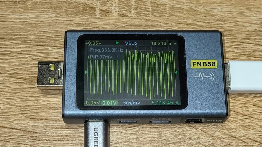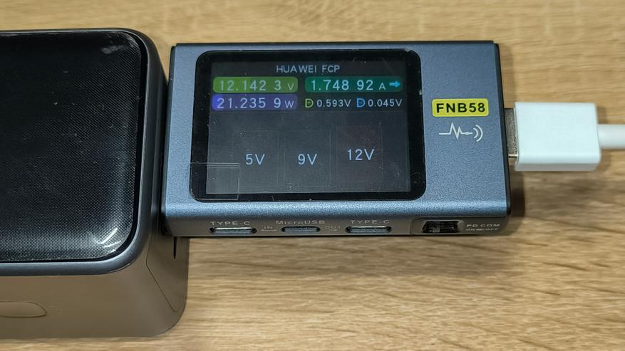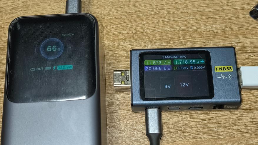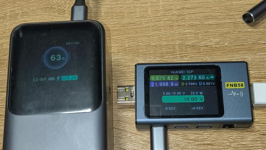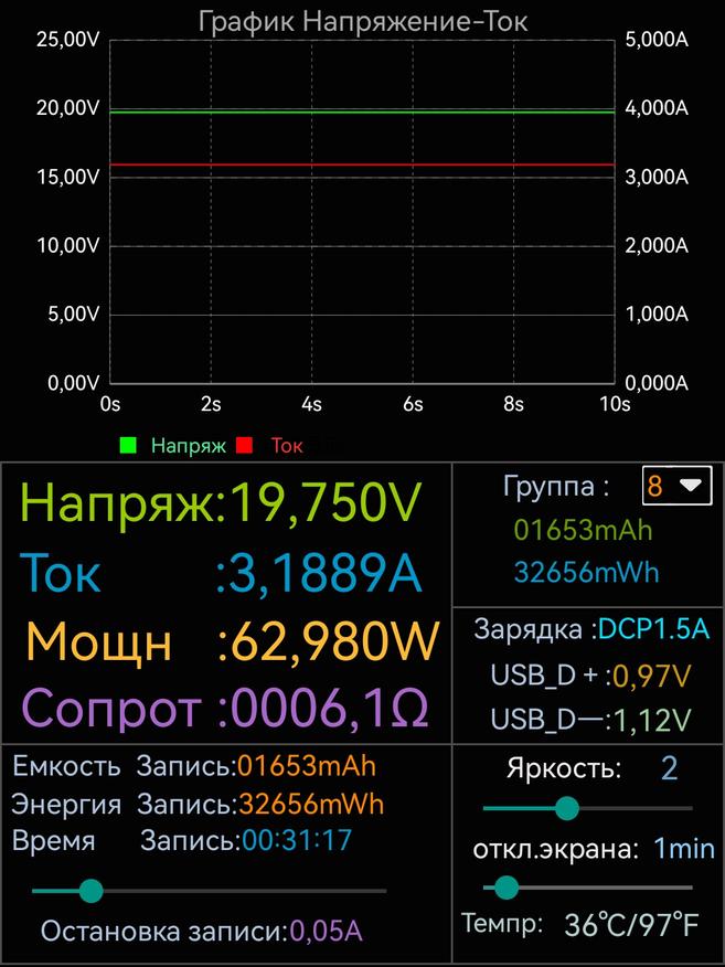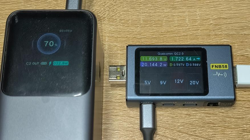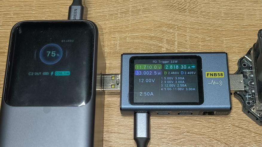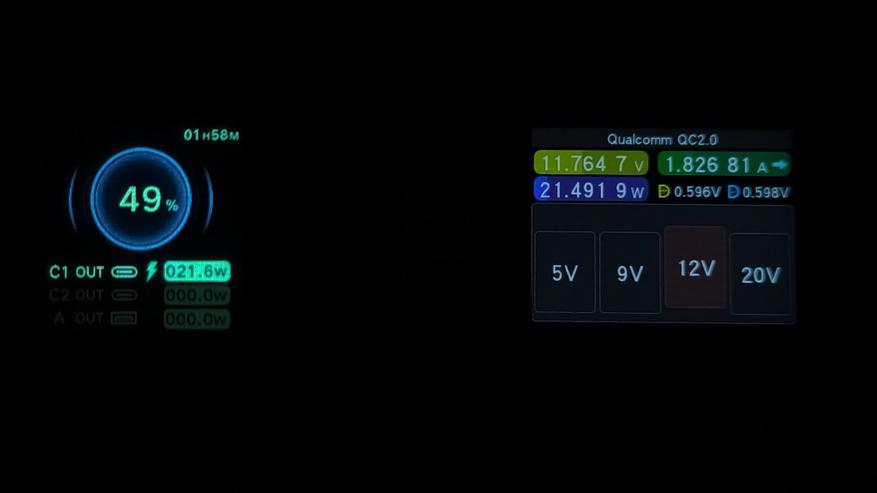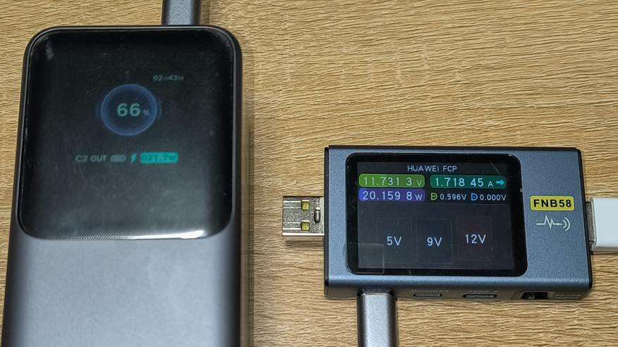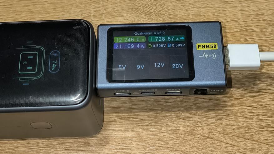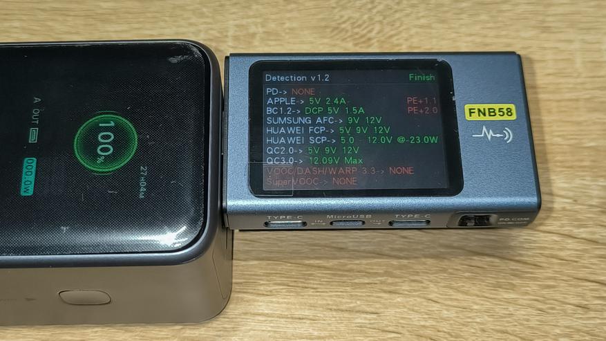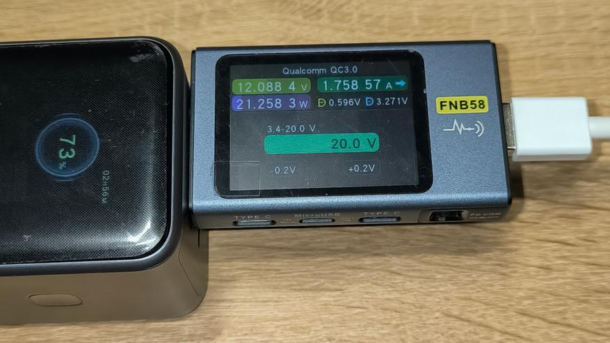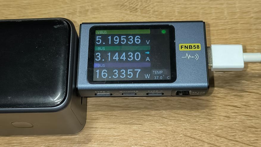 Ниже указана максимальная мощность, которую стабильно держал повербанк с использованием различных протоколов зарядки. Указанные цифры сняты с тестера. Их, а так же показатели дисплея повербанка, можно увидеть на размещенных ниже фотографиях.