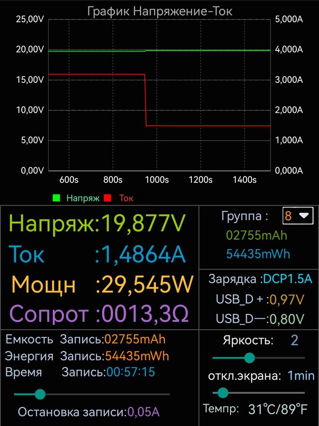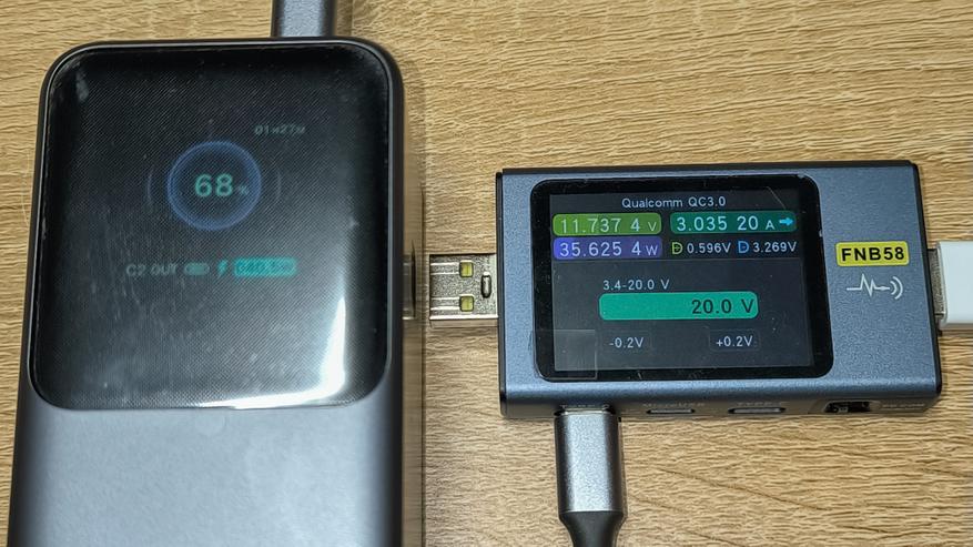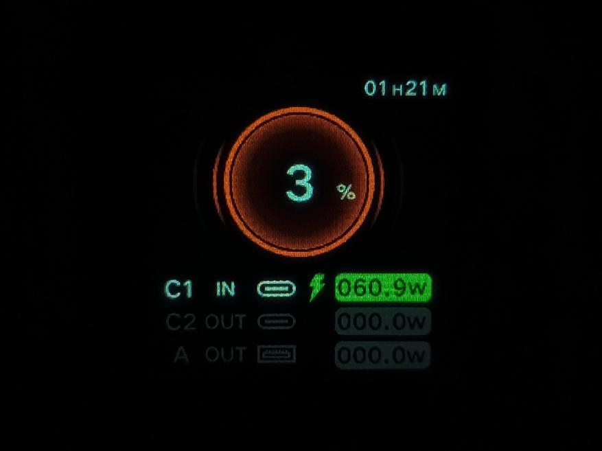 Повербанк заряжается напряжением 20V и током 3A (а если точнее, то 19.7V и 3.18A). Потребляемая мощность составляет почти 63W — по данным тестера и почти 61W — по данным самого повербанка. До 100 процентов повербанк зародился за 1 час и 40 минут, потребив при этом 79.8Wh. Высокая мощность зарядки держится один час (а если точнее, то где-то 55 минут), после чего она резко снижается до 29W. За один час зарядки повербанк набирает 55Wh энергии, а за полчаса 32Wh. При тестировании разряда, повербанком было отдано 61.48Wh.