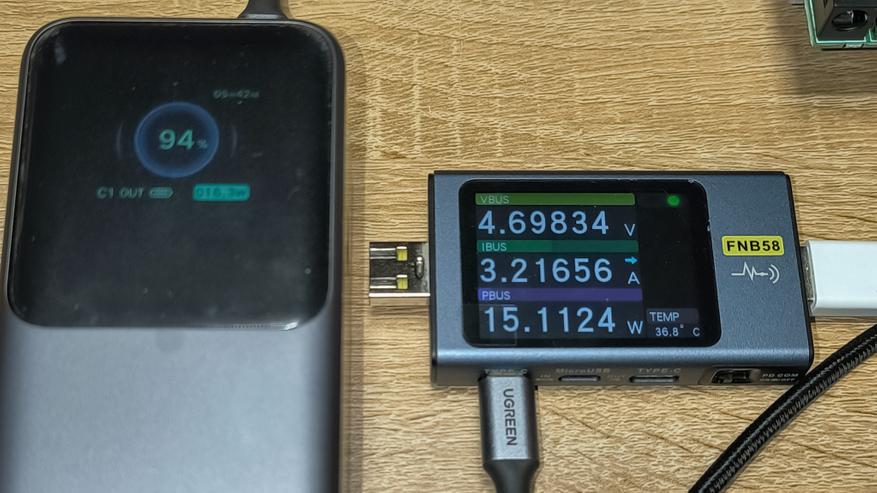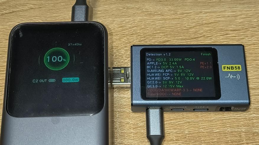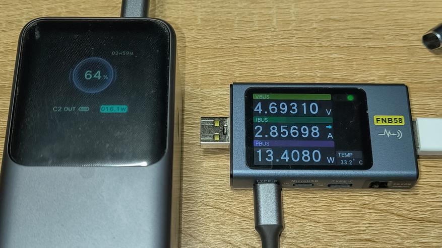 - USB-C1 + USB-C2: 102.3W + 34W (суммарно 136W). Дисплей повербанка показывает 106.5W + 38.4W (суммарно 144.9W).