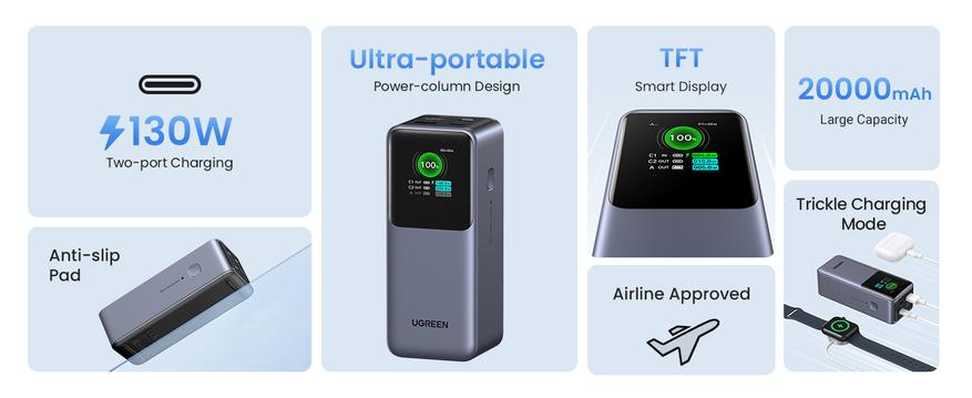 Ugreen Nexode PB721 — это трёхпортовый повербанк от небезызвестного производителя, который обладает ёмкостью 20000mAh, мощностью 130W, имеет цветной информационный дисплей, и поддерживает многие протоколы быстрой зарядки.