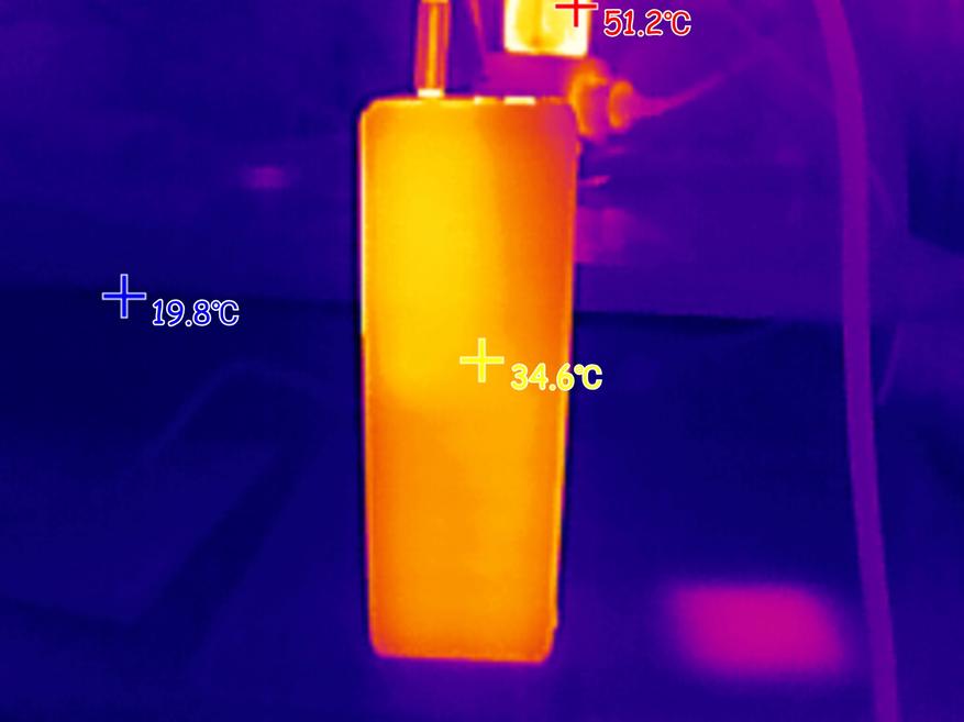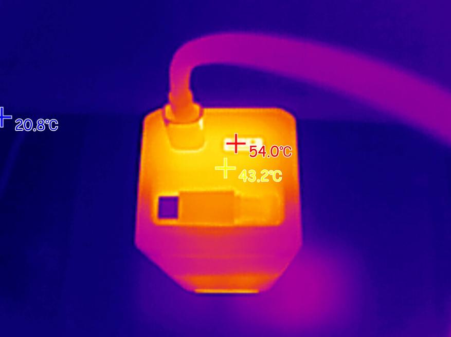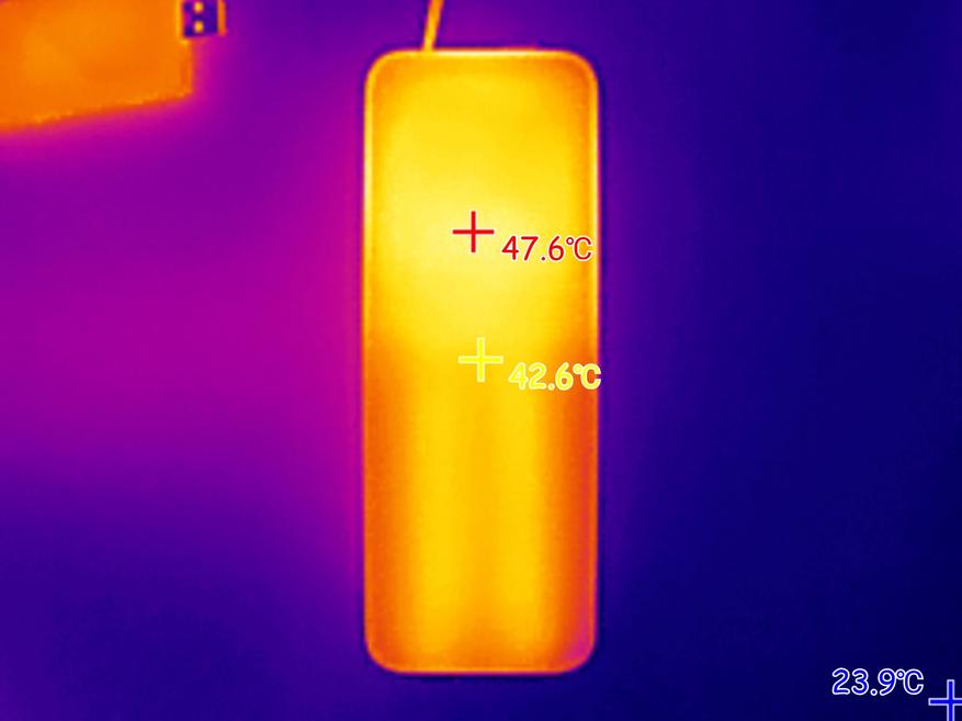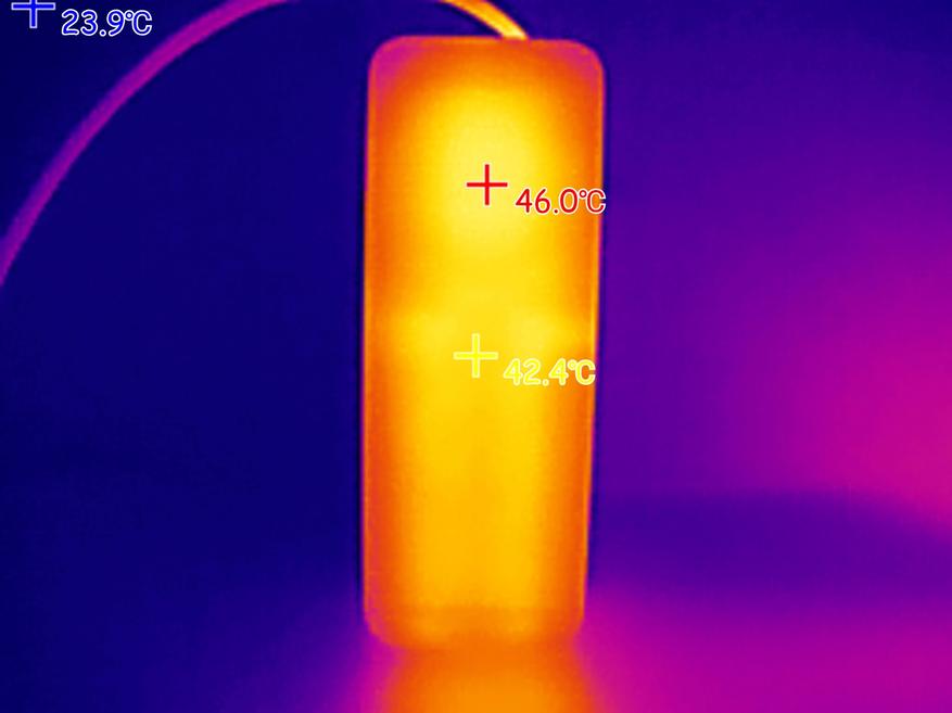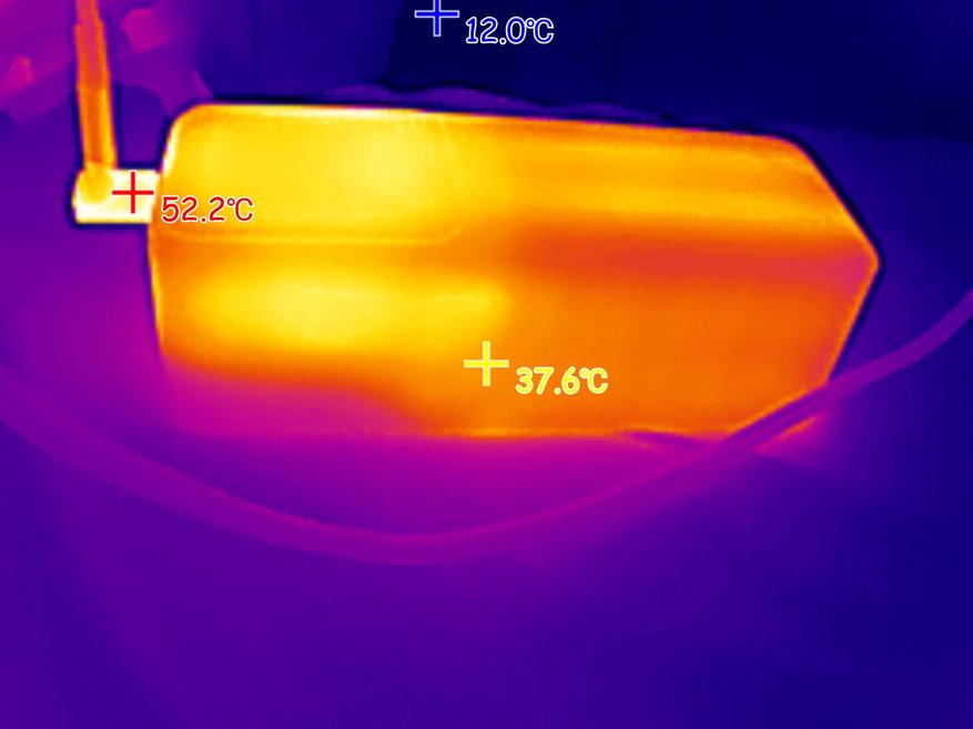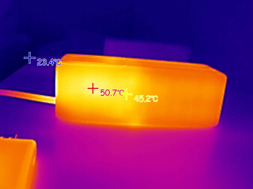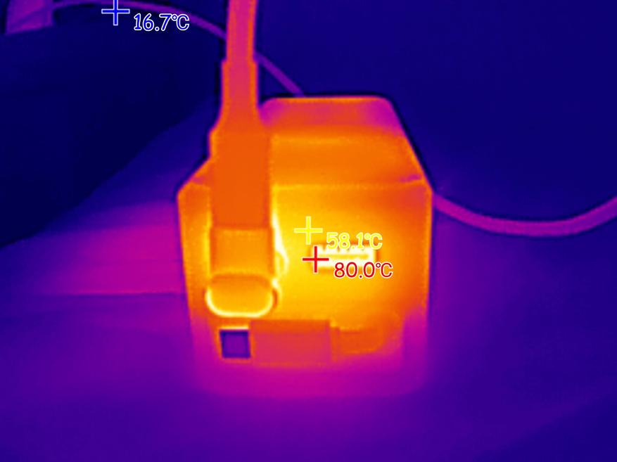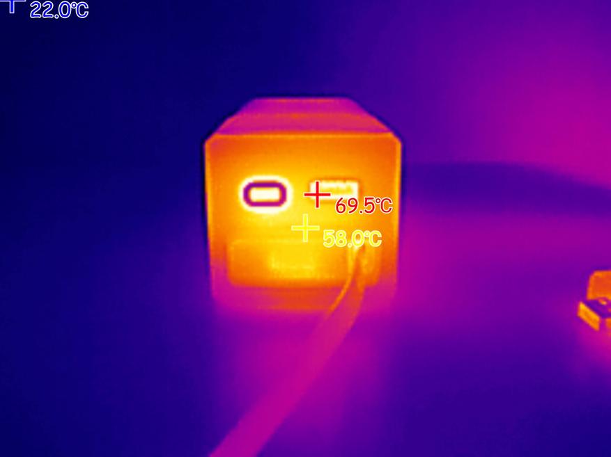 При подаче на ноутбук мощности 100W (ноутбук был подключен к USB-C порту пауэрбанка), максимальная температура корпуса пауэрбанка была зафиксирована на отметке 58 градусов. Внутри порта USB-A, который находится рядом с «нагруженным» портов, пиковая температура поднялась до 80 градусов.