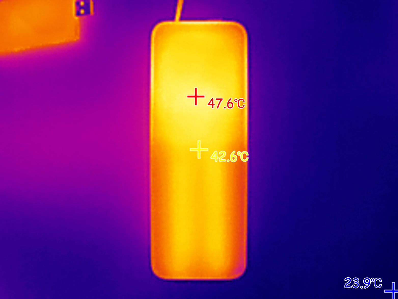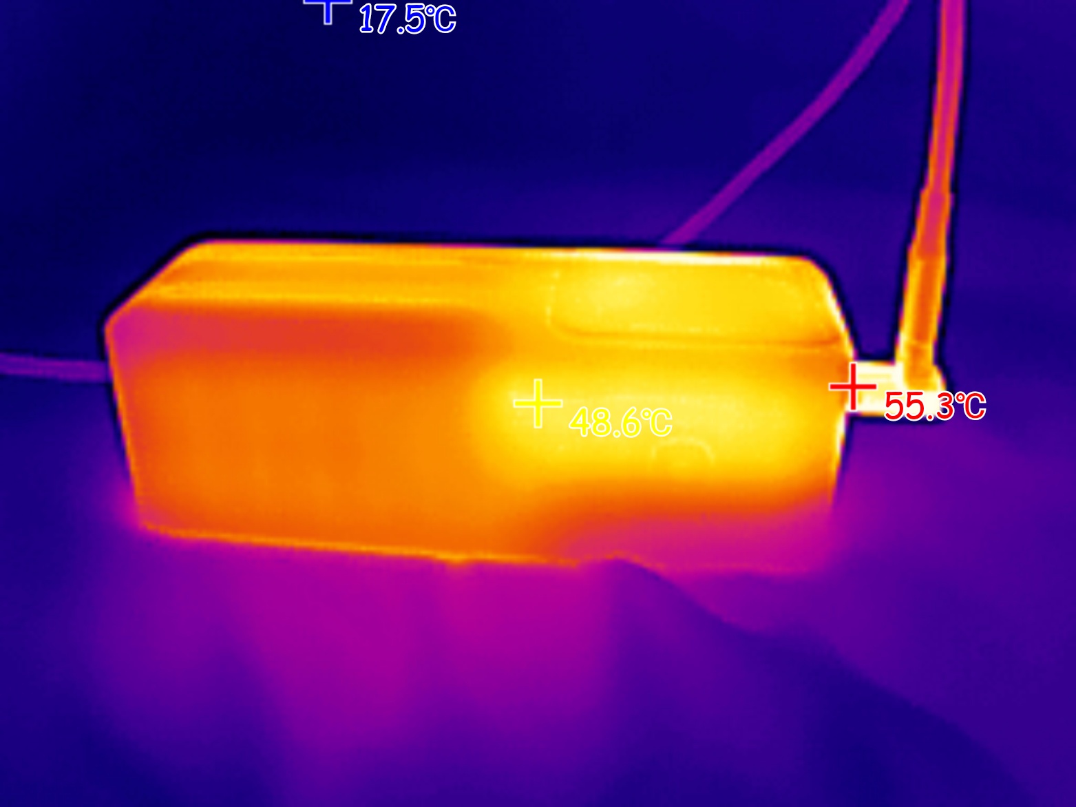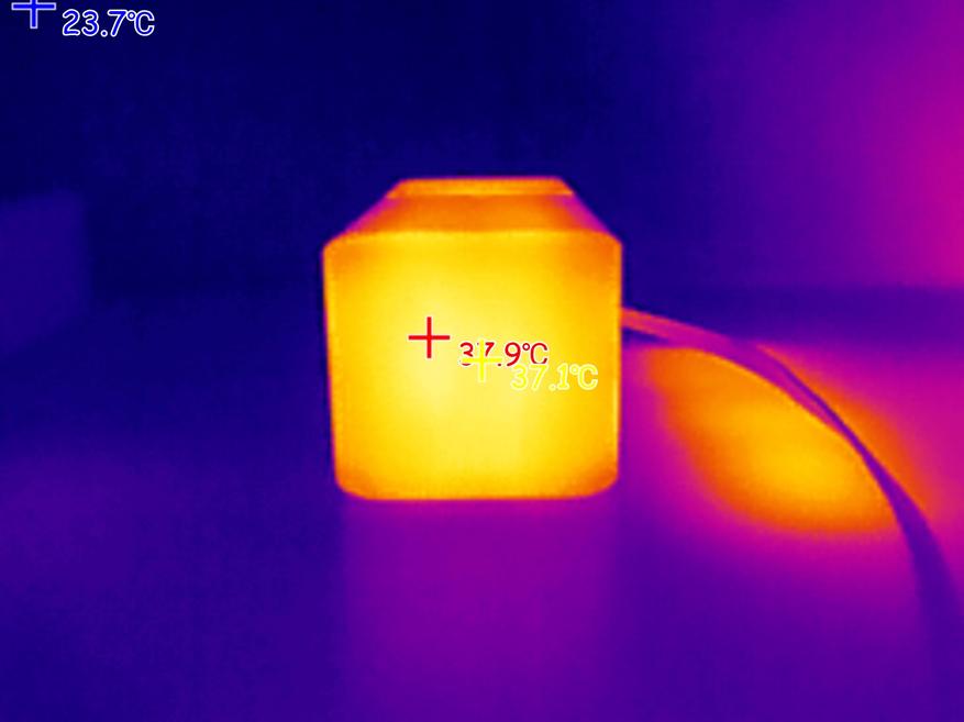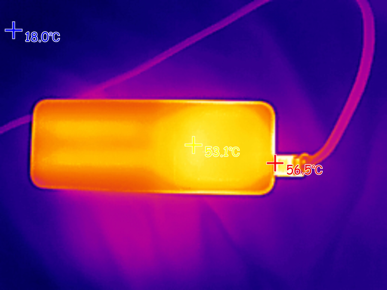 При подаче на ноутбук мощности 100W (ноутбук был подключен к USB-C порту пауэрбанка), максимальная температура корпуса пауэрбанка была зафиксирована на отметке 58 градусов. Внутри порта USB-A, который находится рядом с «нагруженным» портов, пиковая температура поднялась до 80 градусов.