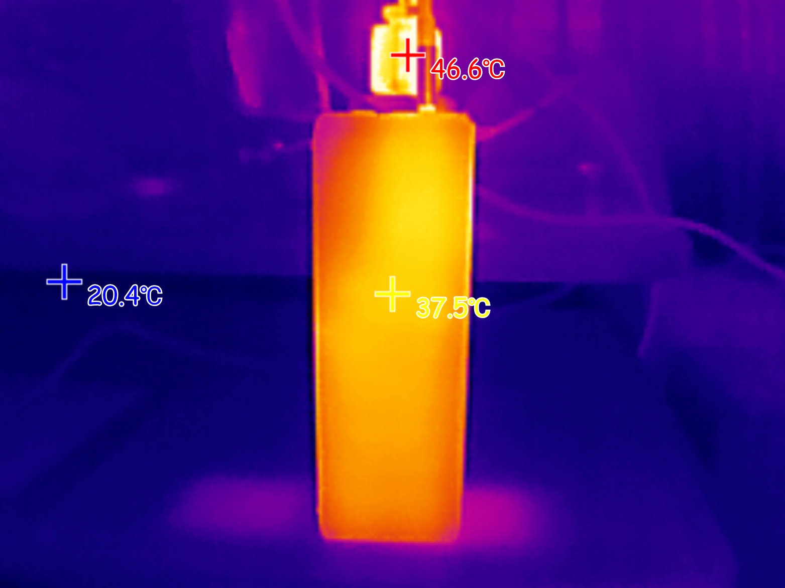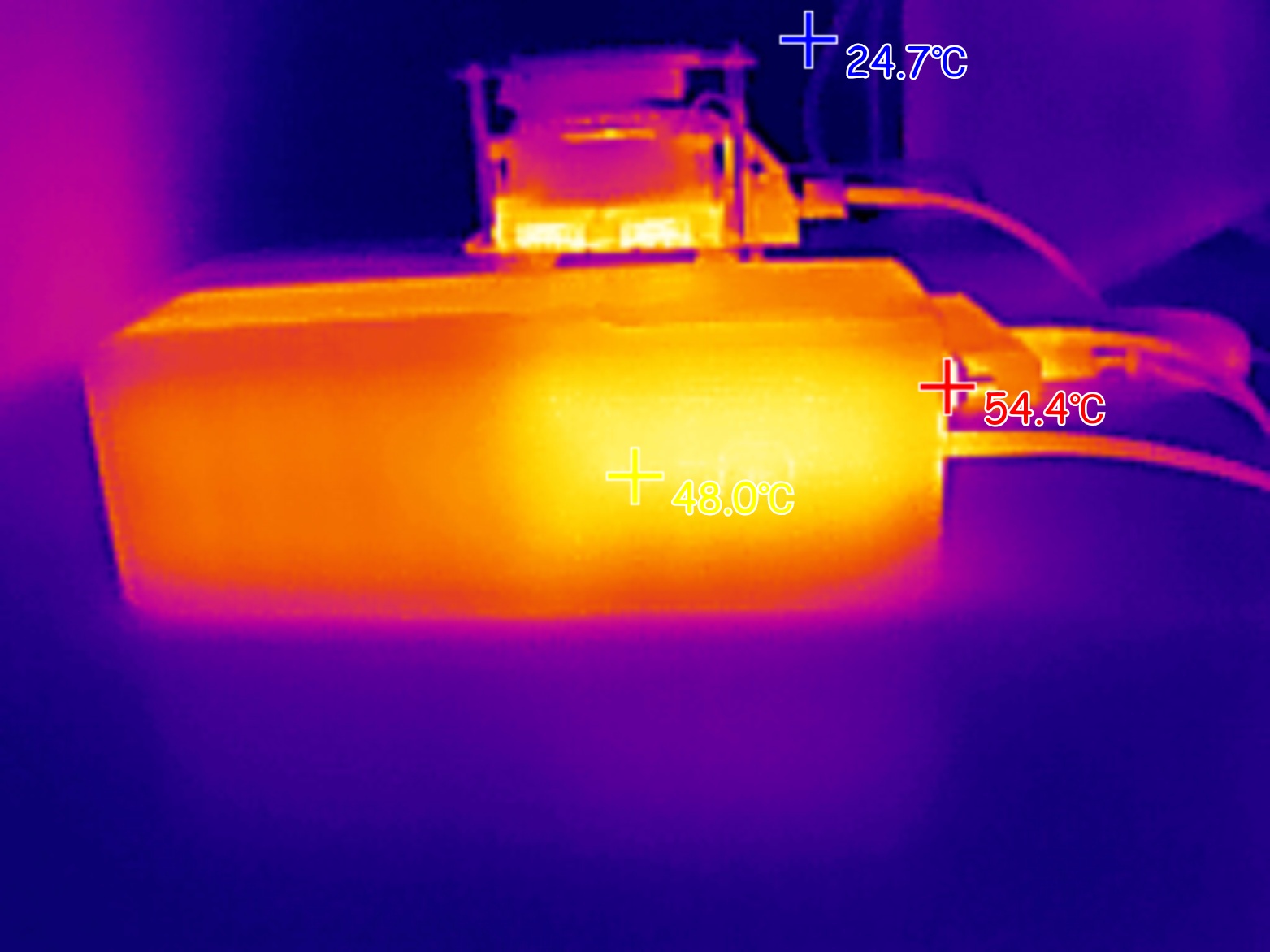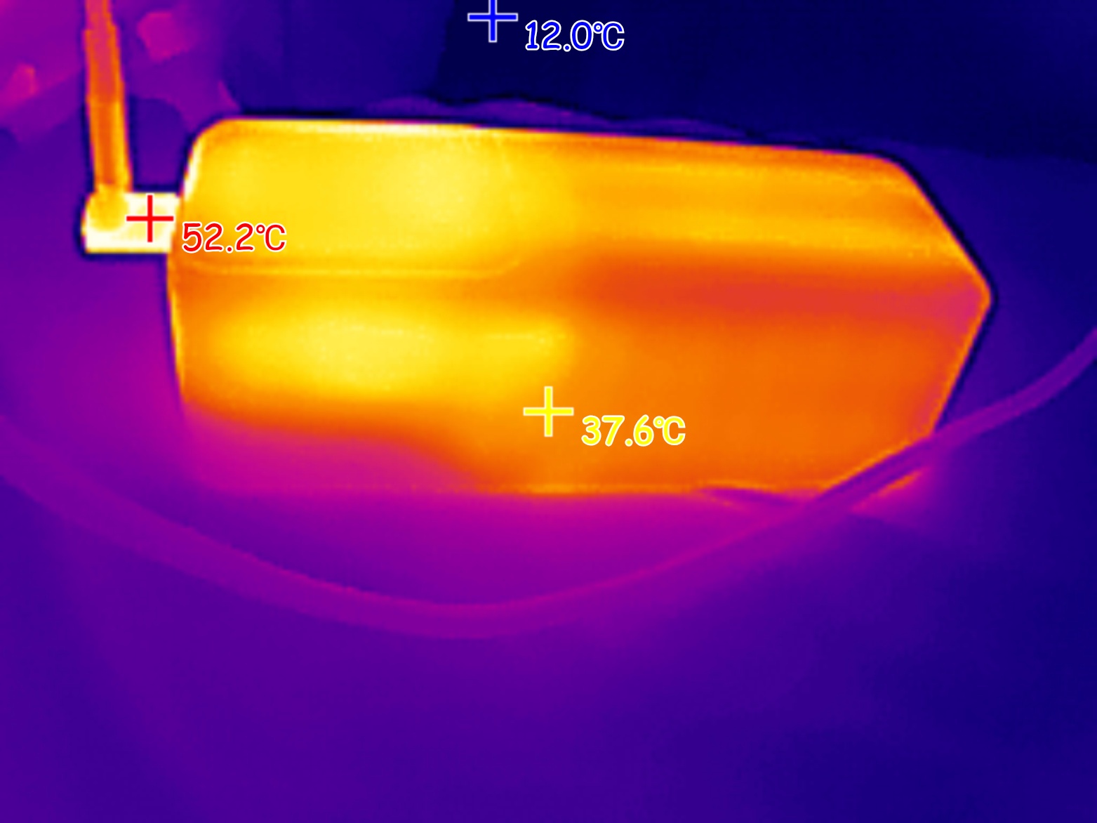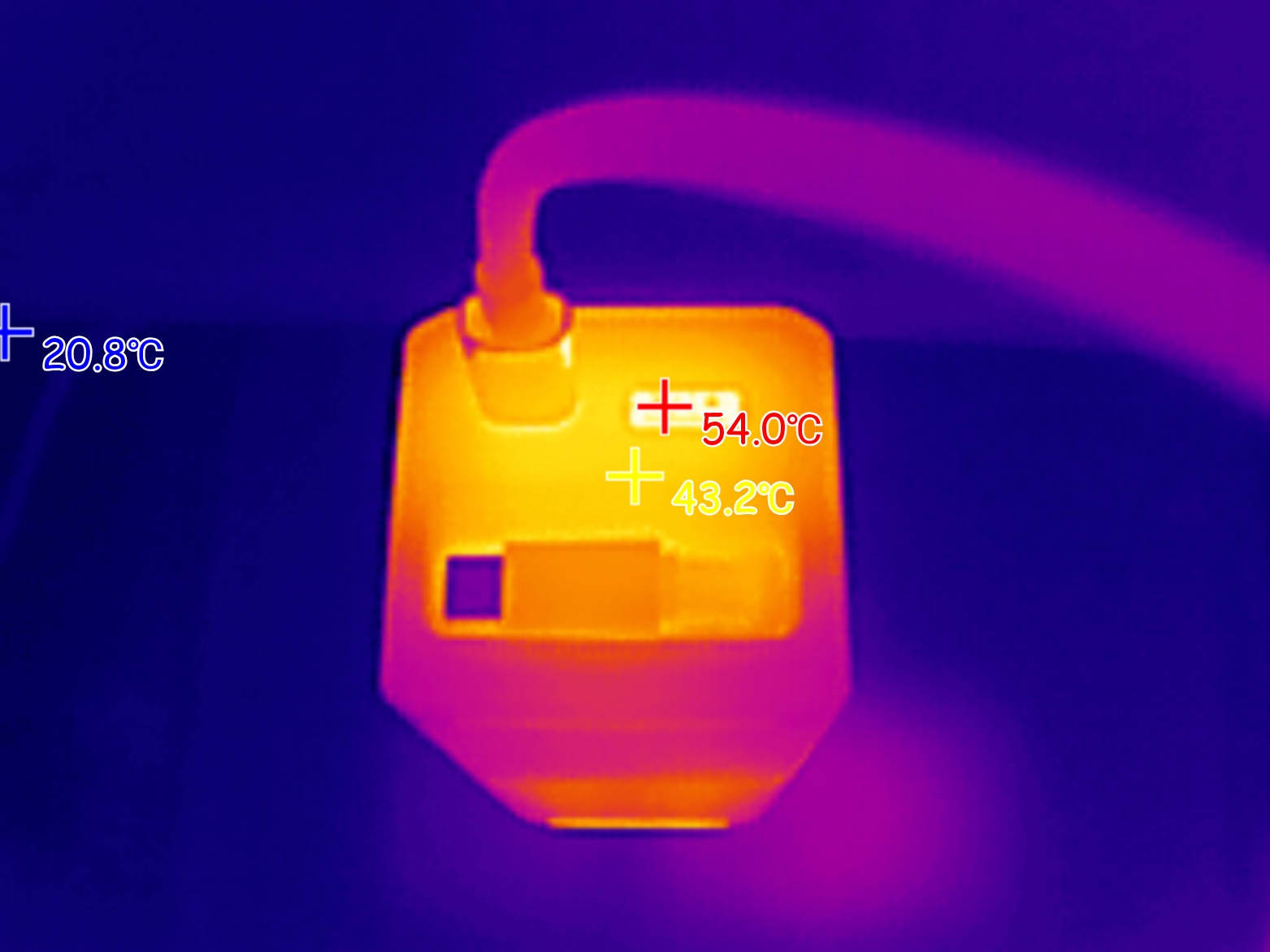 При подаче на ноутбук мощности 100W (ноутбук был подключен к USB-C порту пауэрбанка), максимальная температура корпуса пауэрбанка была зафиксирована на отметке 58 градусов. Внутри порта USB-A, который находится рядом с «нагруженным» портов, пиковая температура поднялась до 80 градусов.