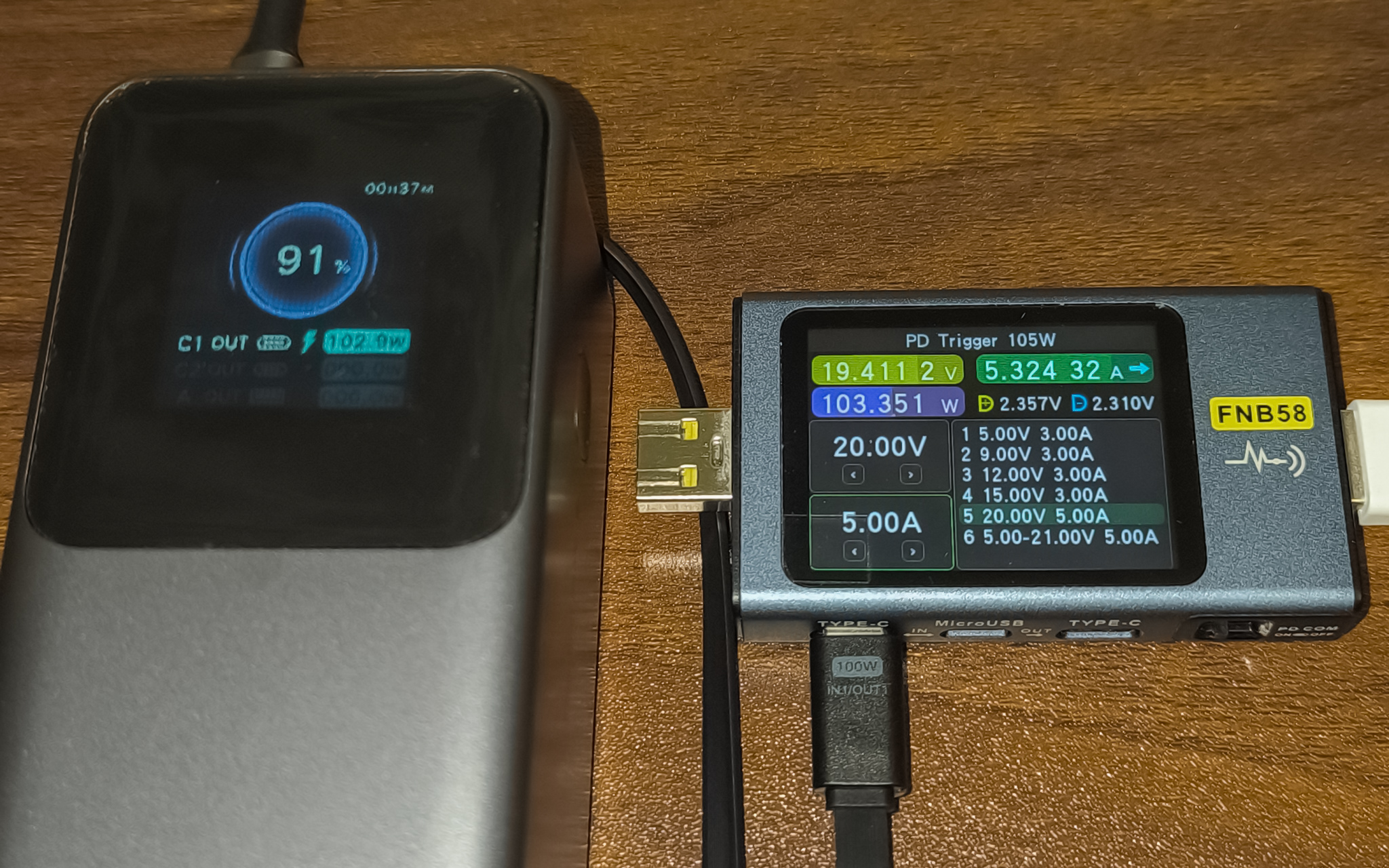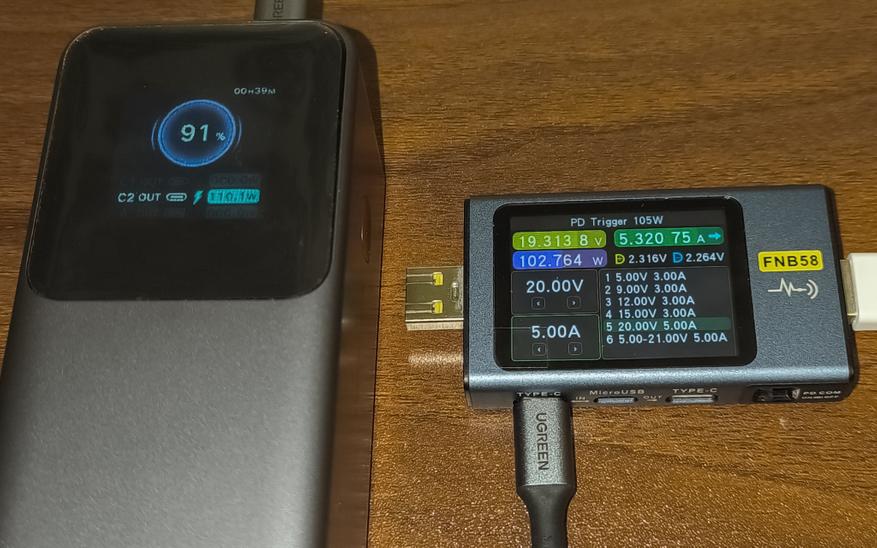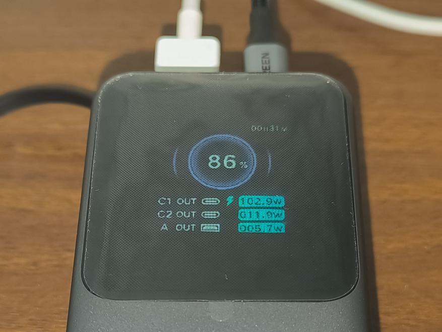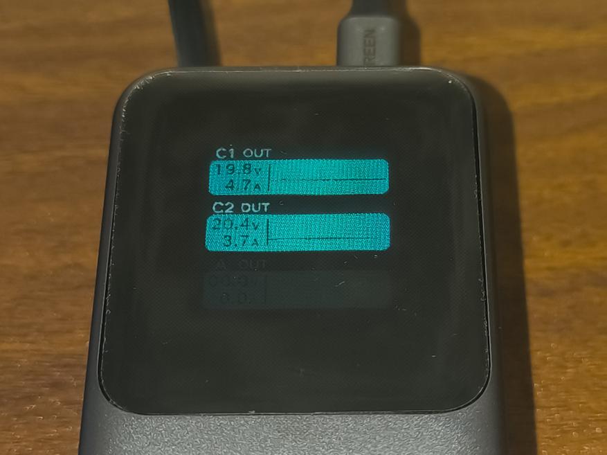 - USB-C Cable + USB-C + USB-A: 102.9W + 11.9W + 5.7W (суммарно 120.5W, по показаниям дисплея повербанка).