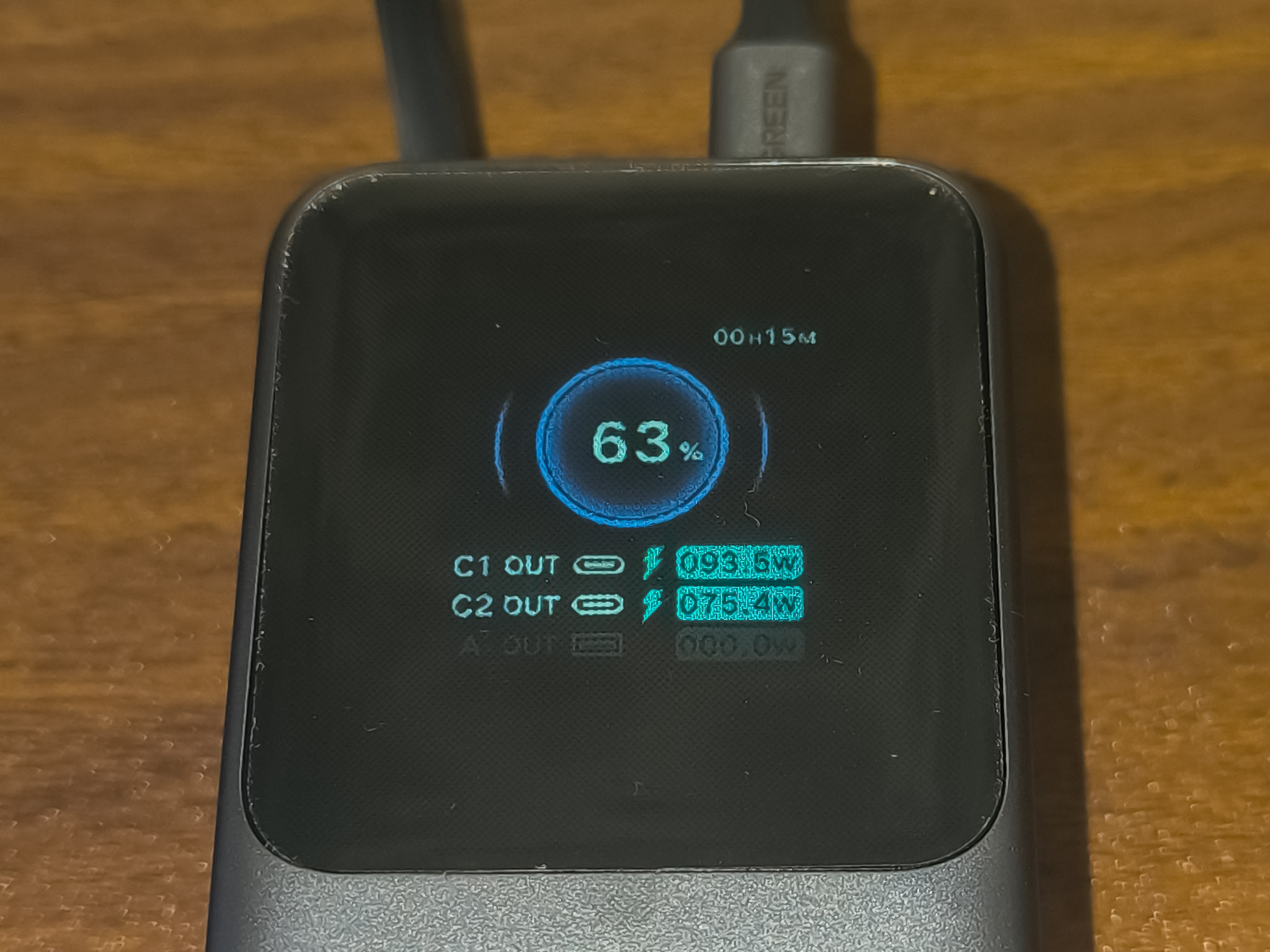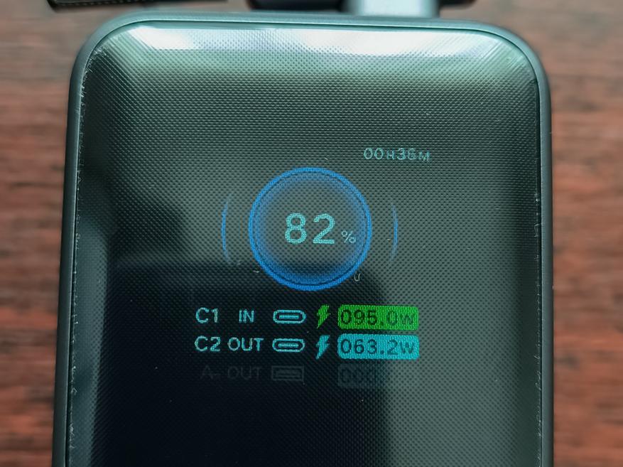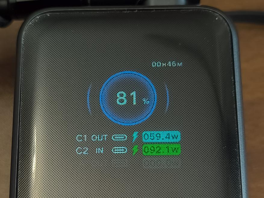 Если заряжать пауэрбанк от встроенного кабеля и подключить нагрузку к порту USB-C, то принимать пауэрбанк будет (по крайней мере поначалу) 95W, а отдавать 63W. Если заряжать пауэрбанк от встроенного порта, а нагрузку подключить к порту USB-C, то принимать пауэрбанк будет 59W, а отдавать 92W. При подключении/отключении «входа», «выход» перезагружается.