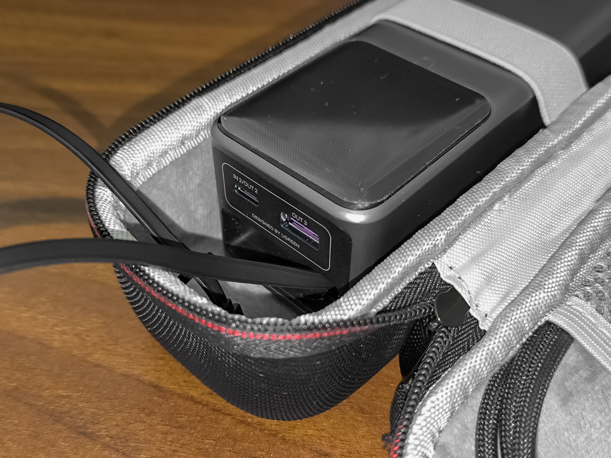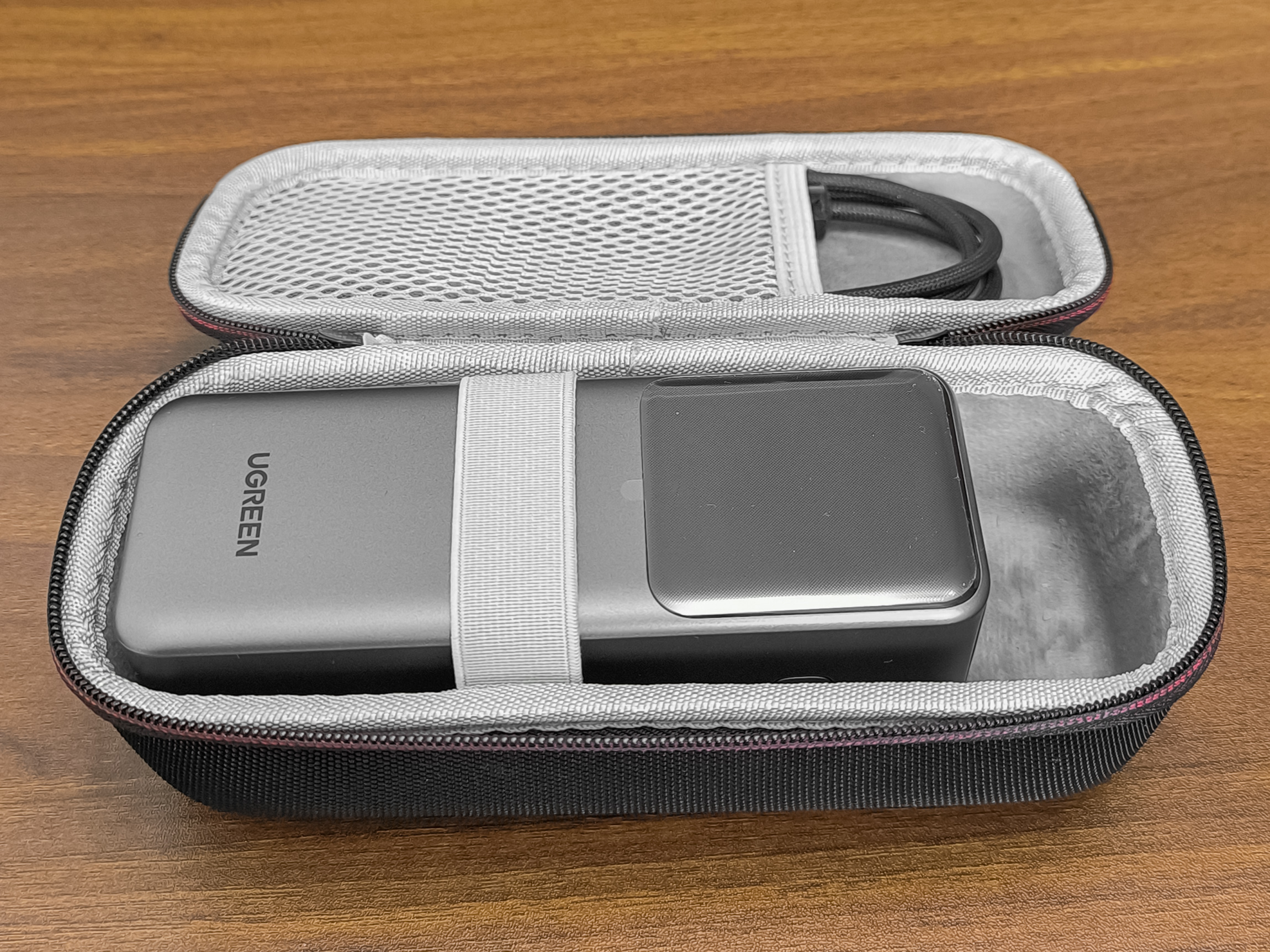 В продаже есть полужесткие чехлы, которые отлично подходят для обозреваемого внешнего аккумулятора Ugreen. Я использую чехол, который в магазине обозначен как чехол для Anker 737. Пауэрбанк Ugreen PB726 в него помещается с запасом по ширине. Этого запаса вполне достаточно для того, что бы можно было просунуть туда палец и вытянуть из пауэрбанка встроенный кабель. Заряжать пауэрбанк, и заряжать устройства от него, можно не вынимая пауэрбанк из чехла. Но следует обратить внимание то, что в этом случае пауэрбанк будет хуже охлаждаться. Если нужен более компактный чехол, то вроде как должен подойти похожий, но который обозначается как чехол для Anker Zolo.