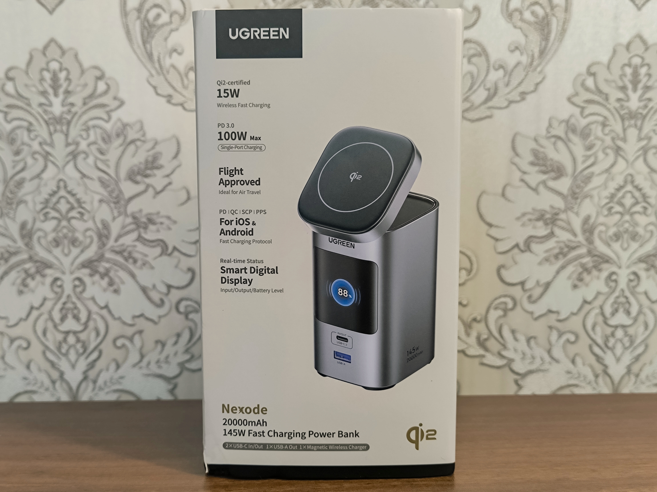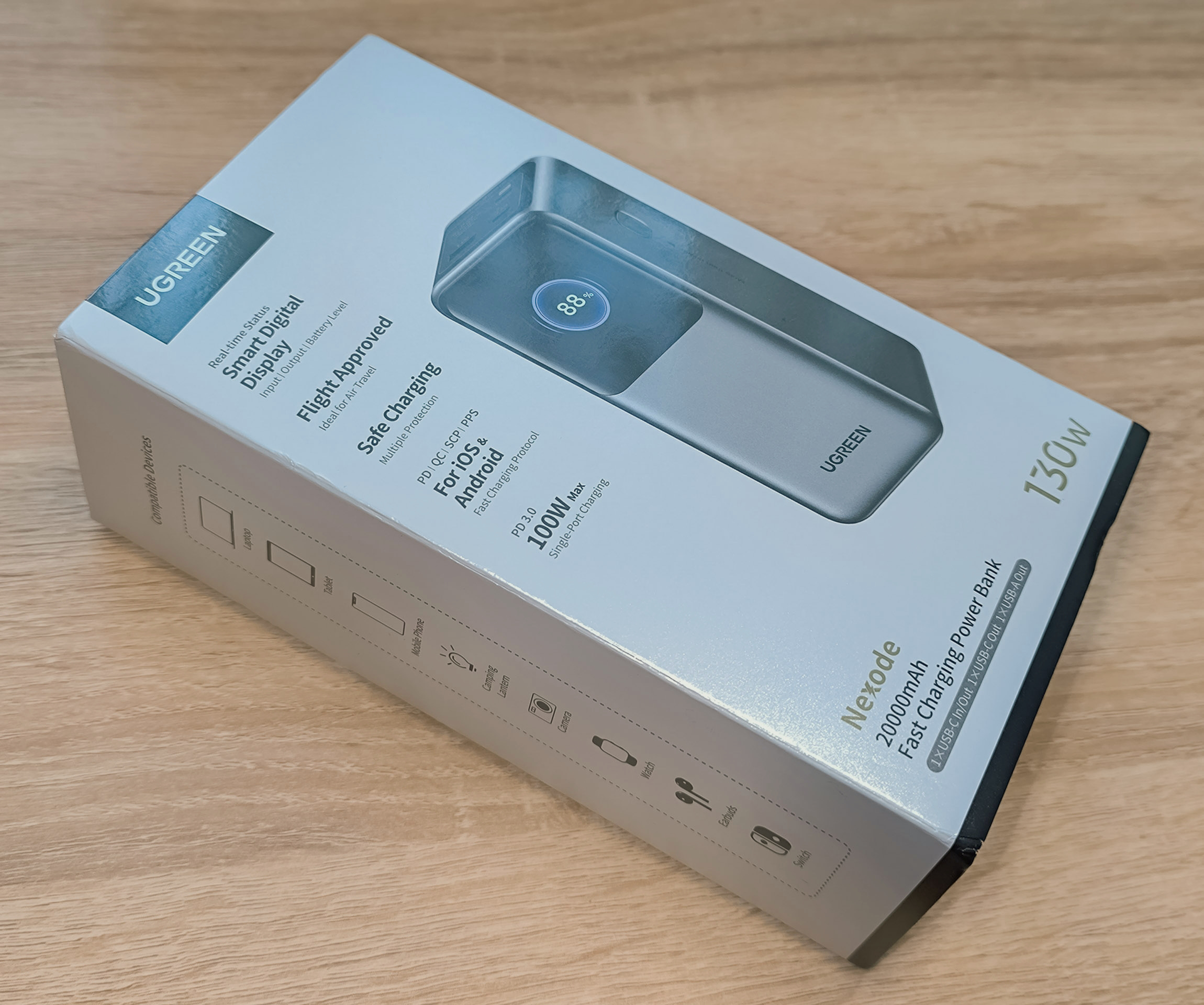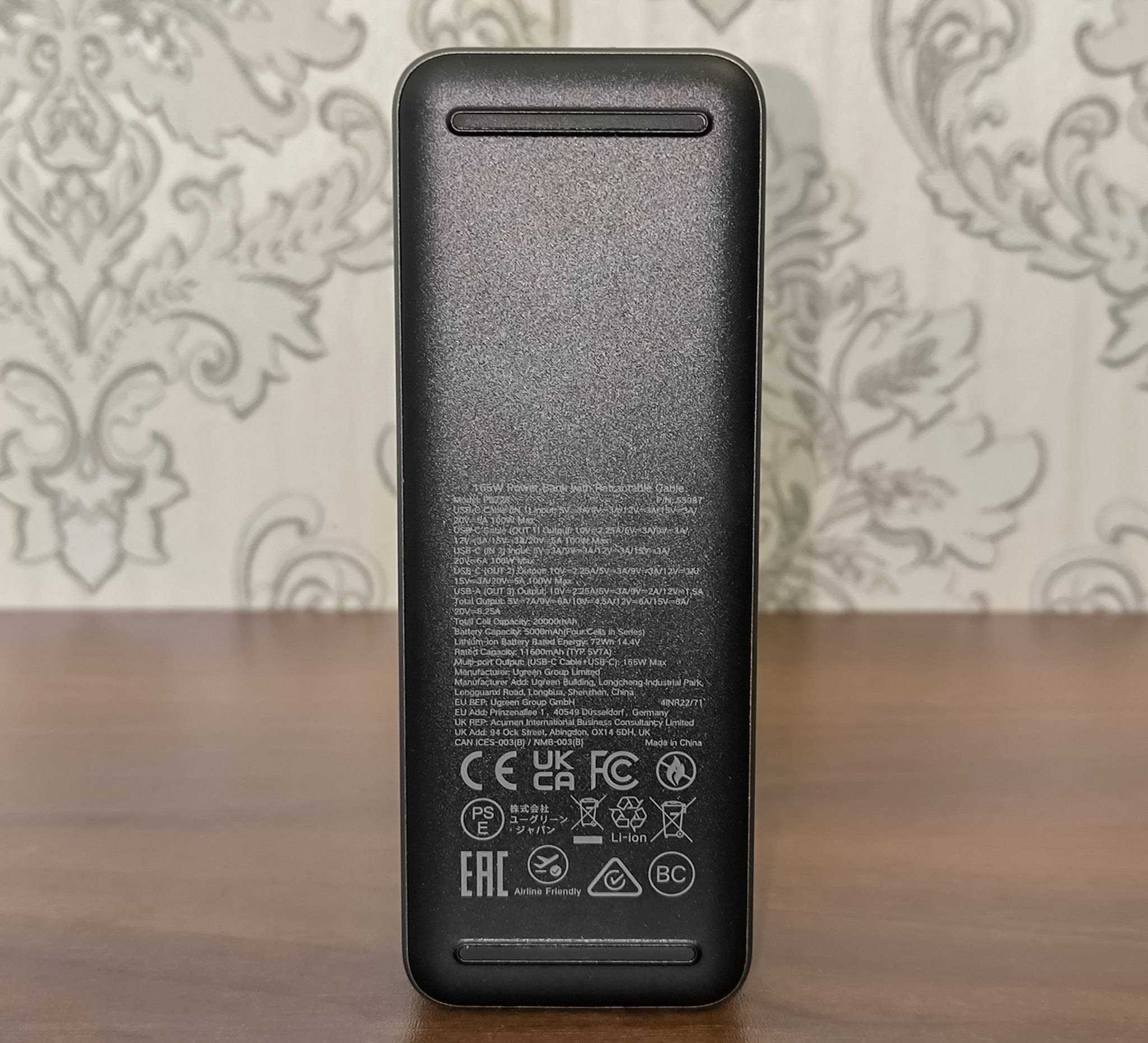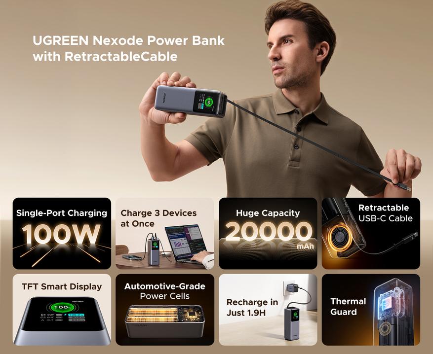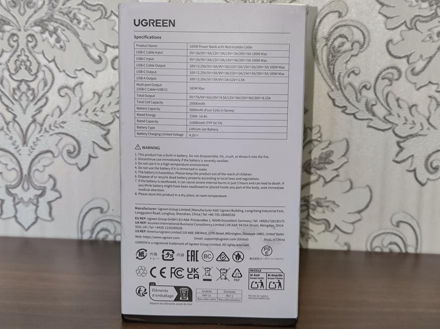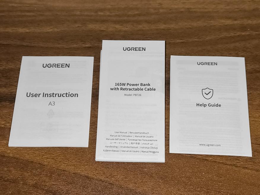 - Ugreen PB771: Оснащен аналогичным информационным дисплеем. Обладает ёмкостью 20000mAh, общей мощностью 145W и максимальной мощностью на одном порту 100W. Имеет два порта USB-C и один USB-A, а так же магнитную беспроводную зарядку 15W
