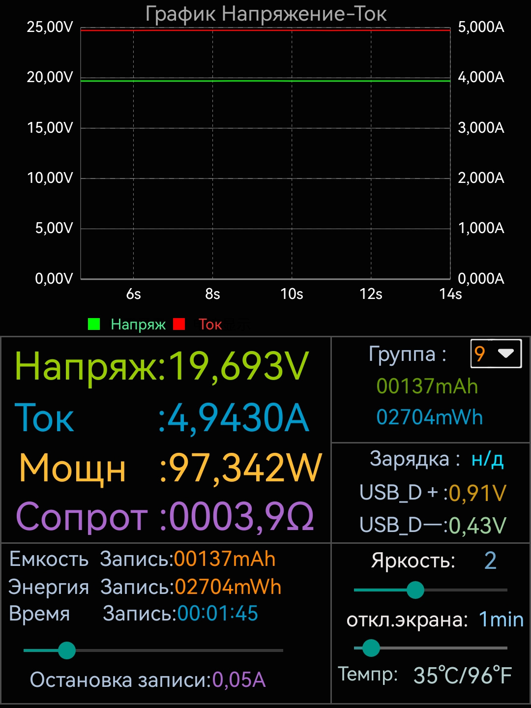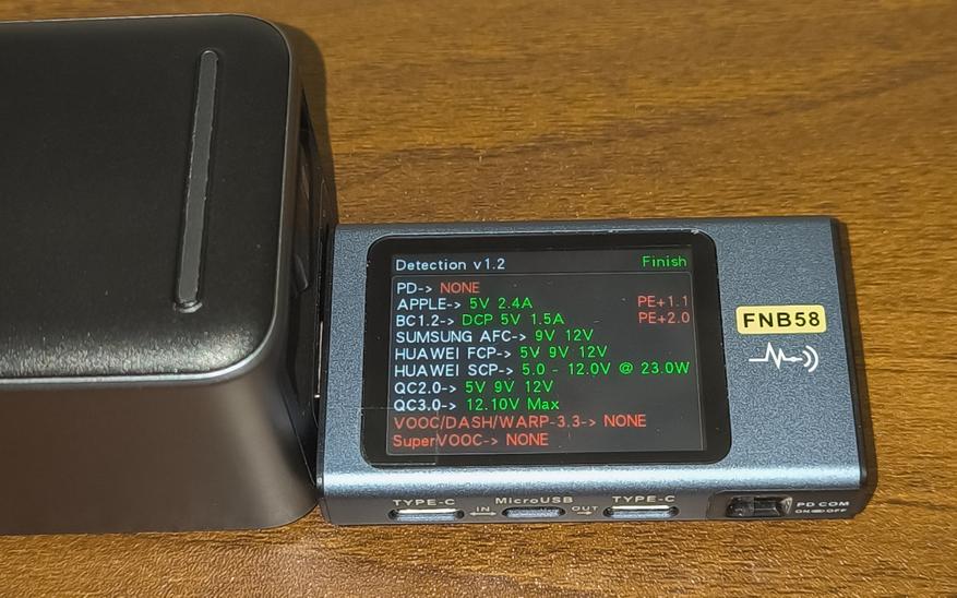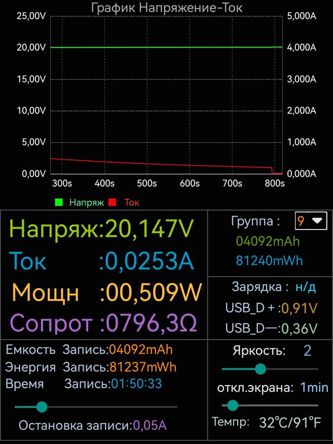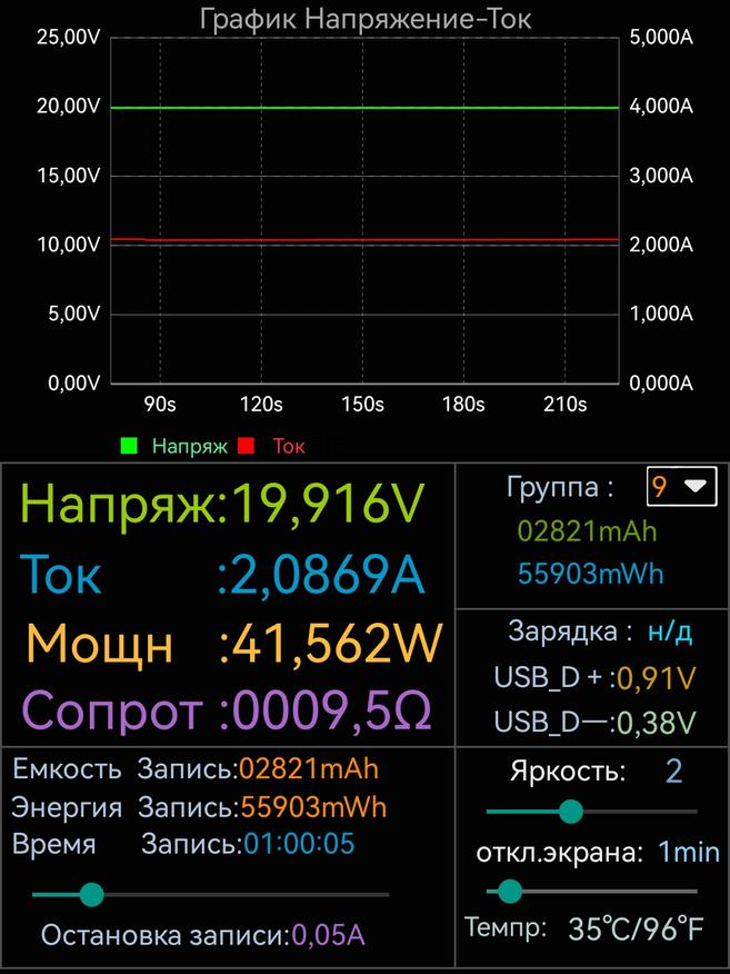 - Тест 3: В стресс-тесте (при нагрузке на одном выходе 93.5W, а на другом 75.4W) пауэрбанк суммарно выдавал 168W мощности с 65% заряда до 50%. Достигнув 50% заряда пауэрбанк ушел в защиту, и суммарная мощность снизилась до 89W (почти 45W на каждом из двух выходов).