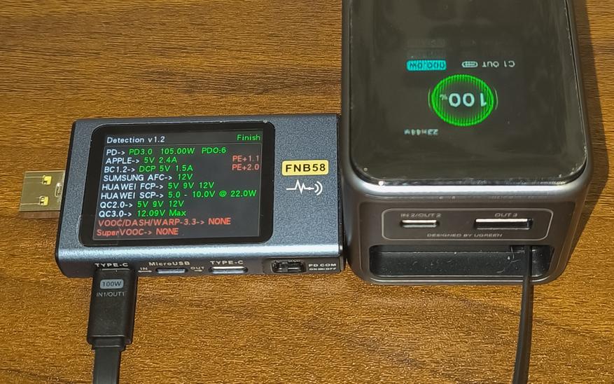 Заряжается пауэрбанк Ugreen PB726 мощностью почти 100W (это первый пауэрбанк со столь высокой мощностью зарядки, который попал мне в руки). Но 100W держатся не постоянно, а около 20 минут, после чего мощность падает до 41W. До 100% пауэрбанк заряжается за 1 час и 50 минут, потребляя при этом 81240mWh. За один час зарядки пауэрбанк потребляет 55900mWh, а за полчаса 37mWh. Подключив электронную нагрузку, пауэрбанк отдал 61880mWh.