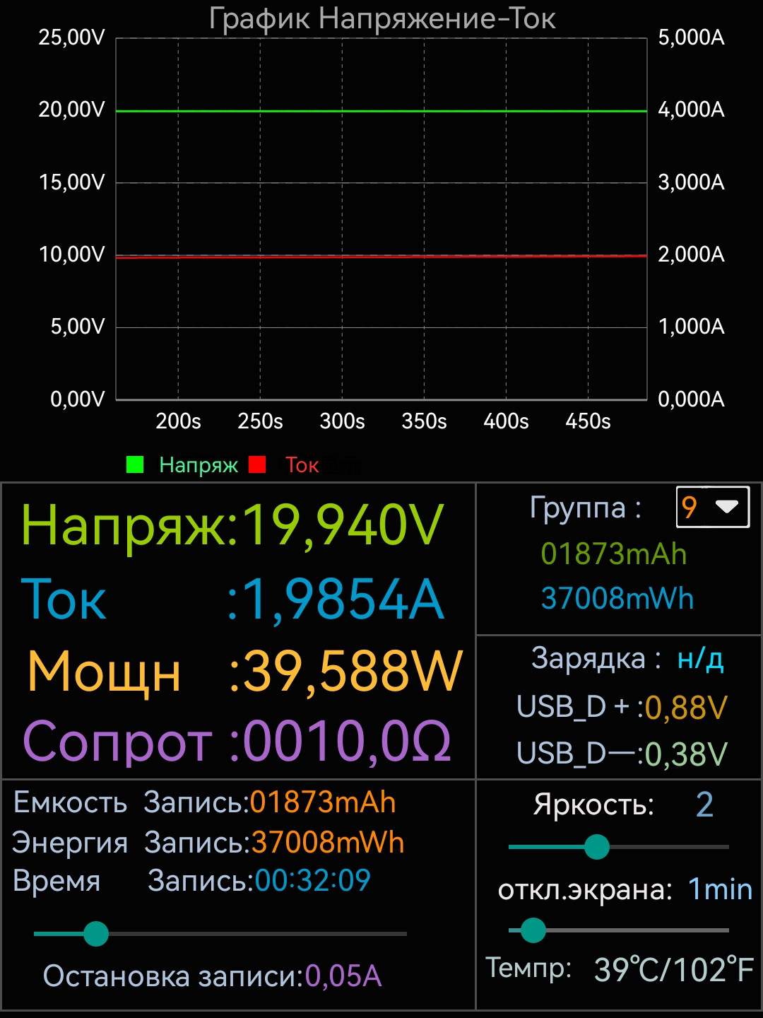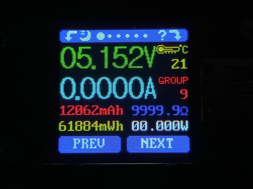 Главное окно информационного дисплея отображает: уровень заряда в процентах, оставшееся время разряда в часах и минутах, а так же нагрузку в ваттах каждого из трёх проводных портов. Если порт отдает ток, то пиктограмма мощности окрашивается в синий цвет и появляется уведомление IN. Если порт принимает ток, то пиктограмма мощности окрашивается в зелёный цвет и появляется уведомление OUT. Если включить зарядку малым током, то в левом верхнем углу экрана появится значок в виде перевернутий букви V. На втором окне экрана отображается кривая мощности, а также показатели напряжения и силы тока каждого из портов.
