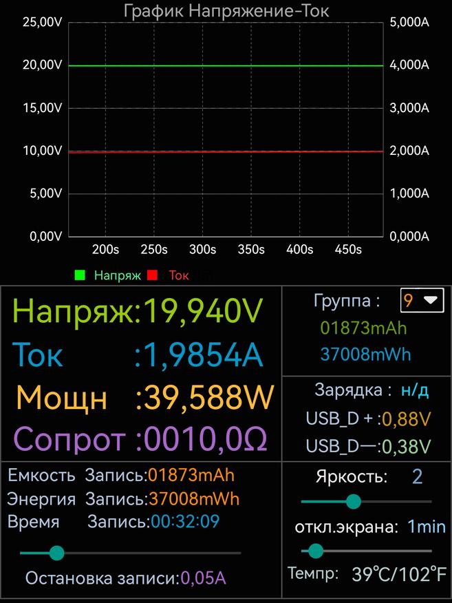 - Тест 2: Подключил электронную нагрузку 100W к выходному кабелю пауэрбанка. Пауэрбанк выдавал 100W мощности со 100% заряда до 33%, после чего выходная мощность снизилась до 43.7W.